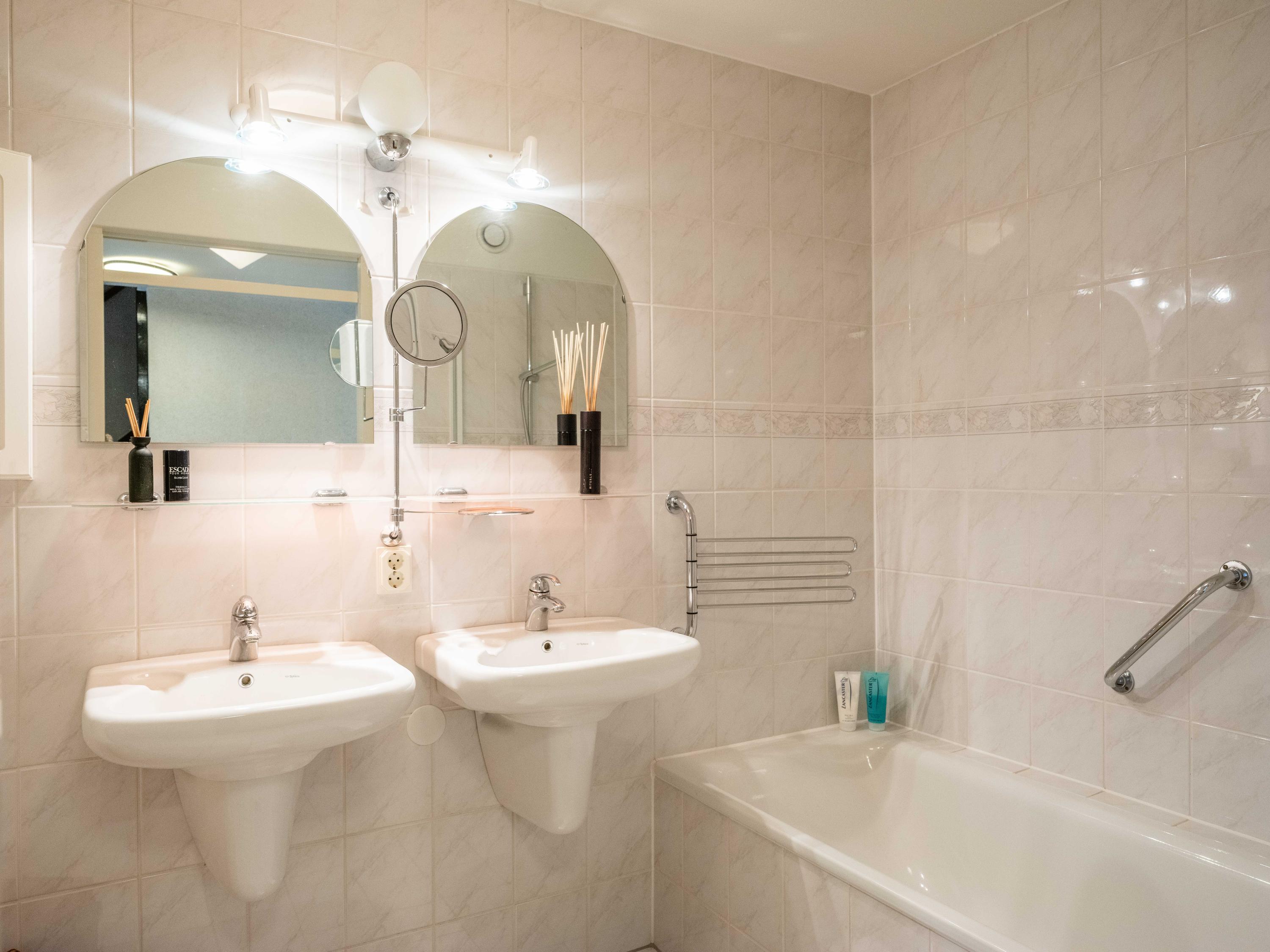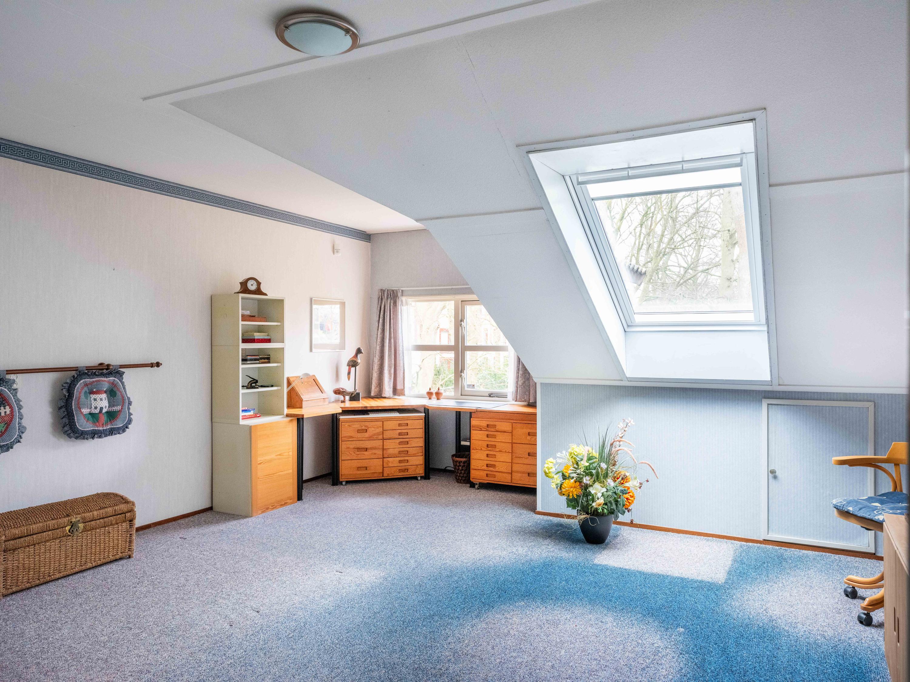 Op de begane grond vindt u verder een ruime kamer aan de tuinzijde, te gebruiken als kantoor, maar ook uitstekend geschikt als slaapkamer. De badkamer op de begane grond is voorzien van een ligbad met douche, dubbele wastafel en toilet.