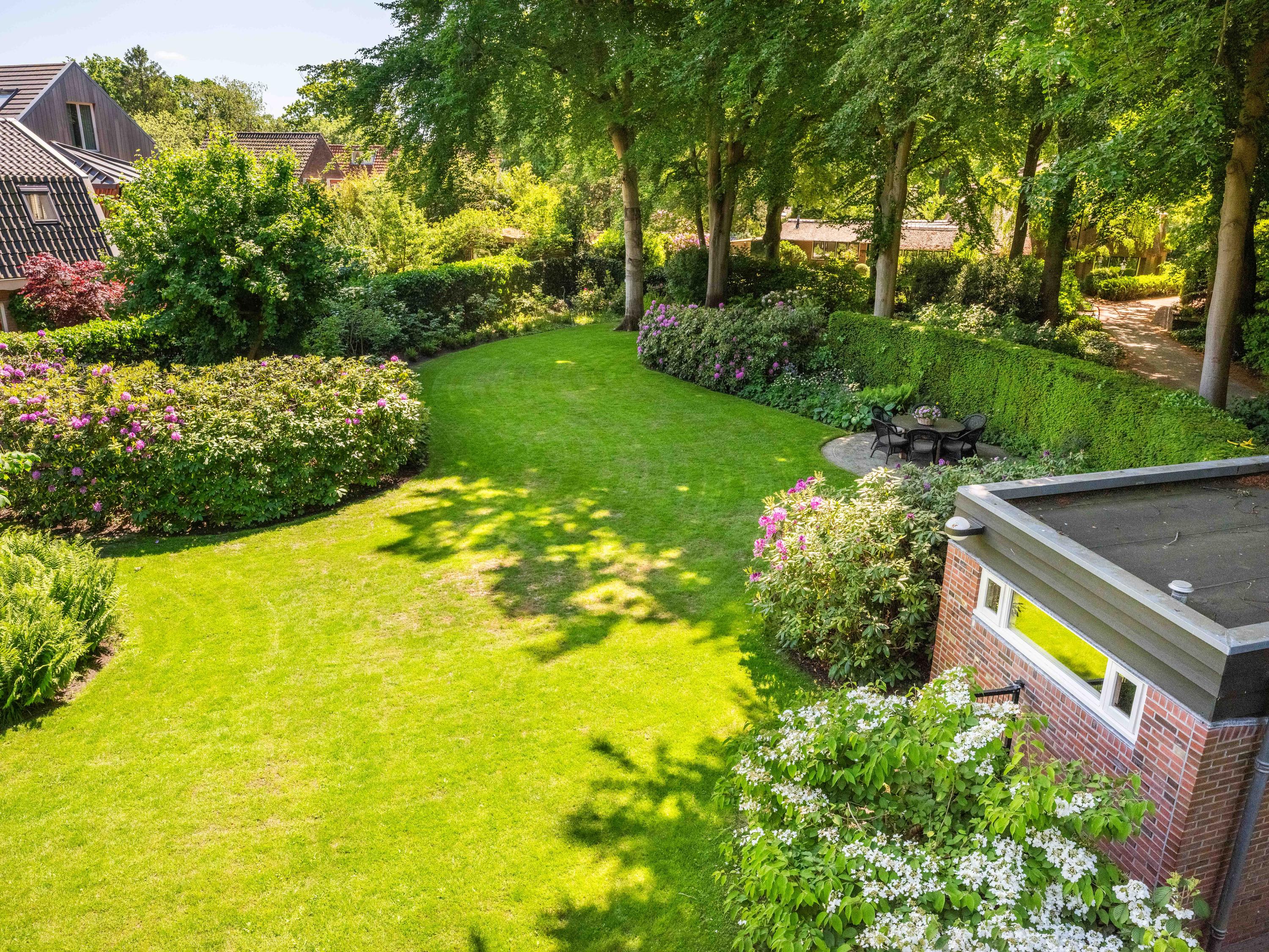 De prachtige parktuin met ligusterhagen, bloempartijen en imposante bomen is rondom de villa gelegen. Naast de villa staat een in dezelfde stijl gebouwde en volledig geïsoleerde schuur voor bijvoorbeeld de fiets, tuinspullen, etc. Hier treft men ook de opvang voor het centrale stofzuigersysteem en de pomp en bewateringsinstallatie voor de tuin.