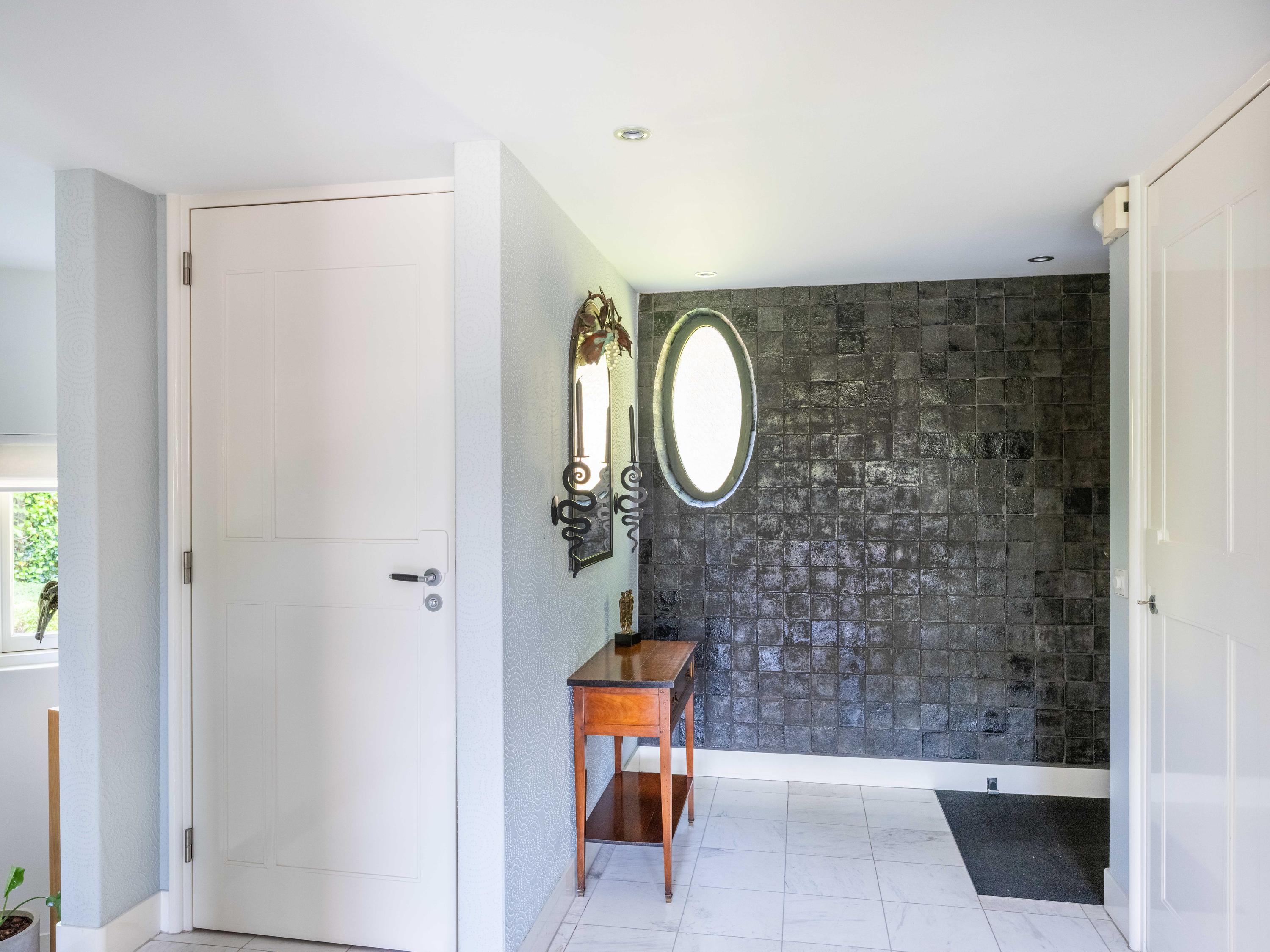 Een kronkelig paadje tussen mooi gevormde ligusterhagen loopt naar de verscholen voordeur. Via de entree lopen we de hal binnen met een garderobe, de trap naar de verdieping en een toilet.