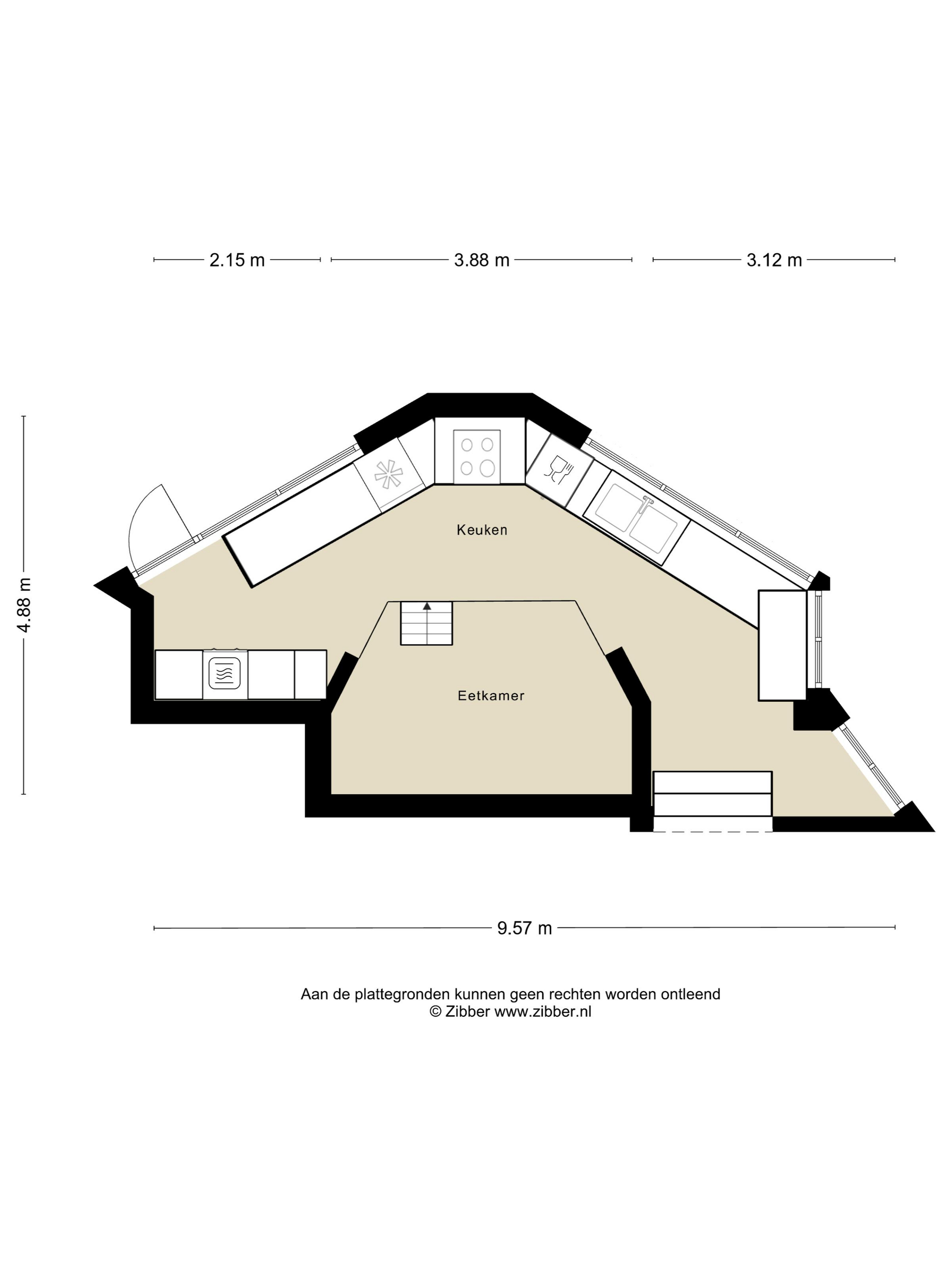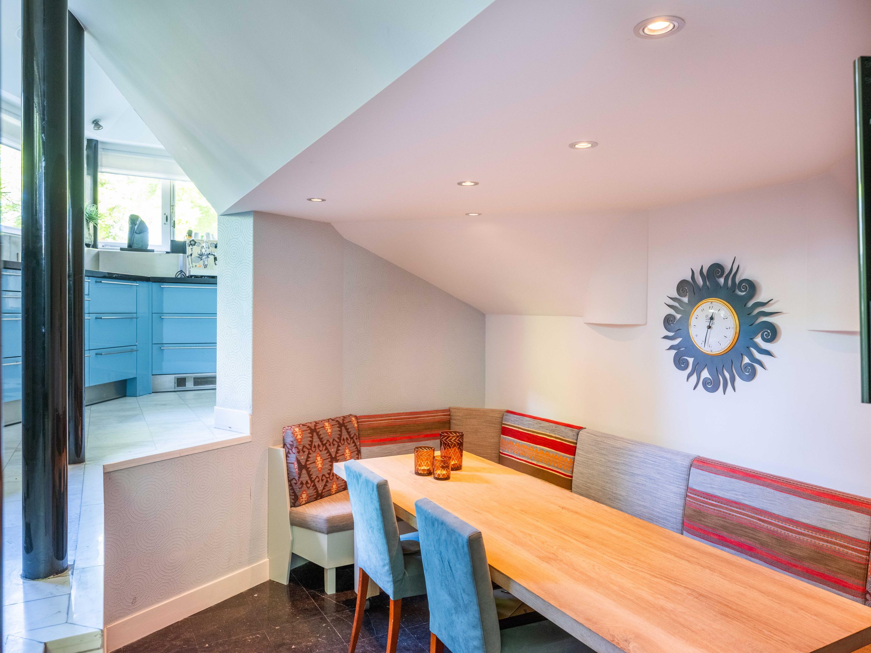 Via de hal bereiken we de woonkeuken voorzien van moderne inbouwapparatuur. Door de vorm, een halve zeshoek, is deze speels en bijzonder van opzet, dit ook door het eetgedeelte, met ruimte voor een grote tafel, dat een niveau lager is gelegen.