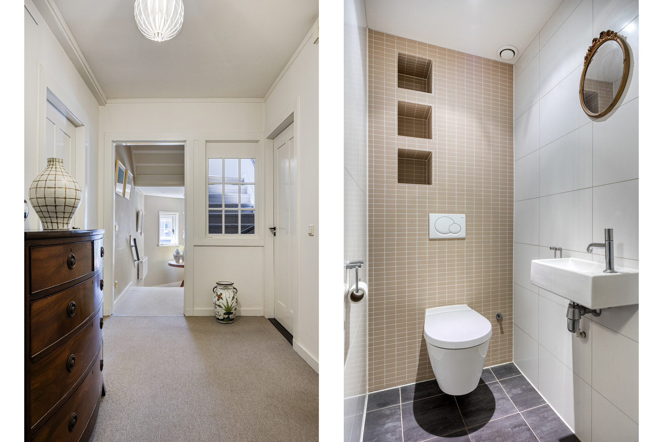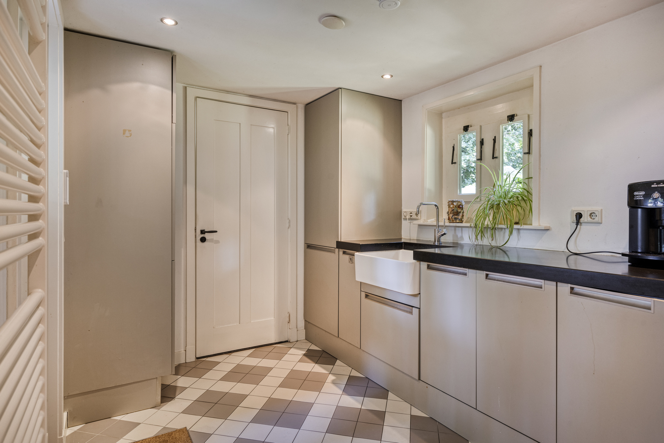 Aansluitend bevindt zich de praktische bijkeuken met vloerverwarming, wasmachine- en drogeraansluiting en een douche met toilet en fontein. Vanuit de keuken bereikt u de sfeervolle TV-kamer met massief eiken vloer, ingebouwde kasten en grote raampartijen met isolerend monumentenglas.