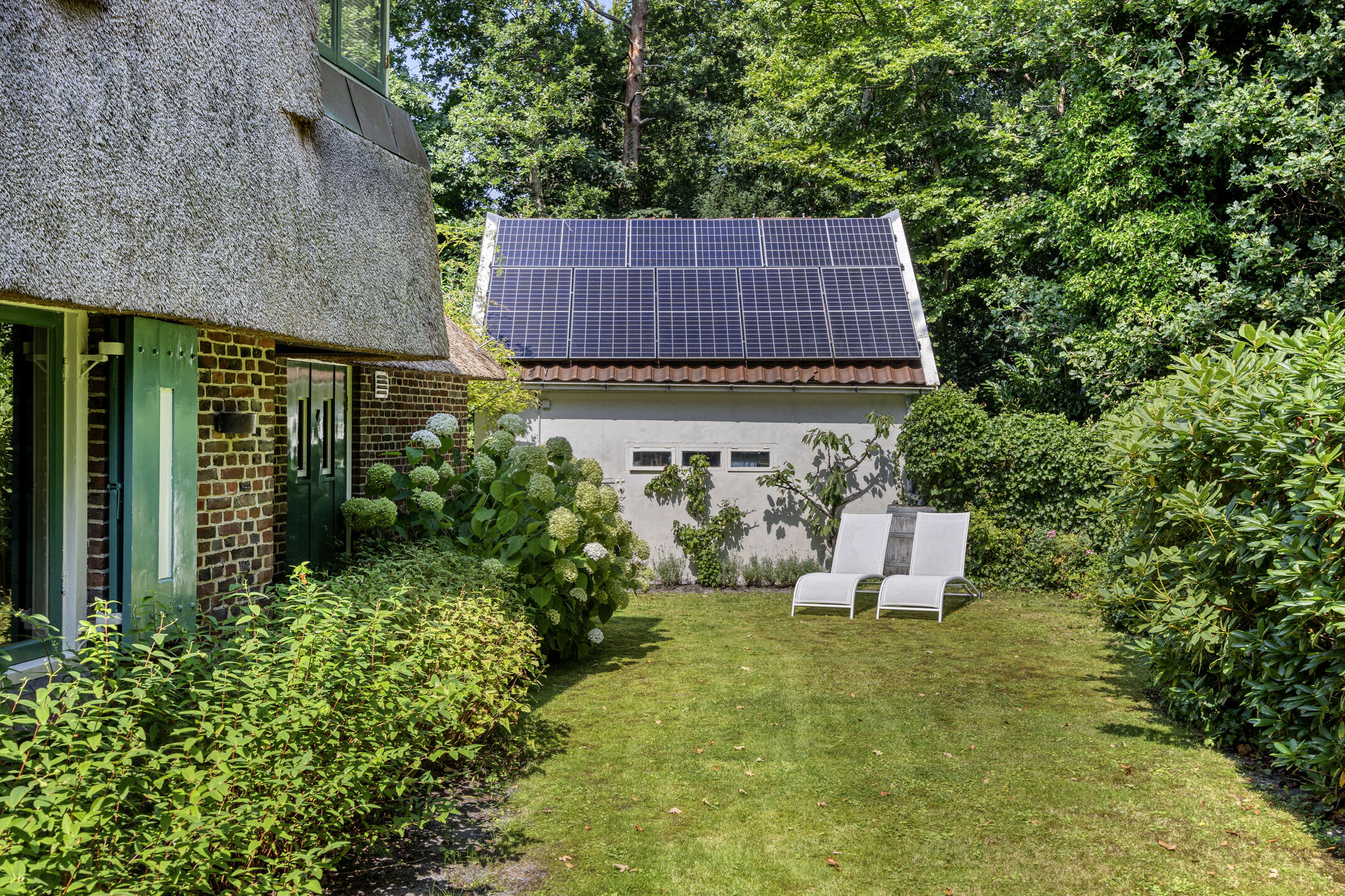 Daarnaast is er een ruime garage/schuur met 8 zonnepanelen op het dak. Een bronpomp zorgt voor efficiënte beregening van de tuin met grondwater.
