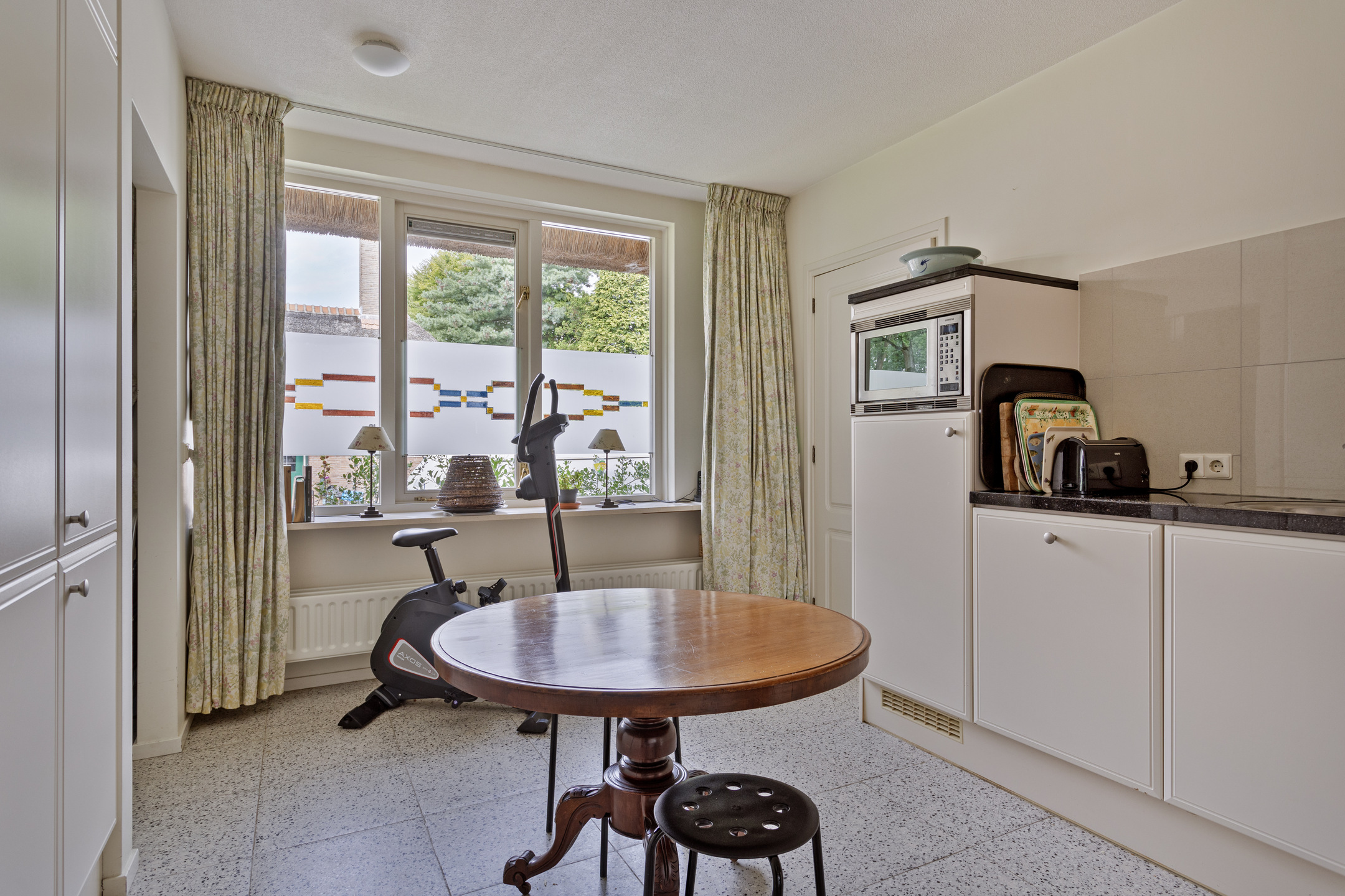 bijkeuken met keukenblok vv. inbouwkoeler en een spoelbak, wandafwerking tegels en stucwerk, tegelvloer, plafond afgewerkt met spuitwerk;