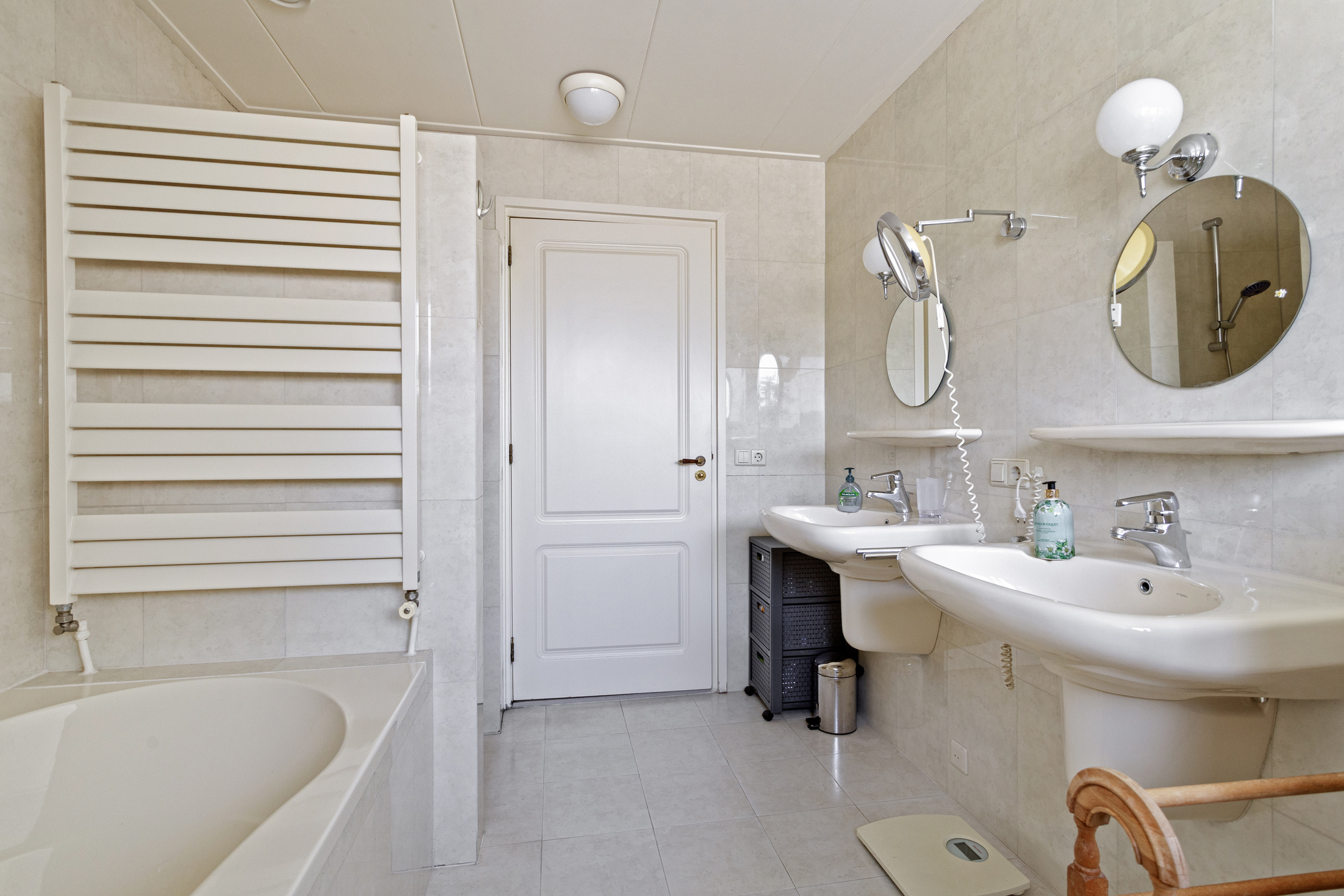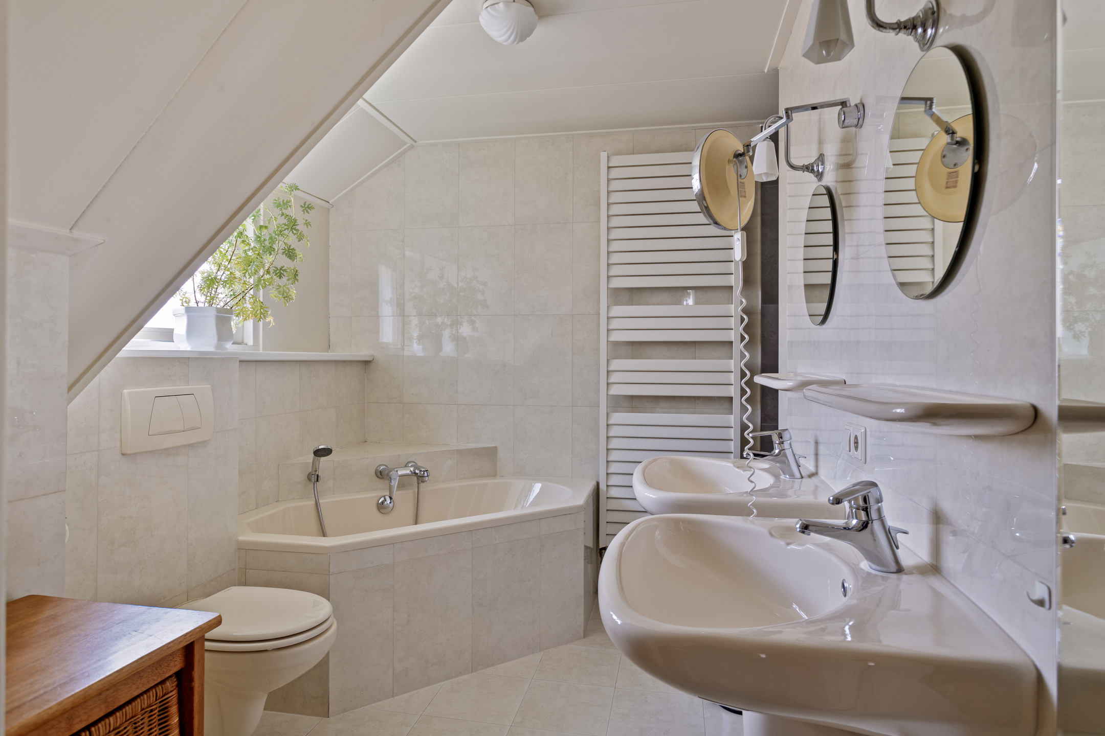 badkamer en-suite t.b.v. de hoofdslaapkamer, voorzien van een ligbad, inloopdouche (2023), wandcloset, dubbele wastafel, designradiator en een dakkapel;
