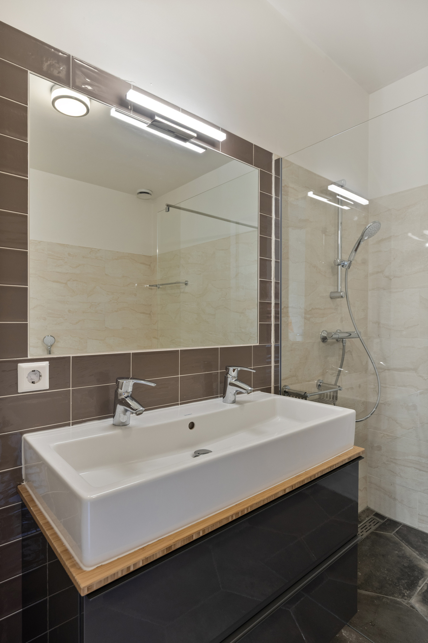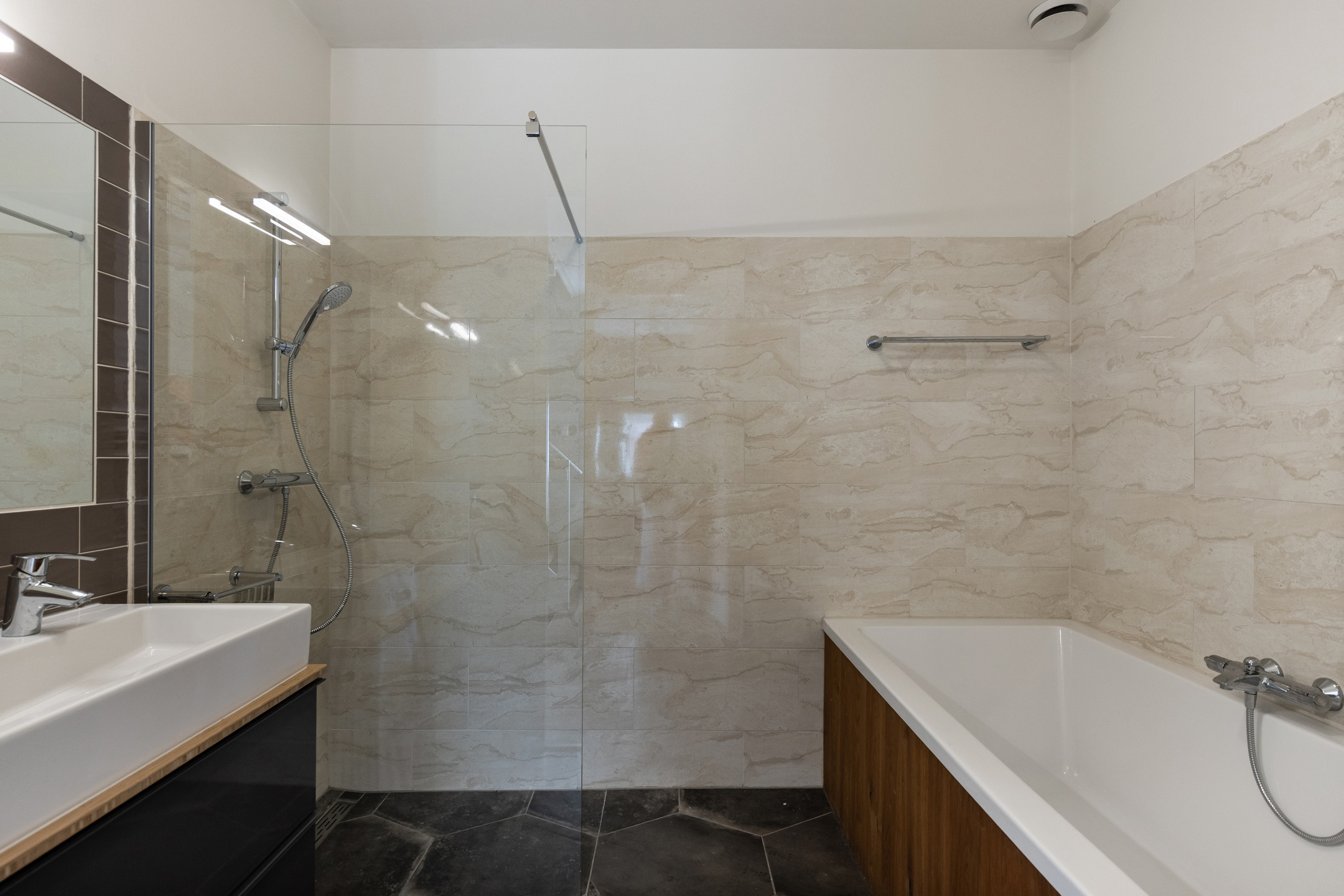 Moderne badkamer en is voorzien van een inloopdouche, wastafel met meubel en een ligbad.