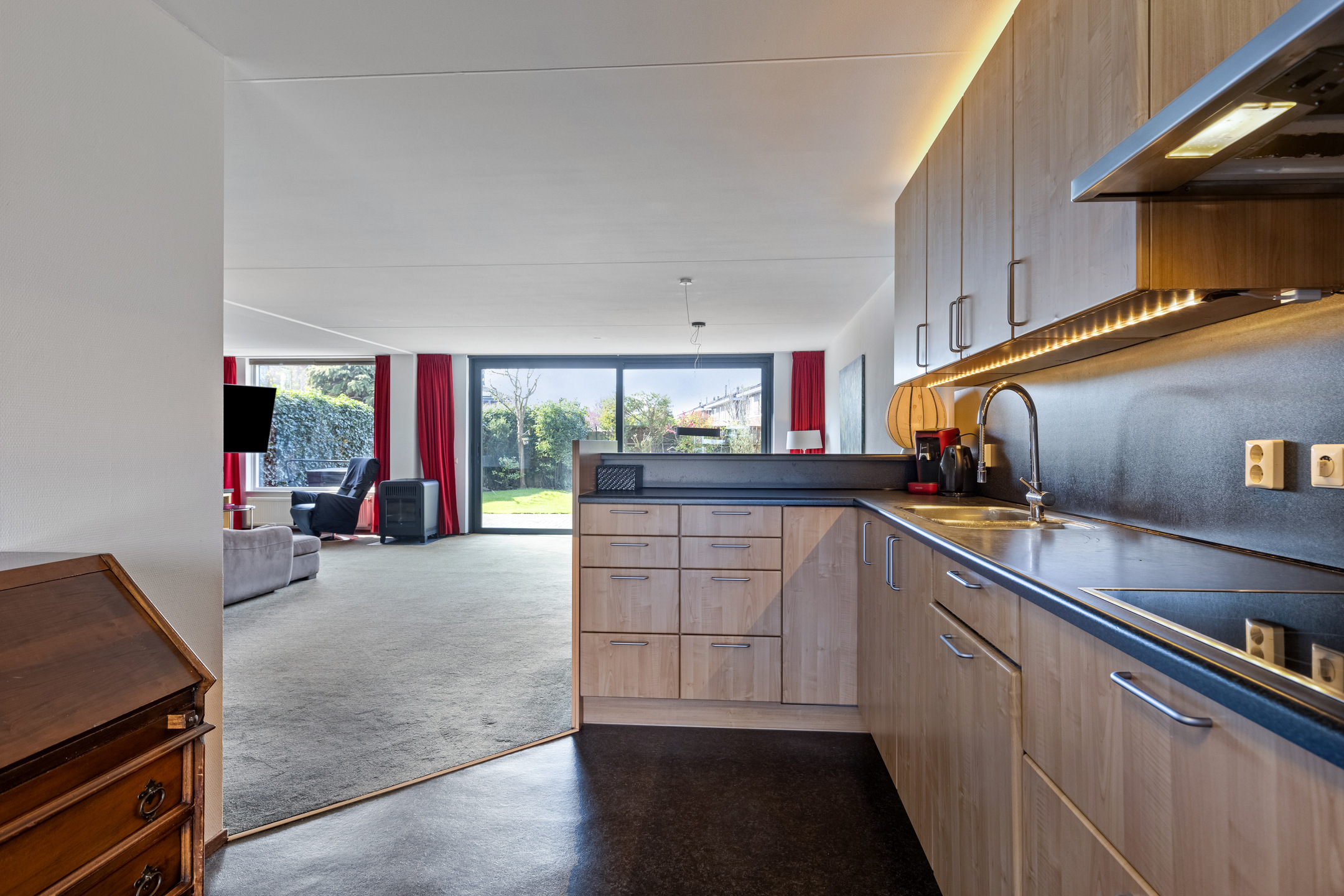Aan de voorkant bevindt zich de open keuken met veel opbergruimte en is van alle gemakken voorzien, zoals een spoelbak met mengkraan, keramische kookplaat, afzuigkap, koelkast, vriezer en vaatwasser.