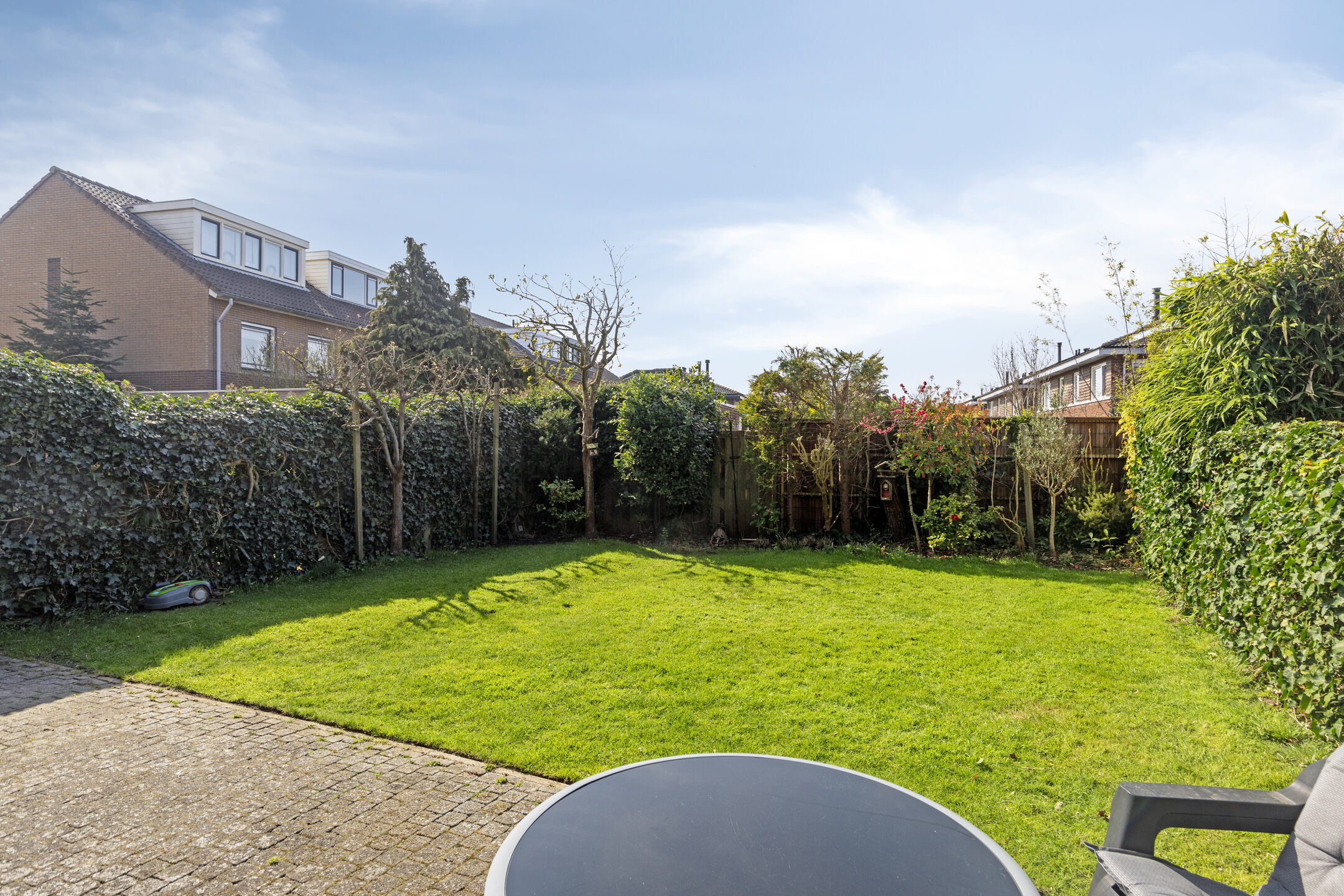 De fraai aangelegde achtertuin is een fijne plek waar je door de ligging op het zuiden heerlijk van het middag- en het avondzonnetje kunt genieten. De achtertuin is voorzien van een elektrisch zonnescherm.