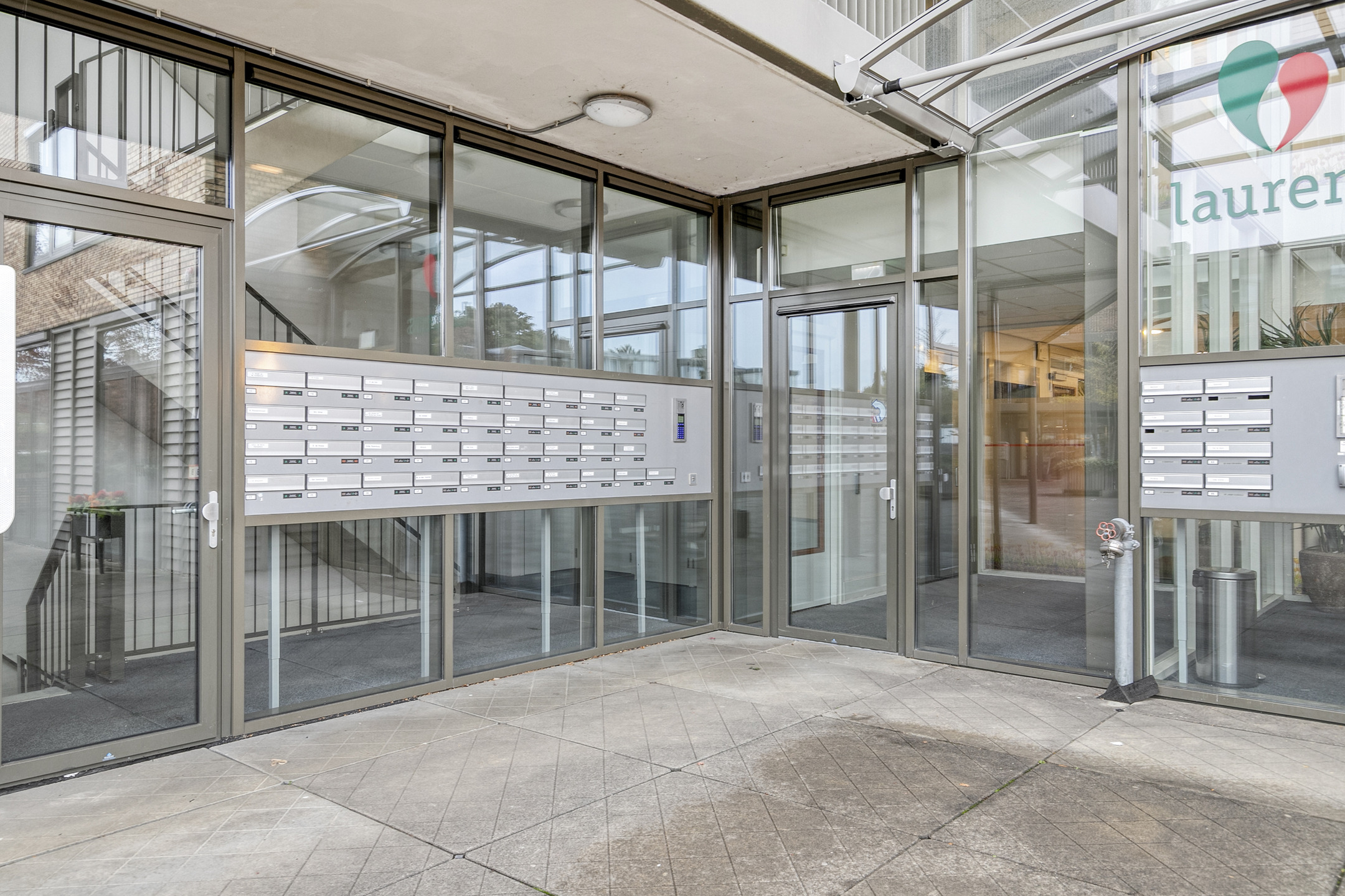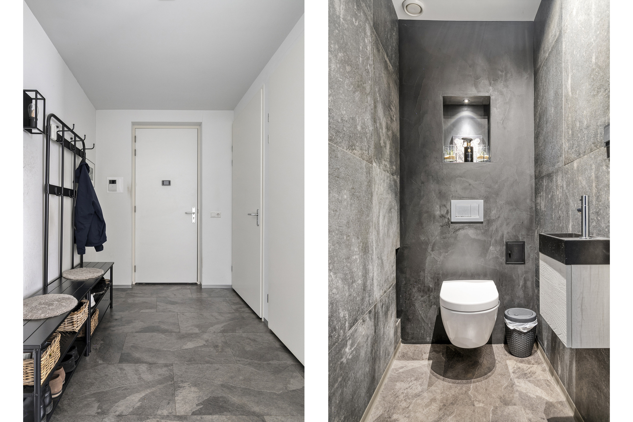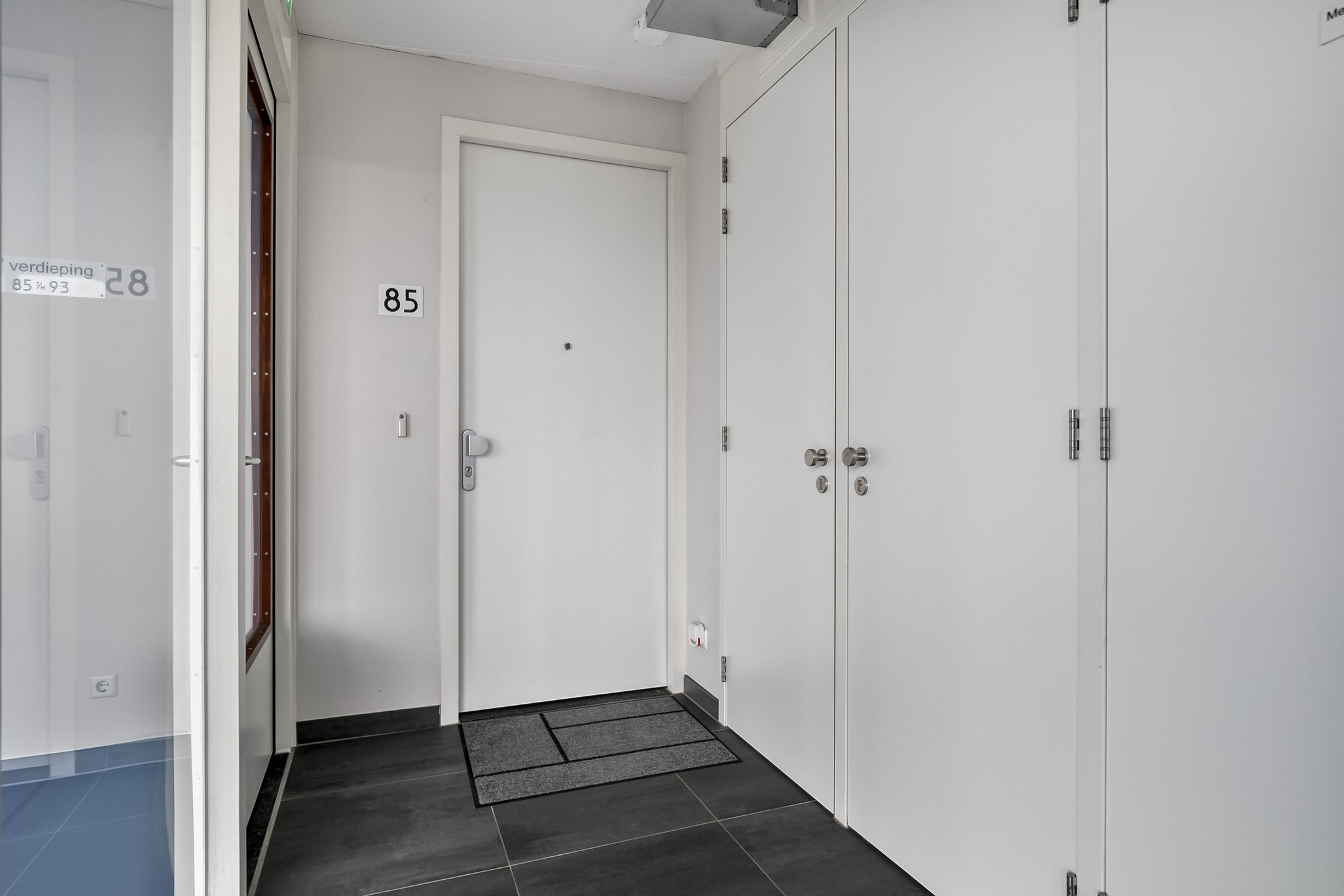 Afgesloten hoofdentree met lift naar de 4e verdieping. Inpandige toegang tot het penthouse, ruime hal met toilet, wasruimte, toegang tot alle vertrekken en een grote inbouwkast.