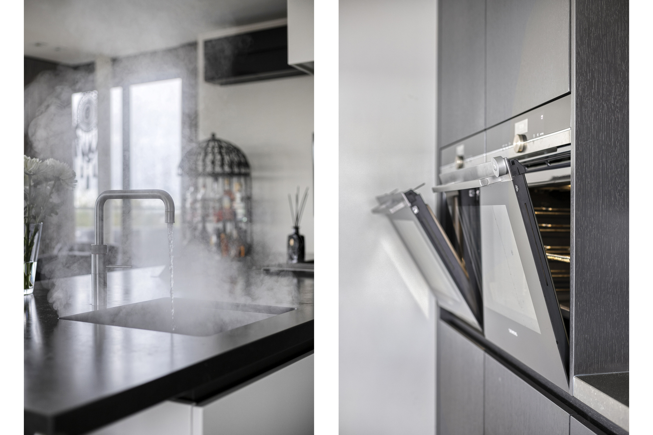 De moderne open keuken met kookeiland is voorzien van diverse luxe inbouwapparatuur, waaronder een Quooker, gasfornuis, afzuigkap, combimagnetron, hete-luchtoven met stoomfunctie, koel-vriescombinatie en vaatwasser.