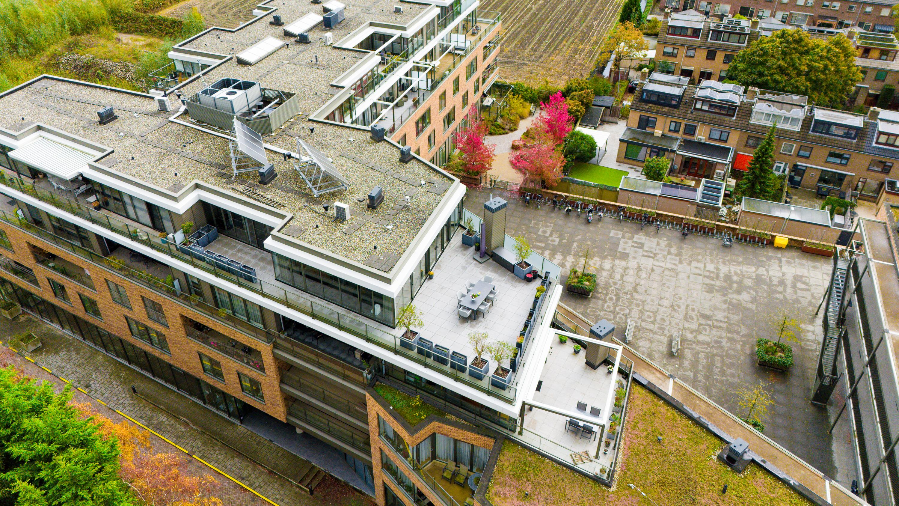 De gehele verdieping is voorzien van parketlaminaat met vloerverwarming en airconditioning. De royale living is ingedeeld in twee zitgedeeltes en een eetgedeelte, met grote raampartijen die zorgen voor veel licht. Via een schuifpui is het zeer ruime dakterras toegankelijk, gelegen op het zuiden en van dezelfde grootte als de woning zelf.