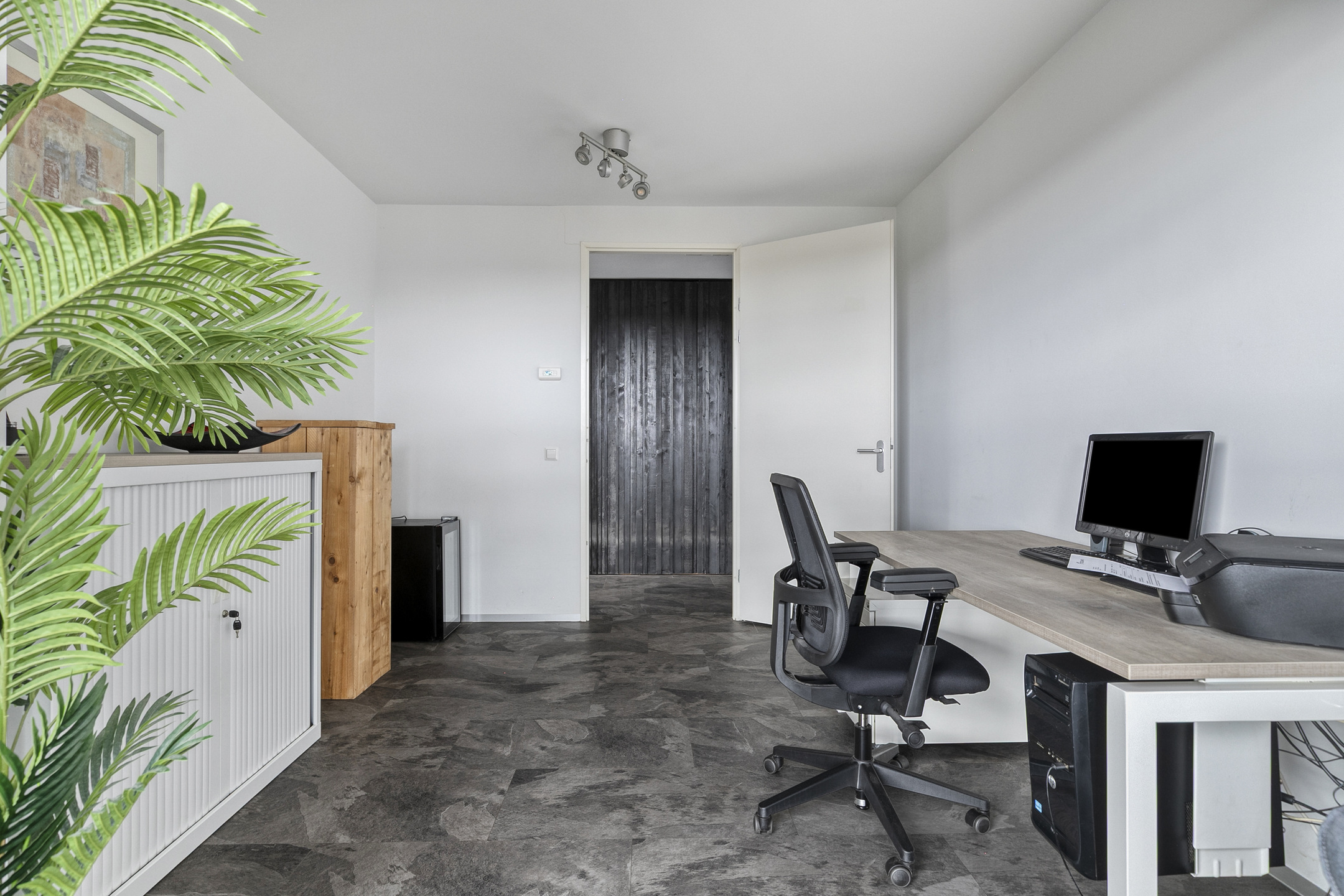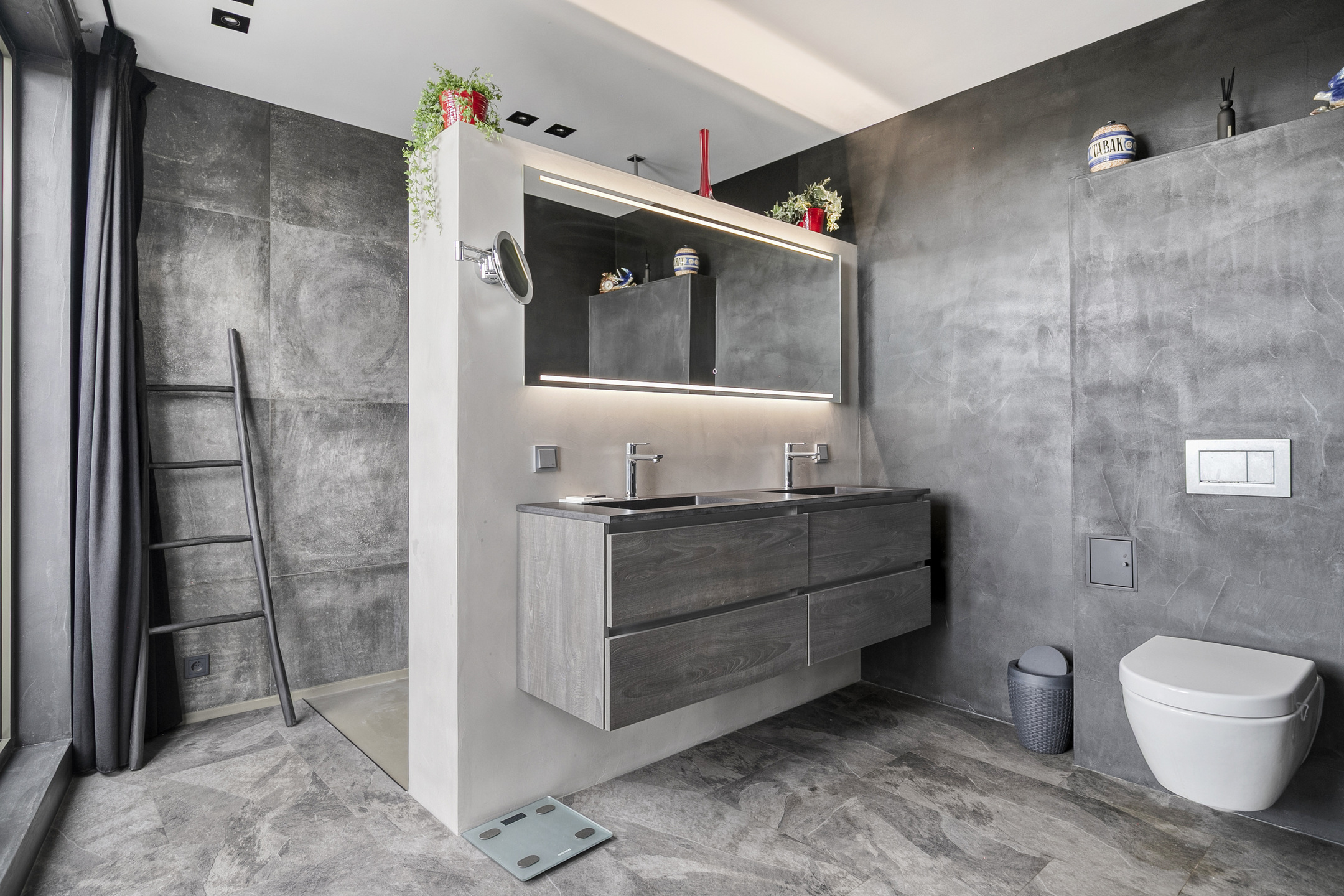 De badkamer is voorzien van een ruime inloopdouche, dubbele wastafel met meubel en een tweede toilet.
