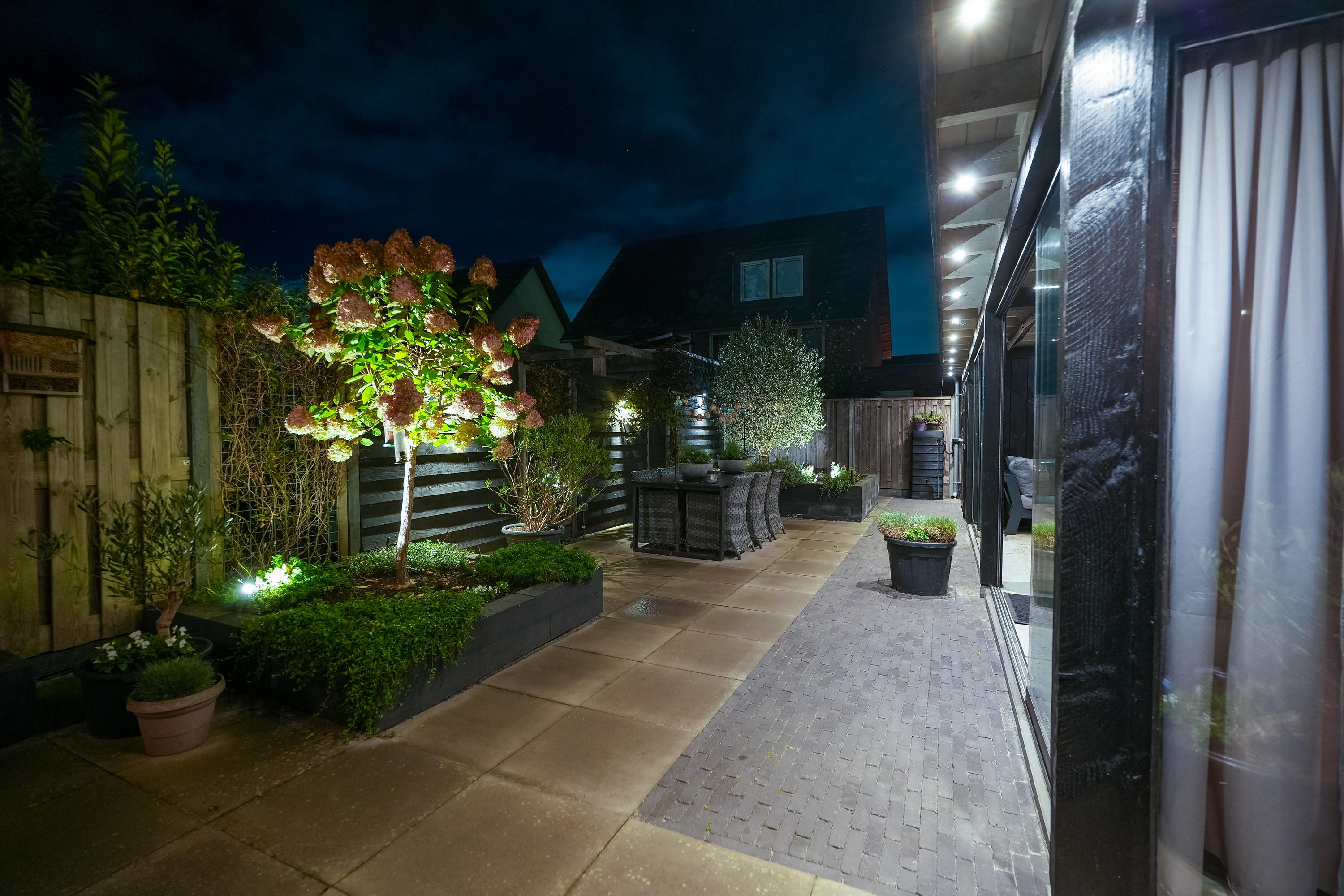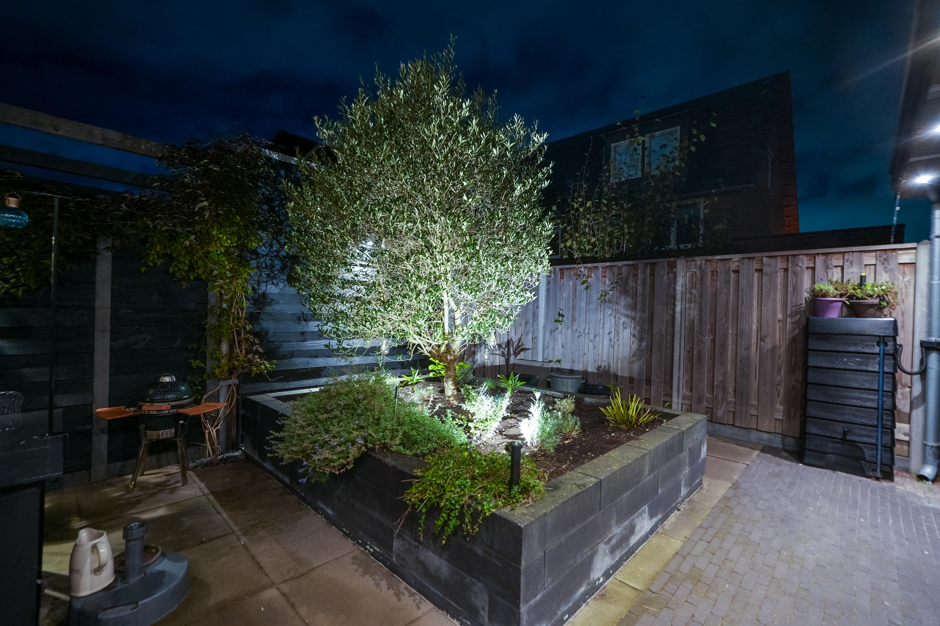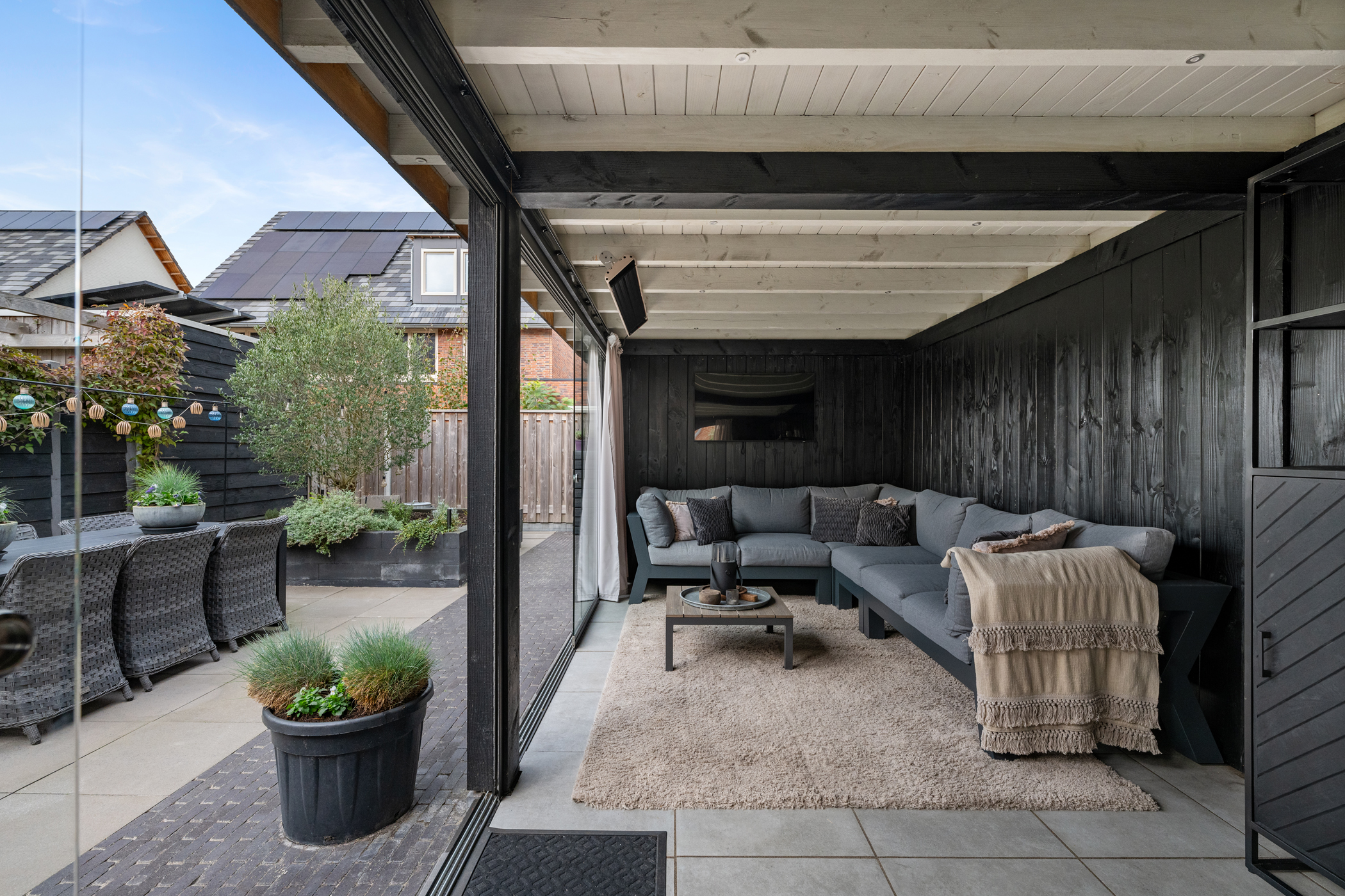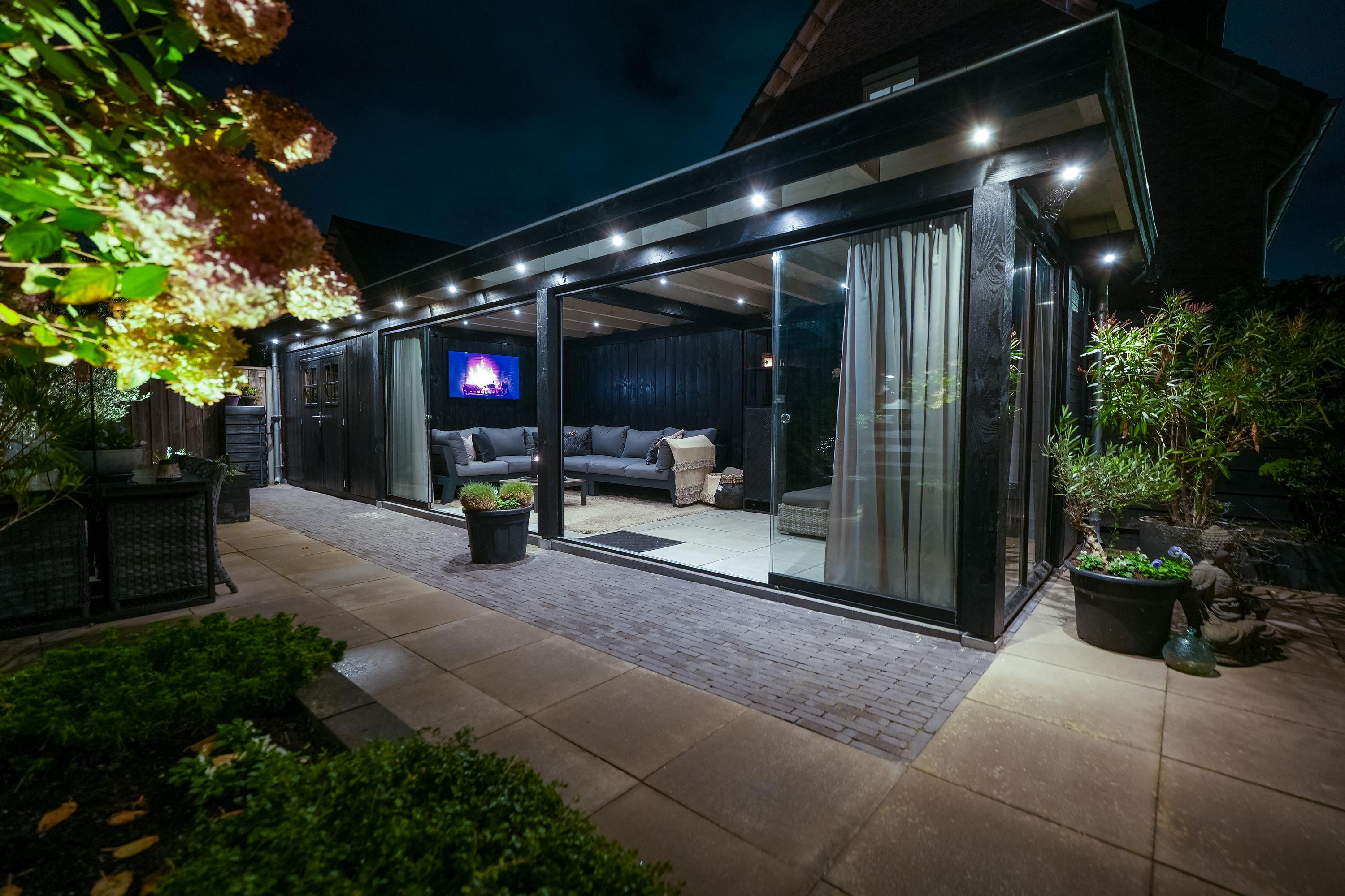 In deze zonnige tuin bevindt zich een sfeervolle overkapping met glazen pui, voorzien van stroom en internet. De ruimte is volledig geïsoleerd en uitgerust met plintverwarming, waardoor deze het hele jaar door comfortabel te gebruiken is. Bovendien zijn er vier zonnepanelen aanwezig, wat bijdraagt aan een energiezuinige en duurzame inrichting.