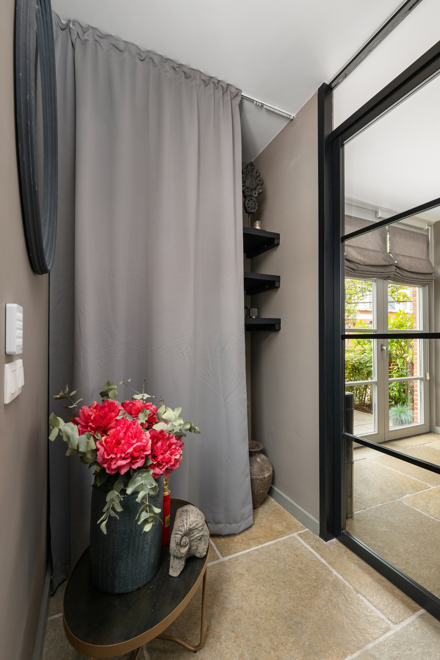 De tuingerichte woonkamer is ruim en licht, afgewerkt met een fraaie Bourgondisch dallen natuurstenen vloer met vloerverwarming. De trap naar de eerste verdieping bevindt zich in de woonkamer en de trapkast is praktisch ingericht als extra garderobe. Openslaande deuren bieden toegang tot de diepe achtertuin, compleet met overkapping en vrijstaande houten berging.