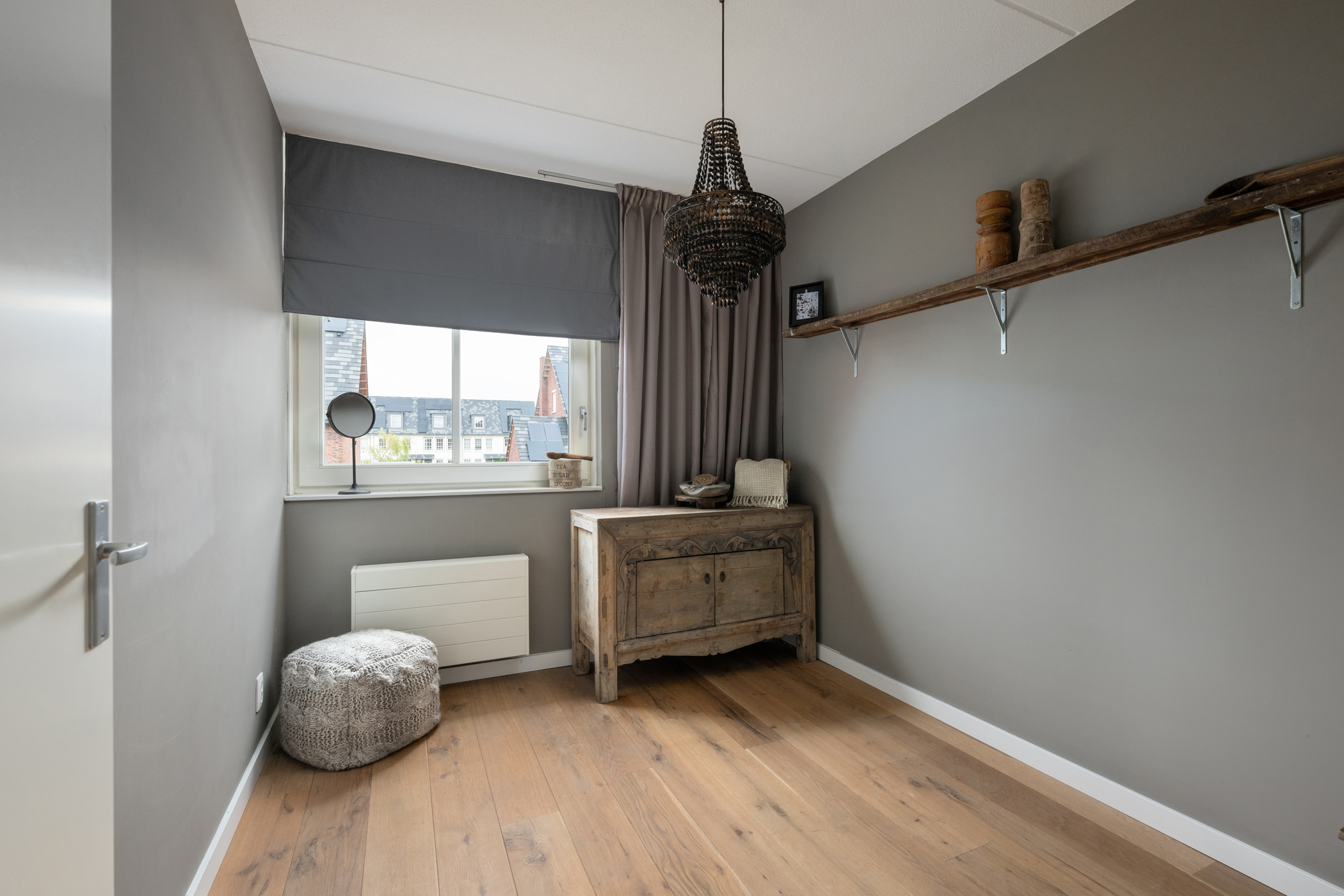 De overloop is voorzien van een houten vloer en geeft toegang tot een de toiletruimte. Aan de achterzijde van de woning bevinden zich twee slaapkamers, aan de voorzijde één slaapkamer. De volledig betegelde badkamer is luxe uitgevoerd met een inloopdouche, ligbad, badkamermeubel met dubbele wastafel, grote spiegel en handdoekradiator.