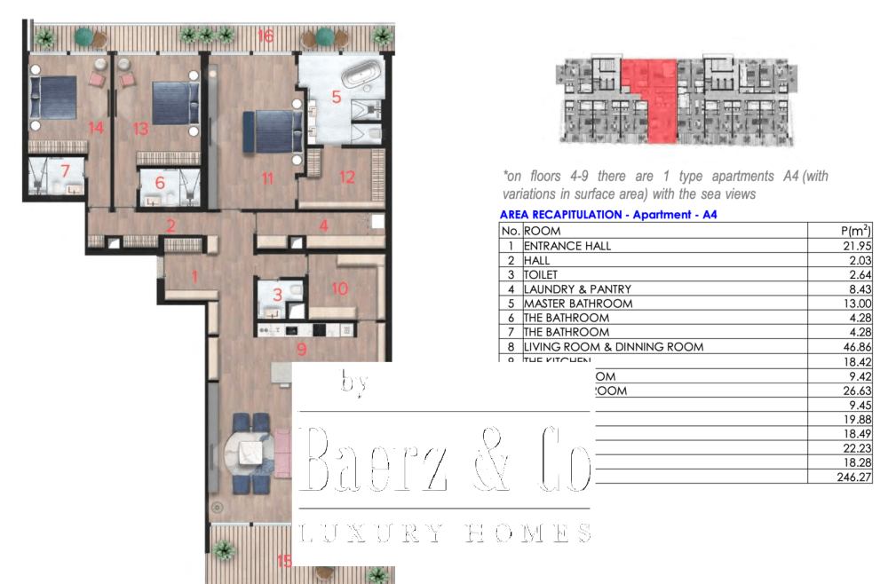 Appartement Budva is stijlvol gepositioneerd op de zesde verdieping van een vijfsterrencomplex aan de eerste lijn aan zee, op enkele momenten van het oude centrum van Budva. Dit appartement staat voor ingetogen luxe en hedendaagse allure, met een woonoppervlakte van 246 m², een open indeling, eetgedeelte, keuken en drie slaapkamers die elk over een eigen en suite badkamer beschikken. Twee terrassen bieden unieke uitzichten: één richting zee en de oude binnenstad, de andere over het levendige ritme van de stad.