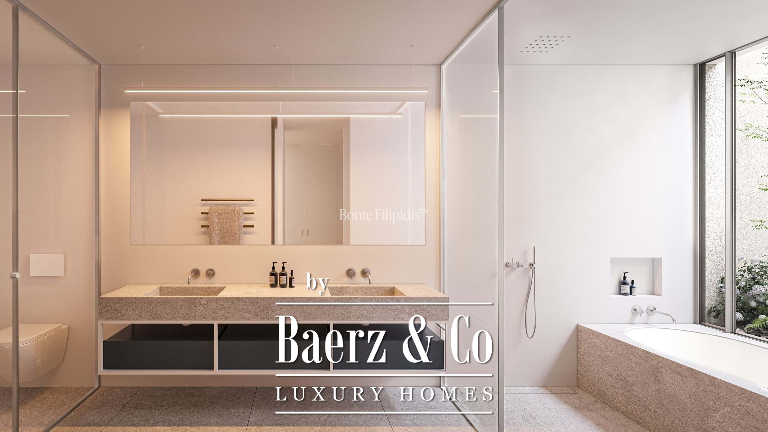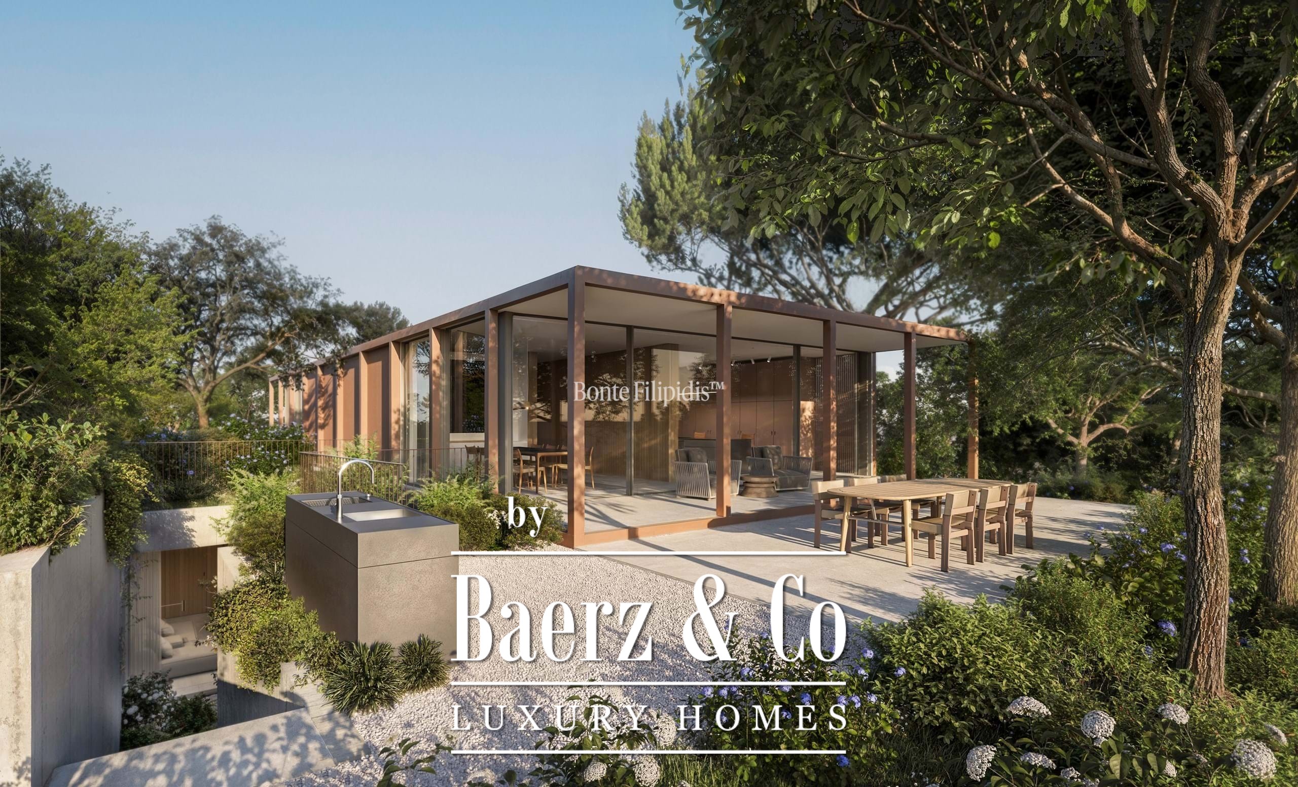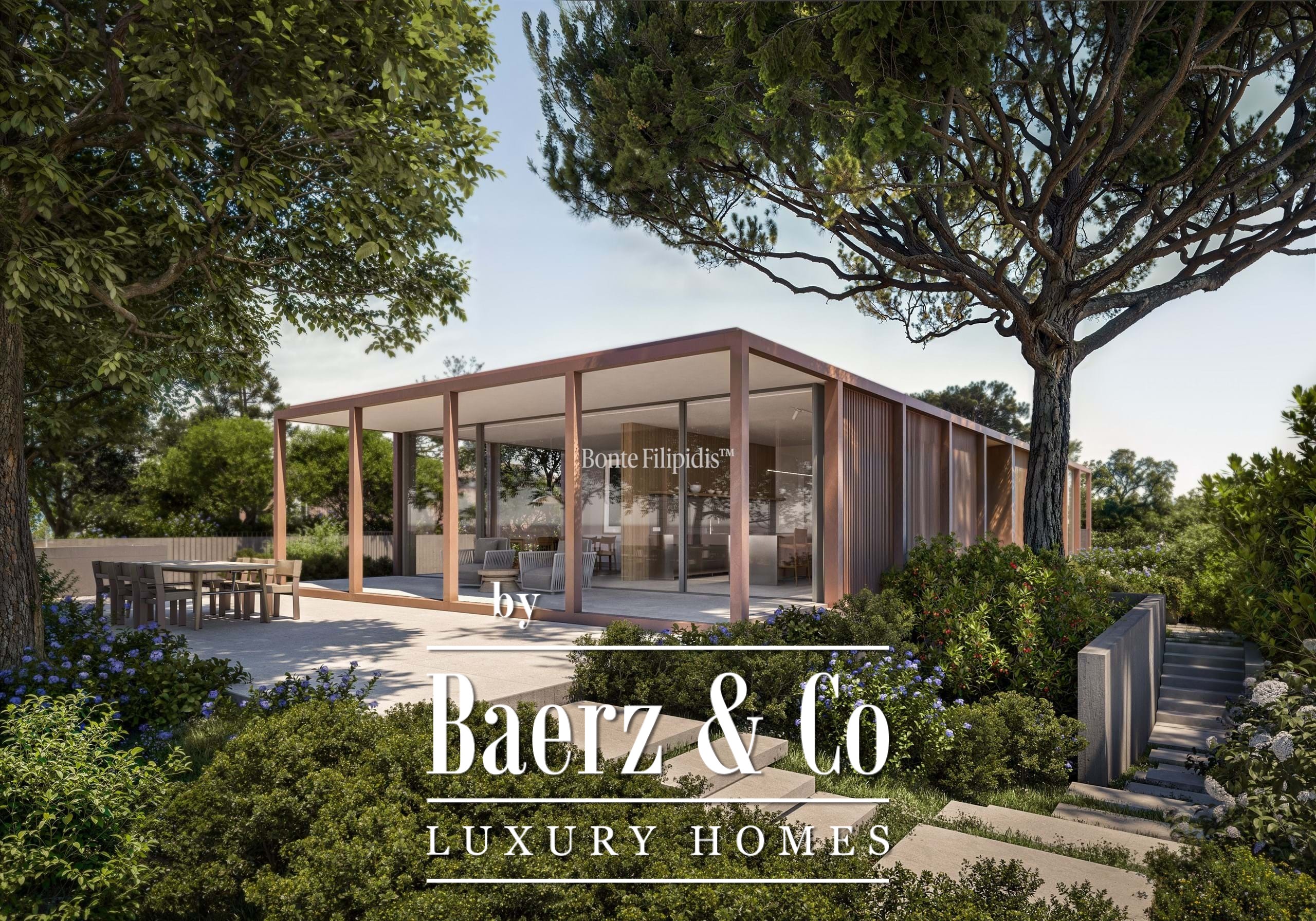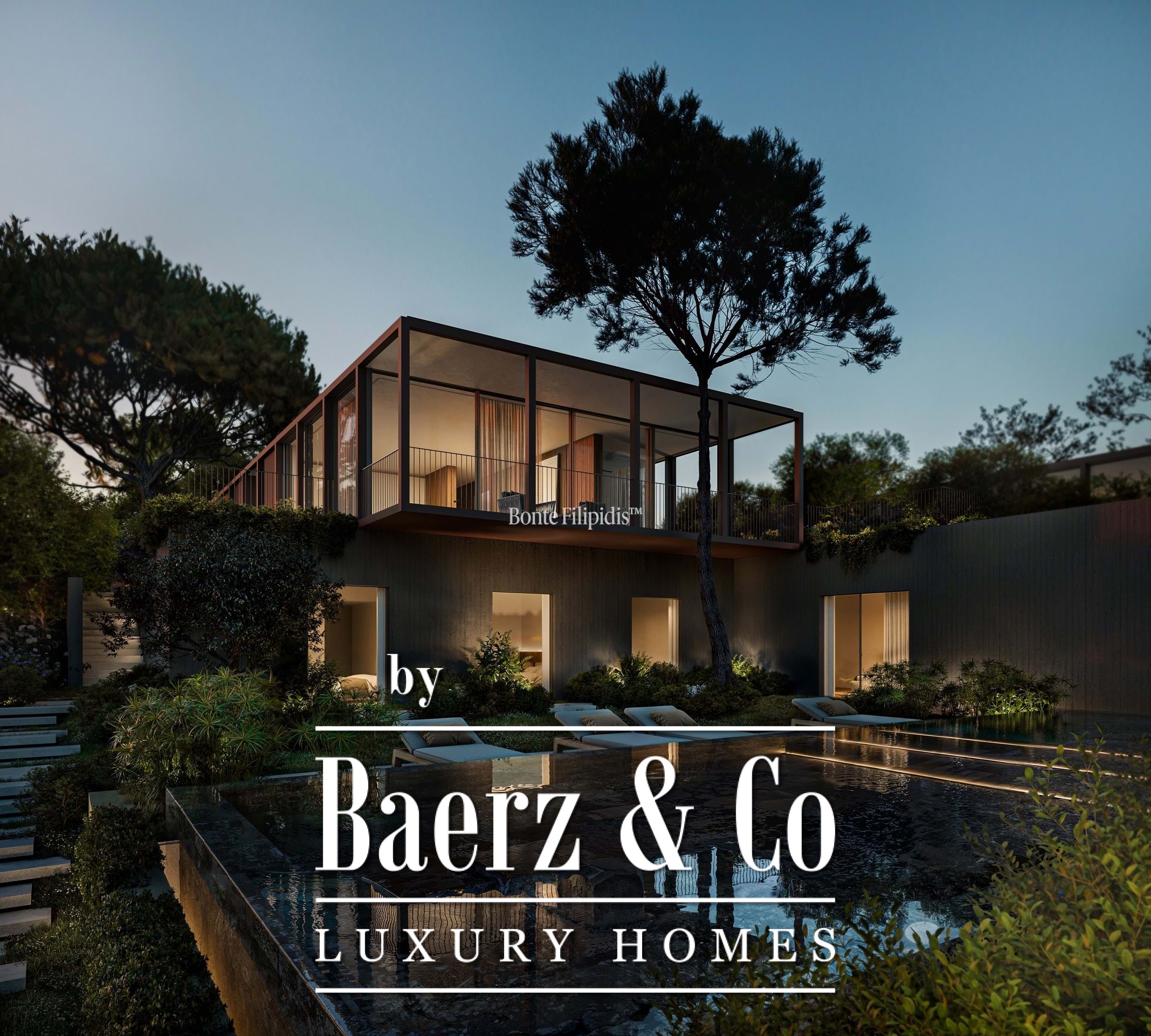 Licht stroomt op alle drie de woonlagen binnen via aluminium kozijnen van vloer tot plafond, wat zorgt voor thermisch en akoestisch comfort in combinatie met een ingetogen, serene uitstraling. Vier slaapkamers en vijf badkamers bieden privacy en ruimte, waaronder een primaire suite van 52 m² met inloopkast en directe toegang tot de tuin en het zwembad. De woon- en ontvangstruimten lopen vloeiend over in 727 m² aangelegde terrassen, schaduwrijke patio’s en een verwarmd zwembad van 63 m², wat zorgt voor een soepele overgang tussen binnen en buiten.