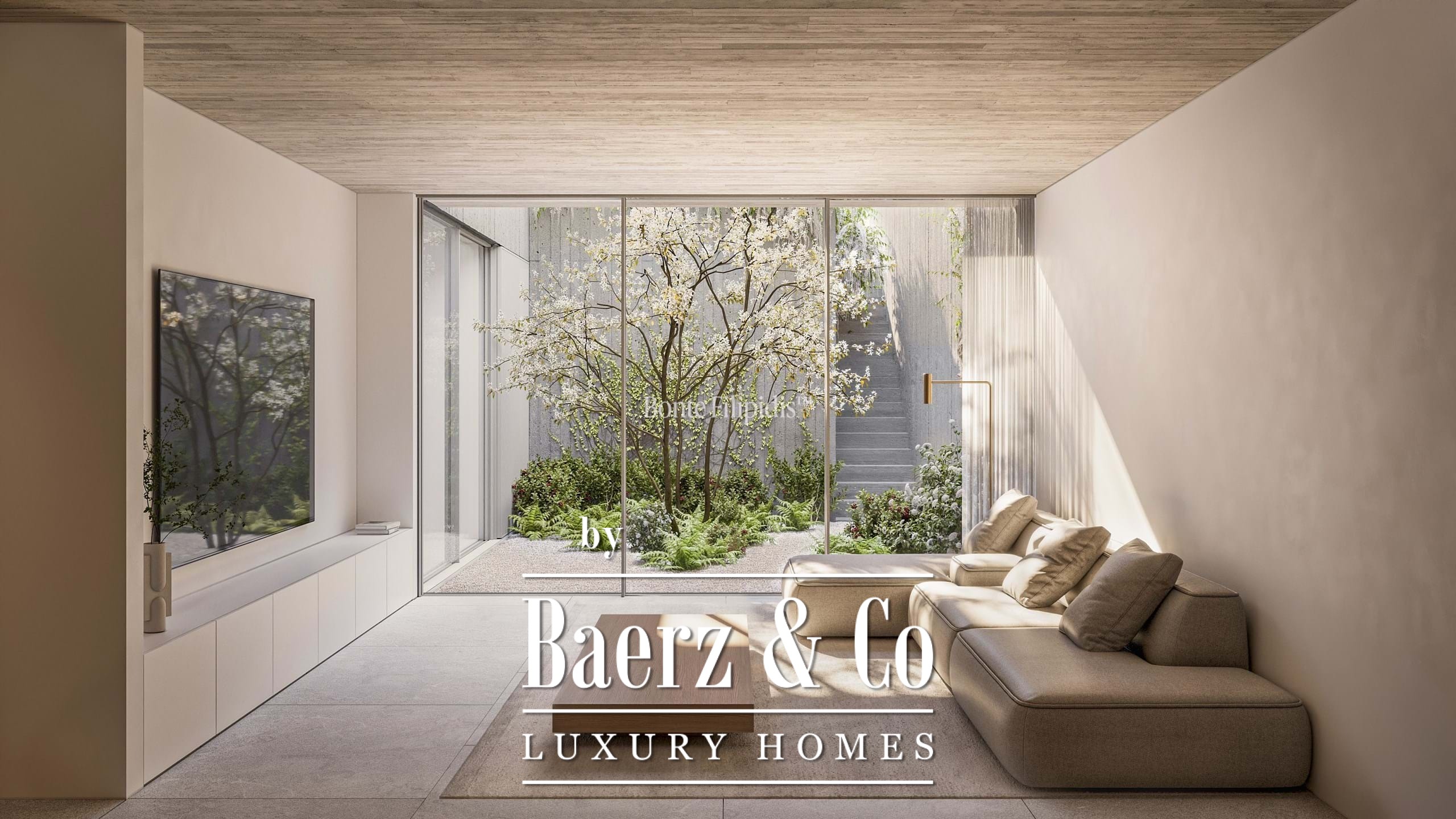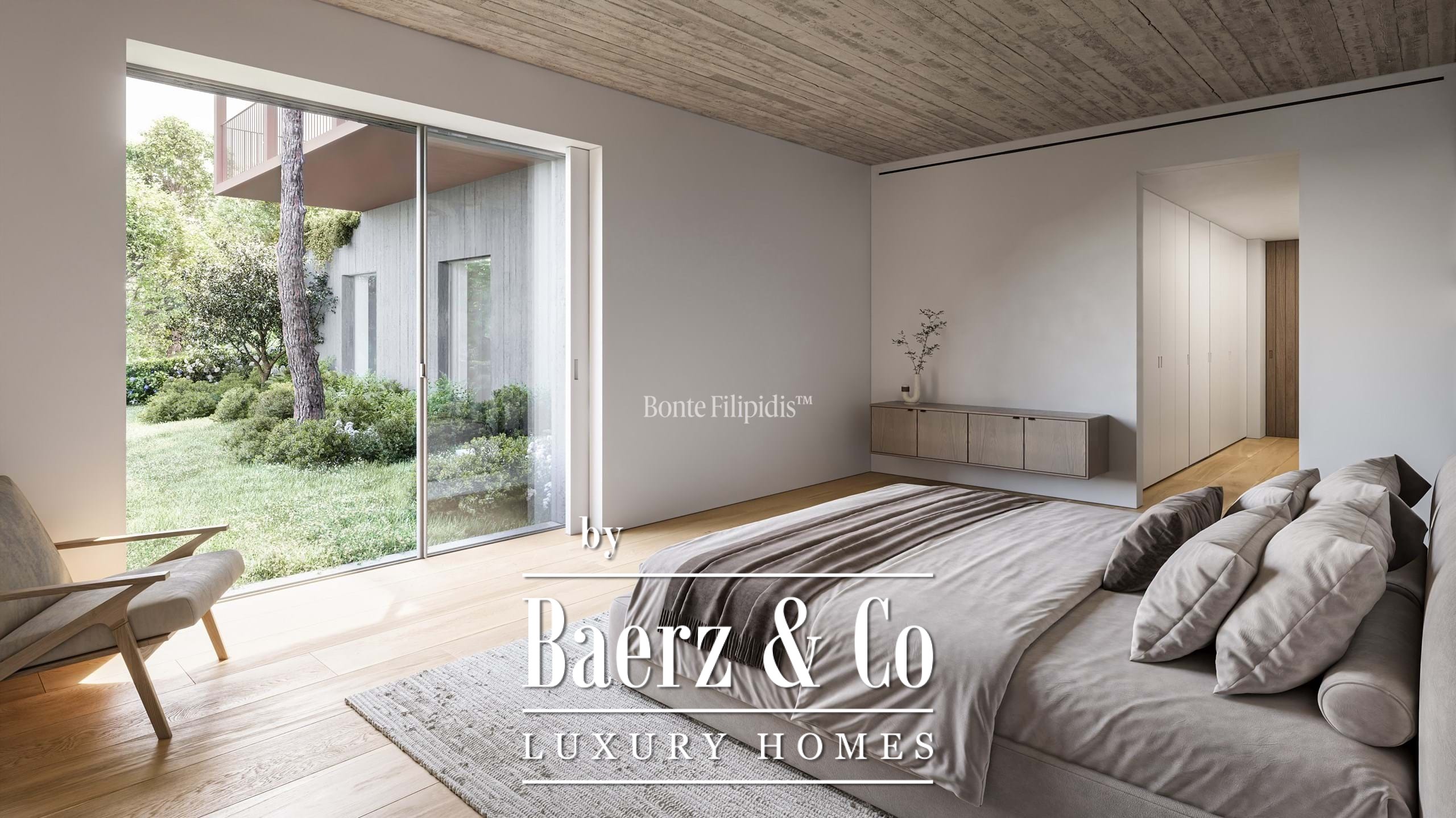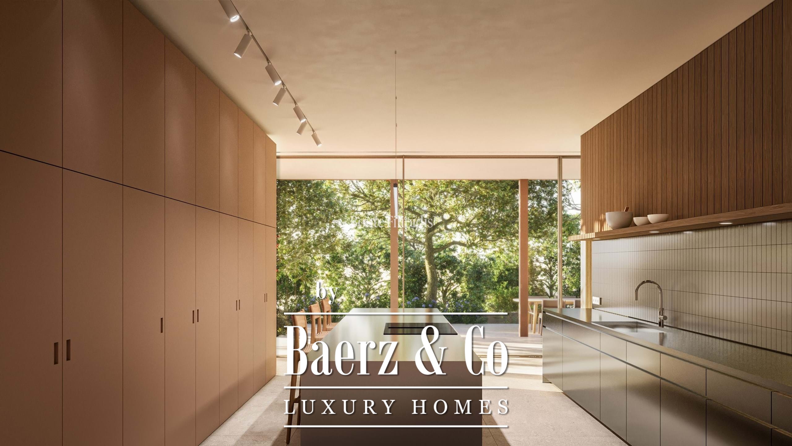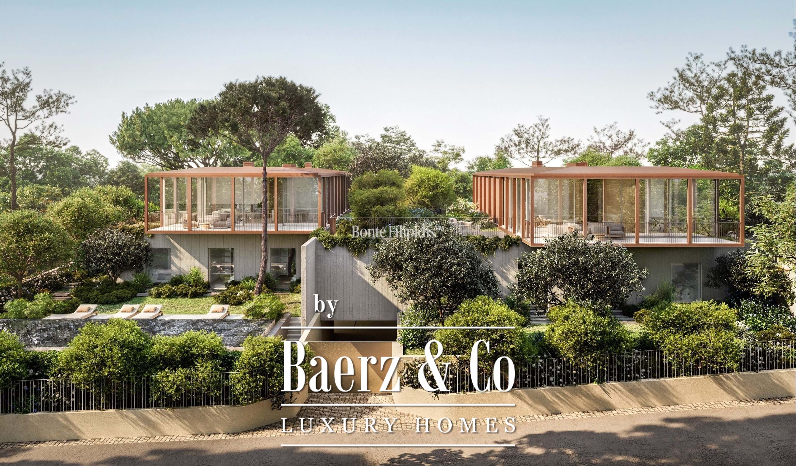 Licht stroomt op alle drie de woonlagen binnen via aluminium kozijnen van vloer tot plafond, wat zorgt voor thermisch en akoestisch comfort in combinatie met een ingetogen, serene uitstraling. Vier slaapkamers en vijf badkamers bieden privacy en ruimte, waaronder een primaire suite van 52 m² met inloopkast en directe toegang tot de tuin en het zwembad. De woon- en ontvangstruimten lopen vloeiend over in 727 m² aangelegde terrassen, schaduwrijke patio’s en een verwarmd zwembad van 63 m², wat zorgt voor een soepele overgang tussen binnen en buiten.
