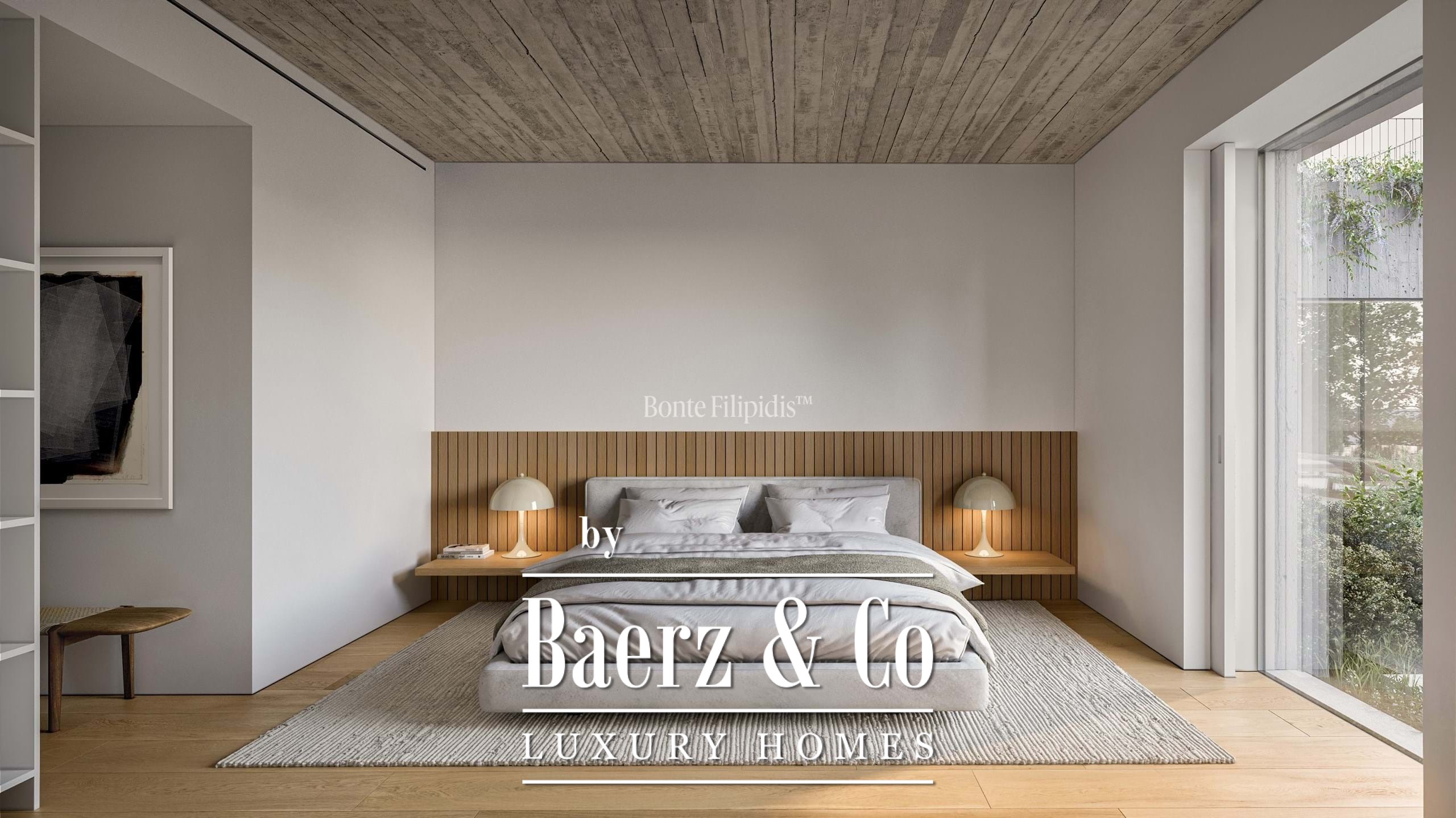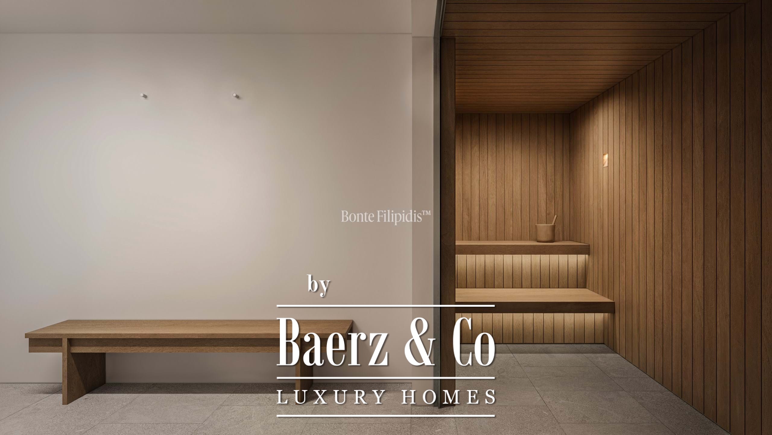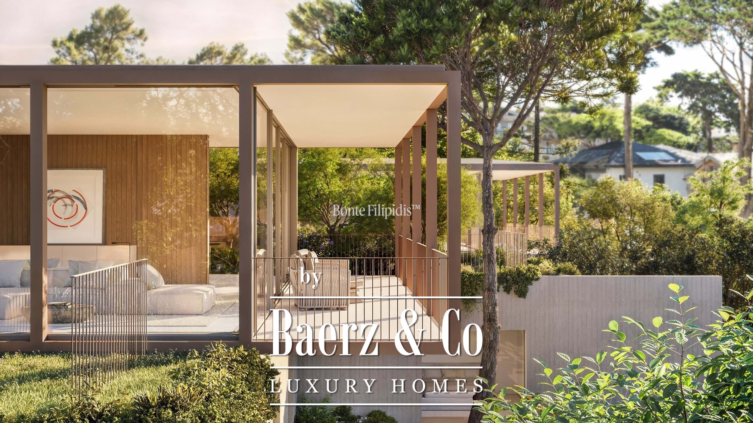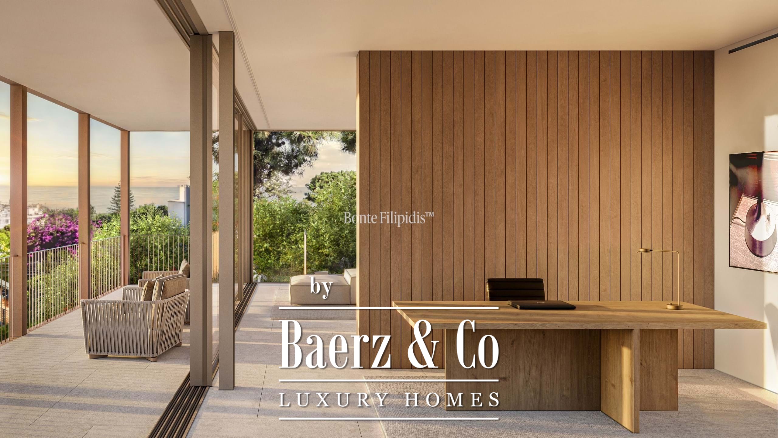 Licht stroomt op alle drie de woonlagen binnen via aluminium kozijnen van vloer tot plafond, wat zorgt voor thermisch en akoestisch comfort in combinatie met een ingetogen, serene uitstraling. Vier slaapkamers en vijf badkamers bieden privacy en ruimte, waaronder een primaire suite van 52 m² met inloopkast en directe toegang tot de tuin en het zwembad. De woon- en ontvangstruimten lopen vloeiend over in 727 m² aangelegde terrassen, schaduwrijke patio’s en een verwarmd zwembad van 63 m², wat zorgt voor een soepele overgang tussen binnen en buiten.