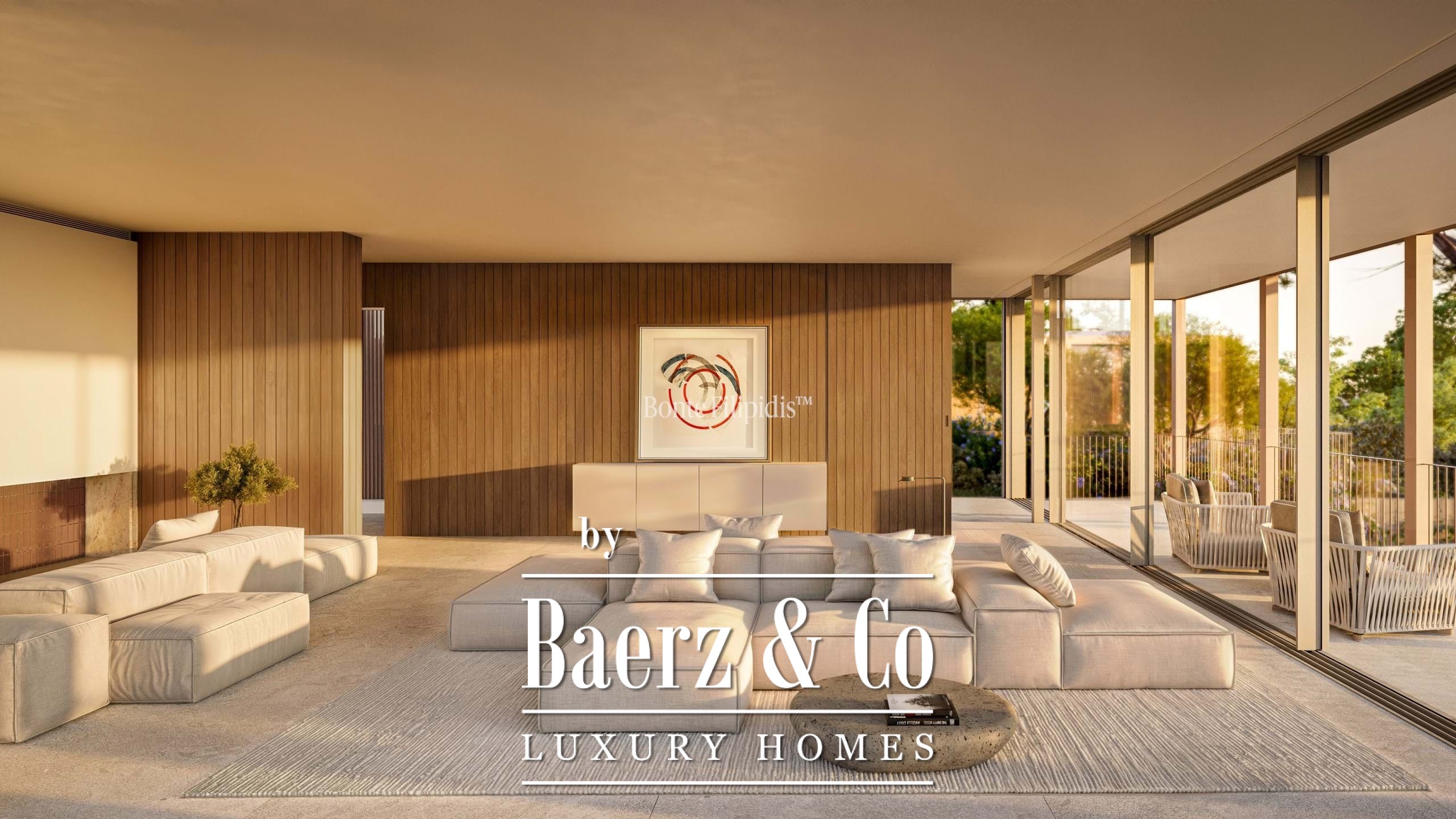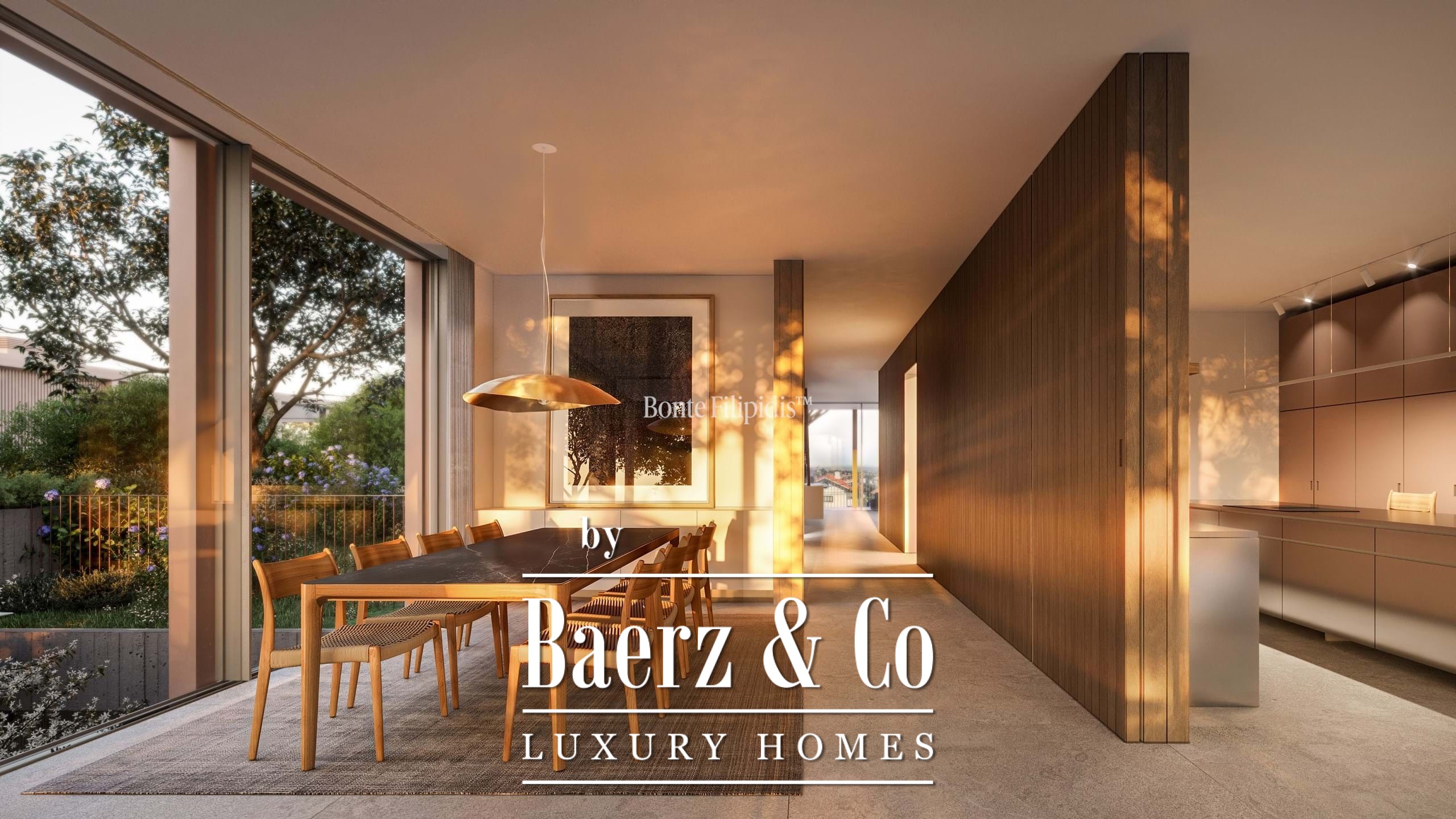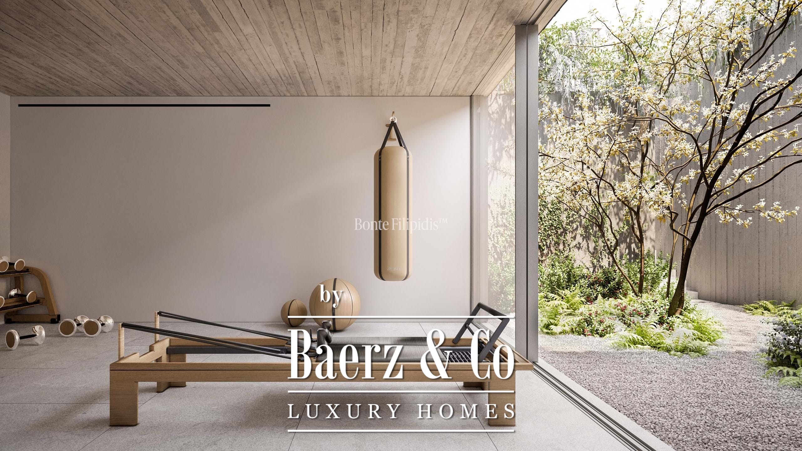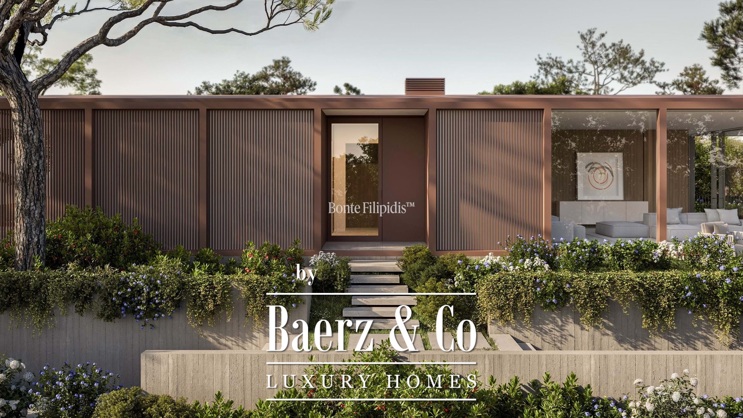Licht stroomt op alle drie de woonlagen binnen via aluminium kozijnen van vloer tot plafond, wat zorgt voor thermisch en akoestisch comfort in combinatie met een ingetogen, serene uitstraling. Vier slaapkamers en vijf badkamers bieden privacy en ruimte, waaronder een primaire suite van 52 m² met inloopkast en directe toegang tot de tuin en het zwembad. De woon- en ontvangstruimten lopen vloeiend over in 727 m² aangelegde terrassen, schaduwrijke patio’s en een verwarmd zwembad van 63 m², wat zorgt voor een soepele overgang tussen binnen en buiten.