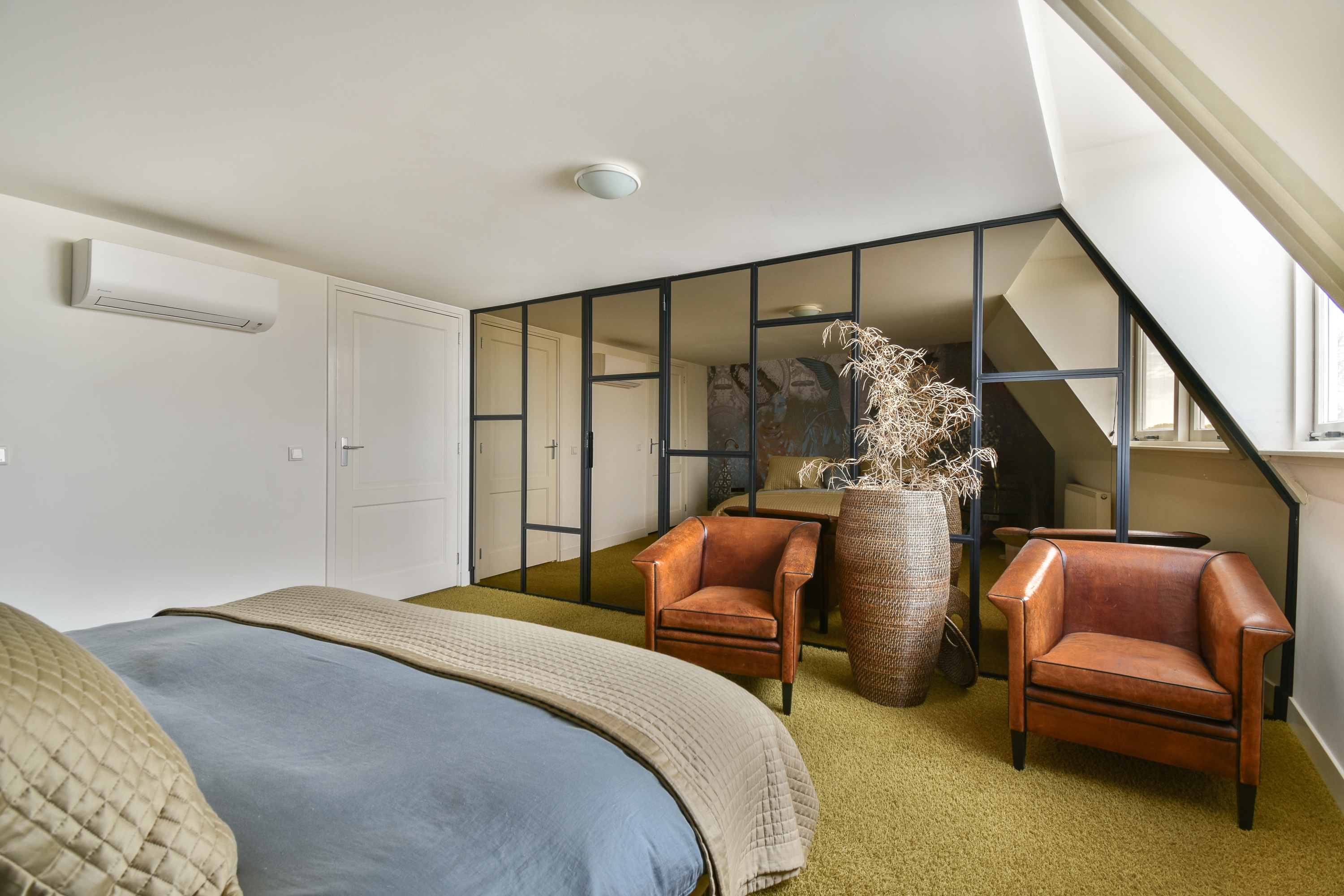 Slaapkamer met zicht op de rivier en voorzien van twee inloopkasten van respectievelijk 4 m2 en 6 m2 en airconditioning.