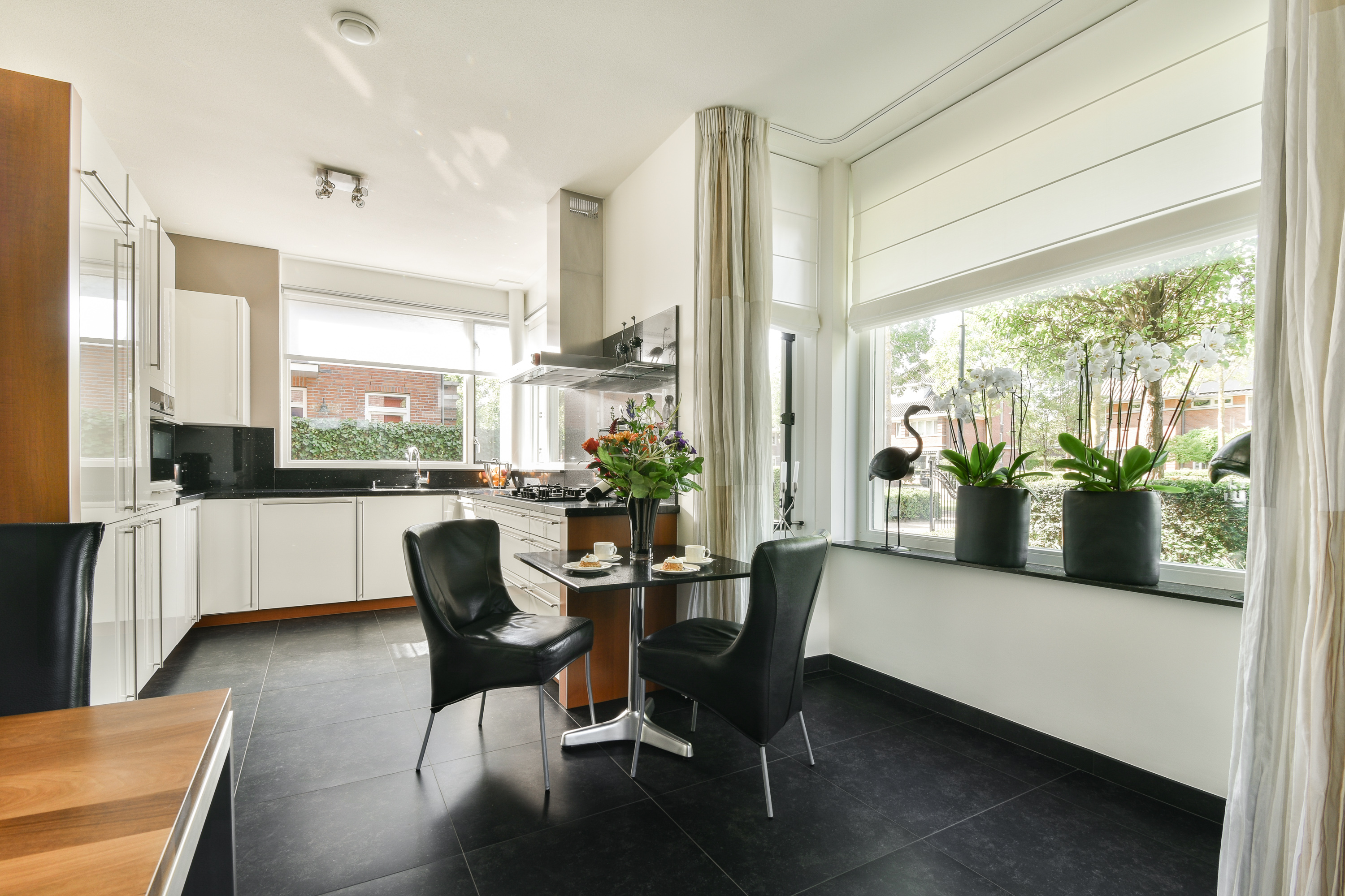 De open keuken aan de voorzijde is in U-vorm opgesteld met een composiet blad en luxe inbouwapparatuur, te weten: een 5-pits gaskookplaat met rvs afzuigschouw (Siemens), een combi-oven (Siemens), een koel-/vriescombinatie (Bosch) en een vaatwasmachine (Bosch). Aan de zijkant betreedt u via dubbele deuren de zijtuin.
