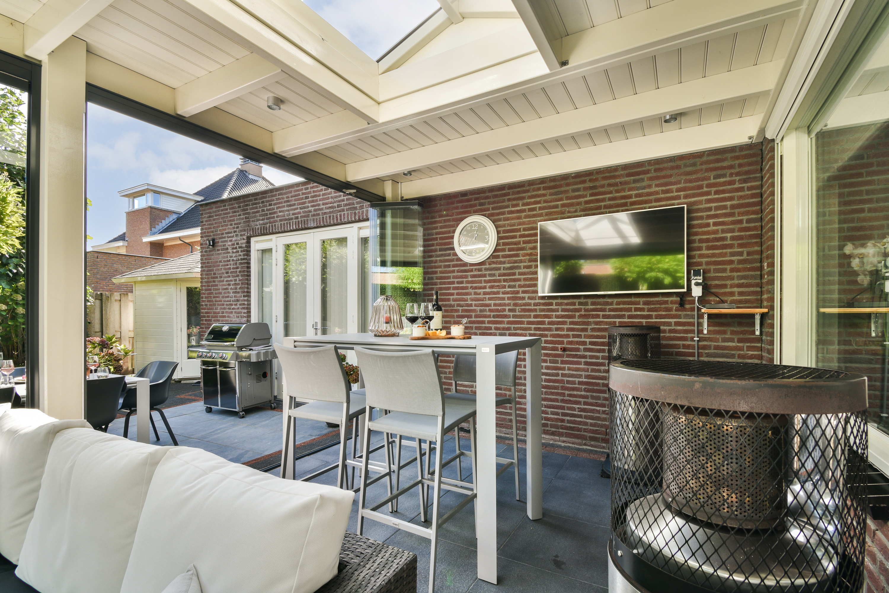 Via dubbele zwart stalen deuren komt u in de living, waar ruimte en sfeer naadloos samenkomen. De woonkamer is verdeeld in een eetgedeelte dat keuken met woonkamer verbindt en een zitgedeelte aan de achterzijde met sfeervolle haard, toegang tot de aanbouw en via dubbele deuren toegang tot de serre (ca. 3,41 x 6,25 m.) en tuin.