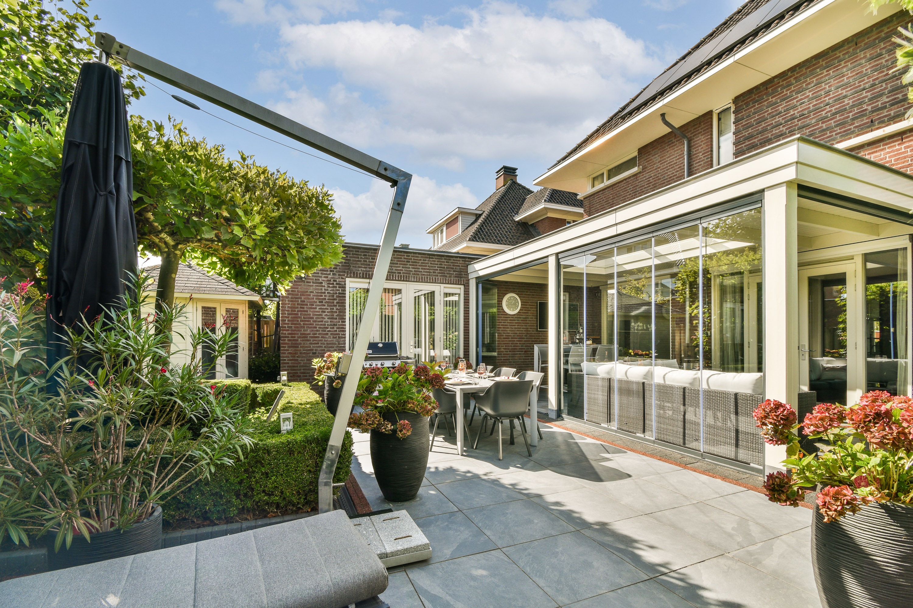 De tuin is rondom en opvallend fraai en verzorgd. Het begint al met de bestrate oprit met carport en de voortuin met planten. De zij- en achtertuin zijn eveneens zeer verzorgd aangelegd met hortensia's, planten, struiken en hagen, maar ook terrassen, electra en verlichting. Als kers op de taart is er een heerlijke en royale serre aangebouwd aan de woonkamer met een glazen (te openen) wand, electra en een dak met lichtstraat.
