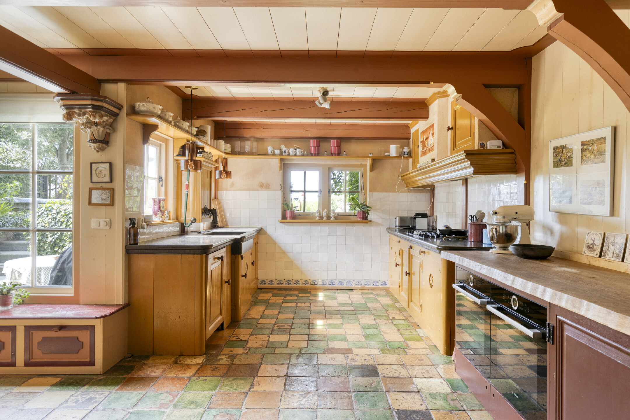 Via de entreehal met toilet betreedt u de lichte, royale woonkamer, waar authenticiteit en comfort direct voelbaar zijn. Aansluitend bevindt zich de ruime woonkeuken met vloerverwarming en openslaande deuren naar de tuin. De keuken is compleet uitgerust met o.a. een 5-pits gaskookplaat, afzuigkap, vaatwasser, meerdere koel- en vrieskasten en een recent geplaatst keukenblok met twee ovens – ideaal voor wie graag kookt en gasten ontvangt.