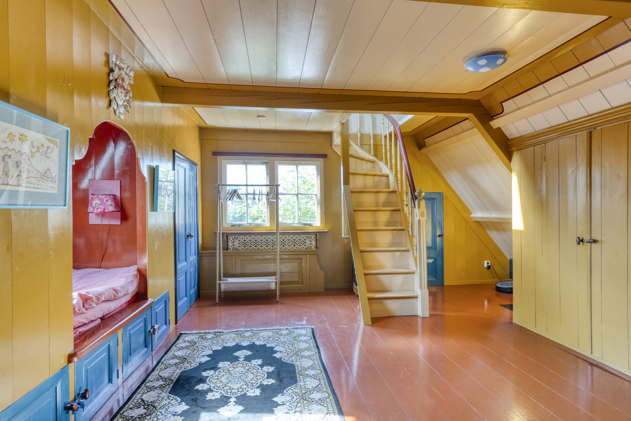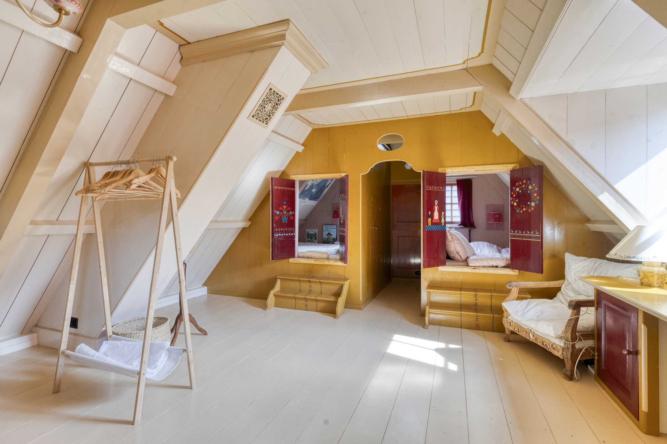 Via de trap in de woonkamer bereikt u de lichte overloop met dakramen, momenteel ingericht als comfortabele thuiswerkplek. Op deze verdieping bevinden zich twee royale slaapkamers. De slaapkamer aan de voorzijde beschikt over vaste kasten, twee bedstedes, een wastafel en toegang tot een bergvliering. De slaapkamer aan de achterzijde heeft eveneens vaste kasten, een bedstee, wastafel en een derde toilet. Aansluitend is er een extra ruimte, geschikt als speelkamer of berging. Via een vaste trap is de ruime zolder bereikbaar met volop opslagmogelijkheden.