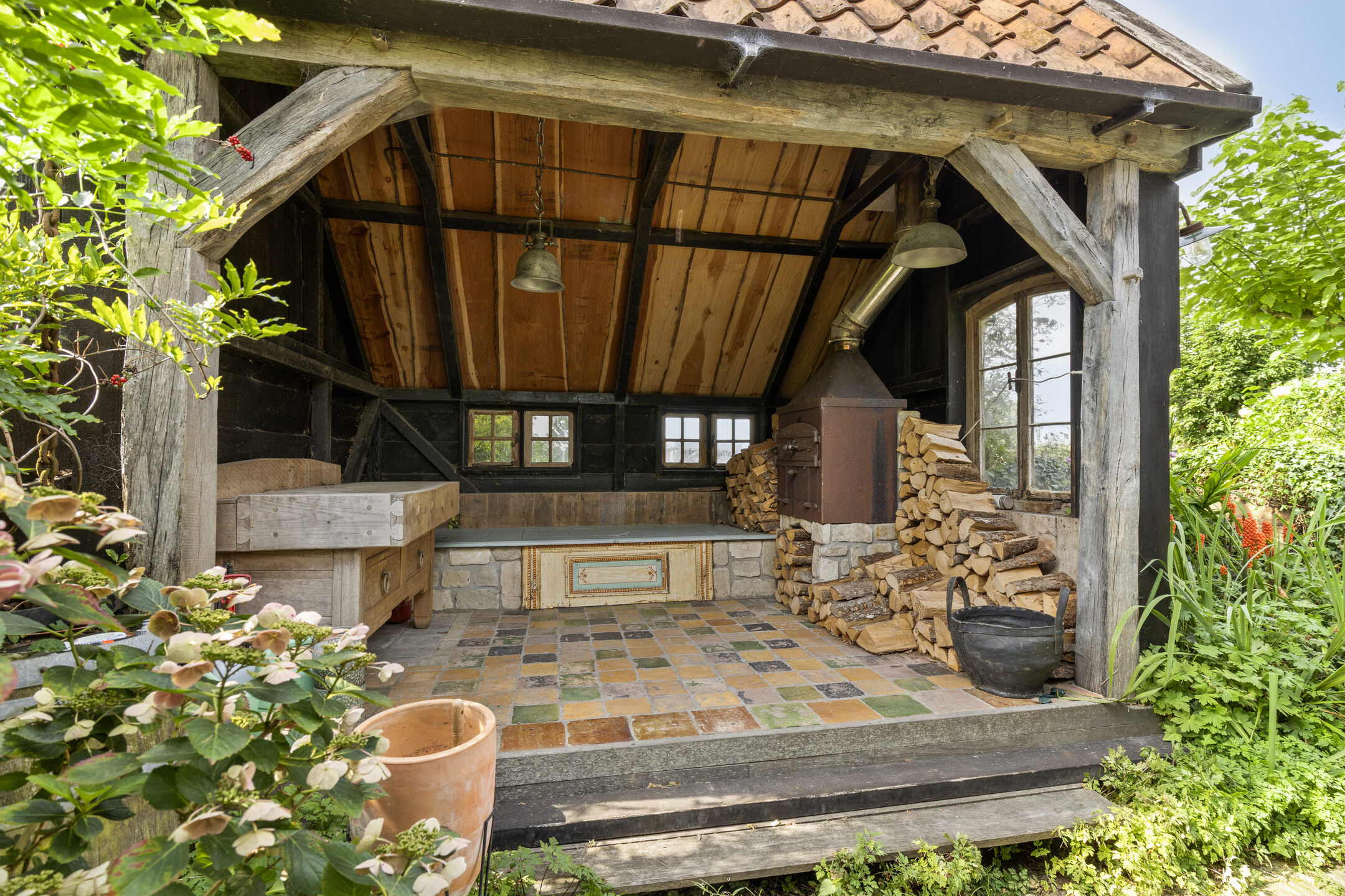De achtertuin is zonder twijfel één van de absolute hoogtepunten. Direct gelegen aan vaarwater, met vrij uitzicht en optimale privacy. Hier vindt u ook een sfeervolle overkapping met houtkachel, voorzien van de originele ovendeuren van de bakkerij die ooit op deze plek gevestigd was – een uniek detail dat het verhaal van het huis versterkt.