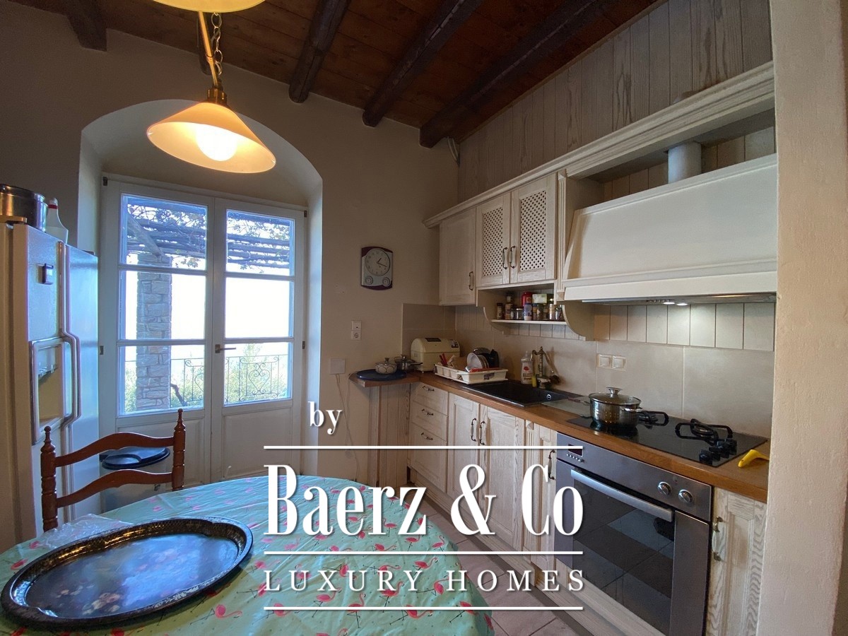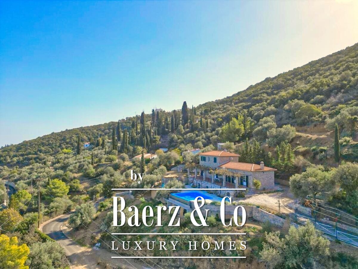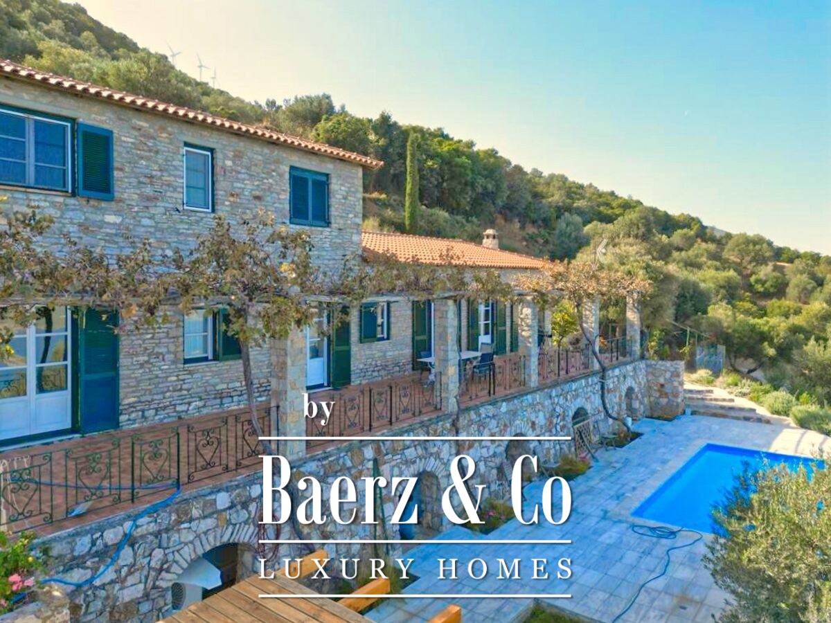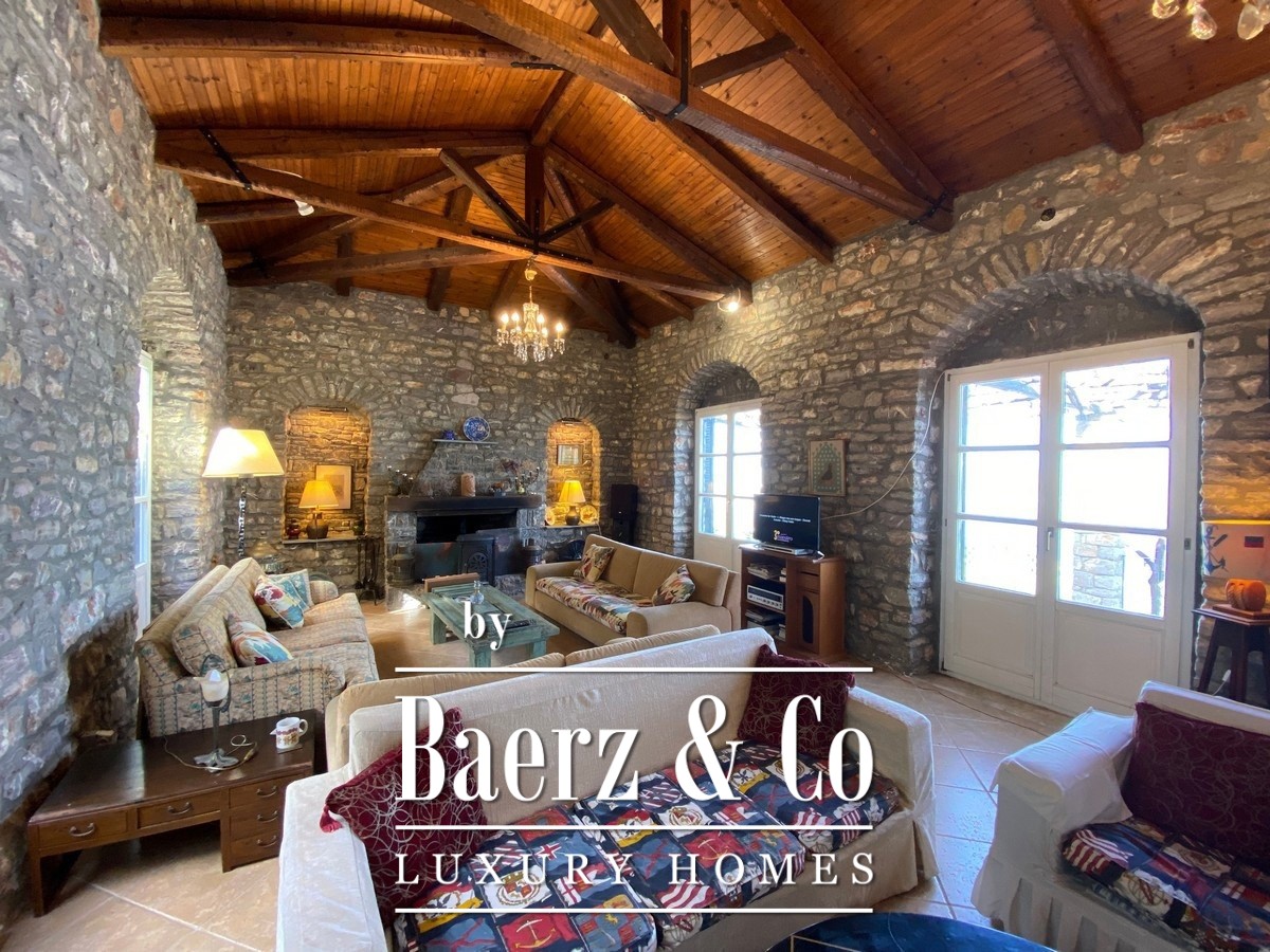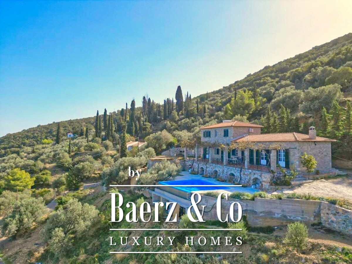 De stenen villa Galatas bevindt zich op een rustige heuvel en biedt panoramisch uitzicht over zee, waar traditionele Griekse architectuur samenkomt met subtiel modern comfort. De riante en lichte kamers in het 180 m² tellende interieur profiteren optimaal van het daglicht, met een centrale living die wordt gekenmerkt door een indrukwekkende stenen open haard. Elke ruimte, van de aparte keuken tot de drie slaapkamers en twee badkamers, is ontworpen met oog voor functionaliteit en ingetogen luxe.