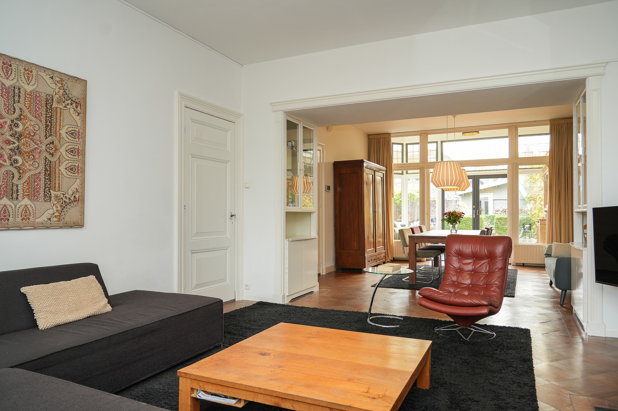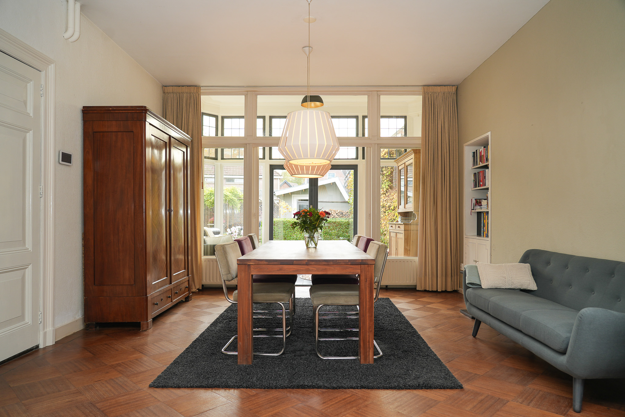 Rechts van de hal bevindt zich de woonkamer. Deze lichte ruimte heeft een plafond van ruim drie meter hoog, een schouw met goed werkend rookkanaal en vaste inbouwkasten op de plaats van de vroegere suitedeuren. In de achterkamer is in de voormalige doorgang naar de school een extra kast gemaakt. Aan de achterzijde bevindt zich een verwarmde tuinkamer met plavuizenvloer – ideaal als speelkamer, want de ruimte kan worden afgesloten met glazen schuifdeuren.