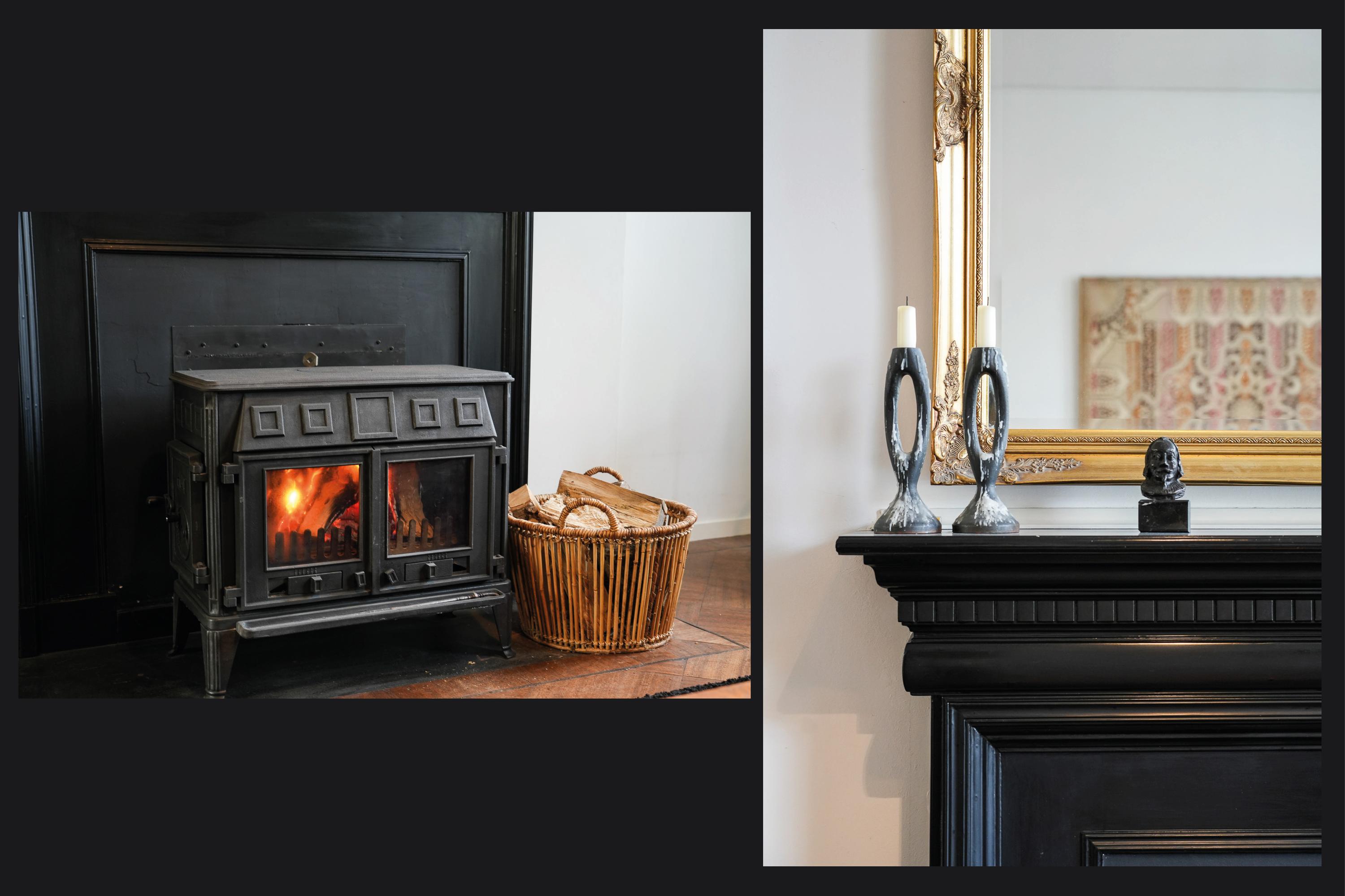 Onder de originele schouw staat een RVS Boretti fornuis.