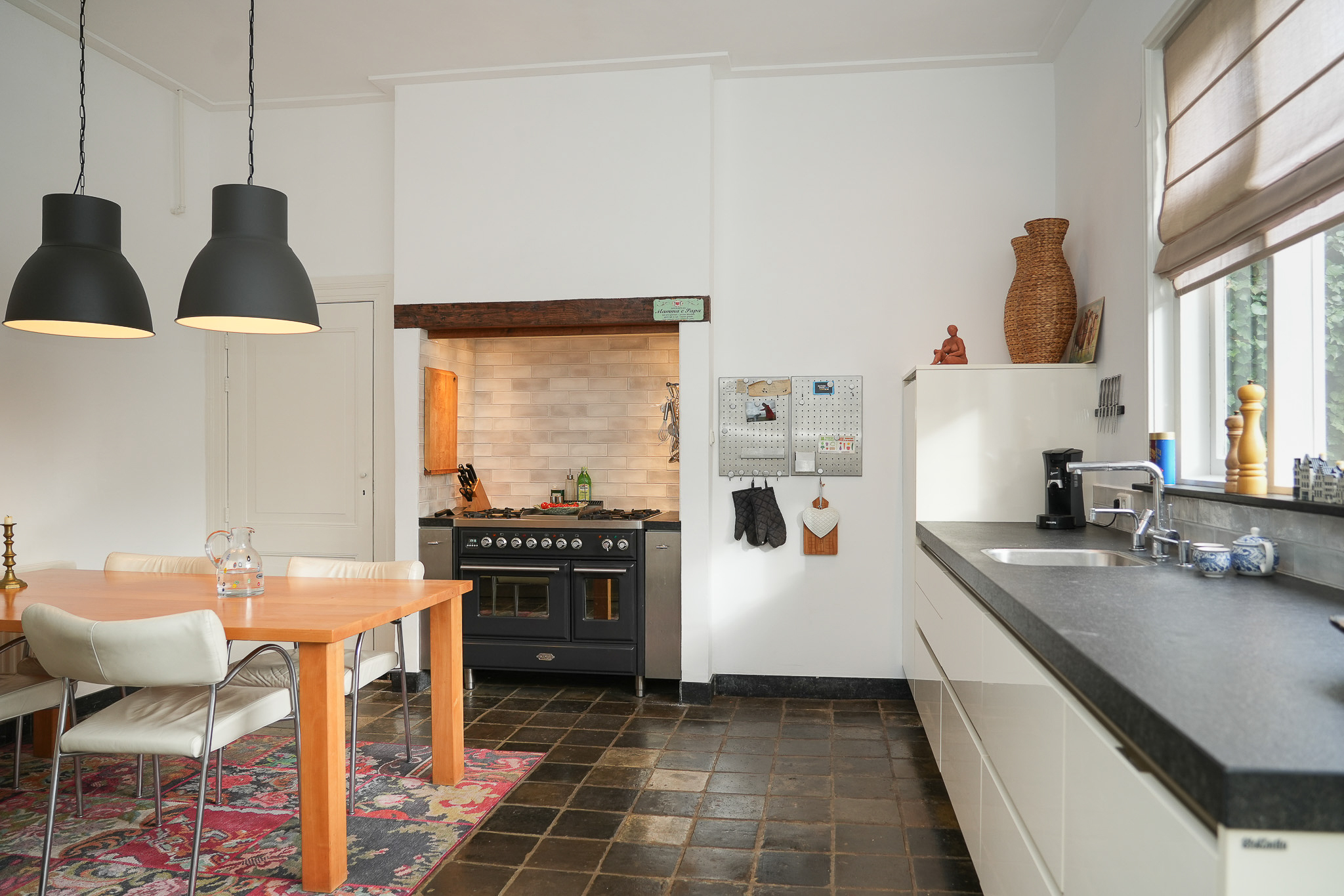 Vanaf het aanrecht is er mooi zicht op de tuin. Er is voldoende ruimte voor een grote eettafel en een brede deur opent naar buiten.