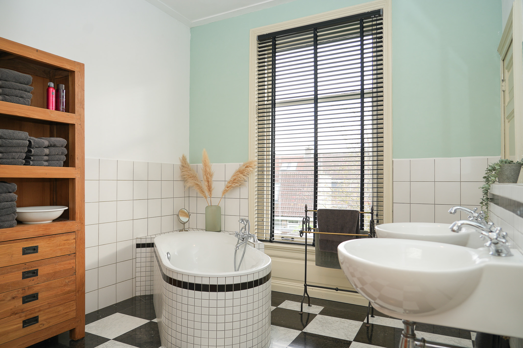 Aan de achterzijde ligt de grootste slaapkamer met antieke schouw, geornamenteerd stucplafond, garderobewand en balkon. Aangrenzend bevindt zich de wasruimte met aansluitingen voor wasmachine, droger en de cv-ketel. De badkamer is compleet ingericht met ligbad, inloopdouche, twee wastafels en vloerverwarming. De toiletruimte grenst aan de overloop.