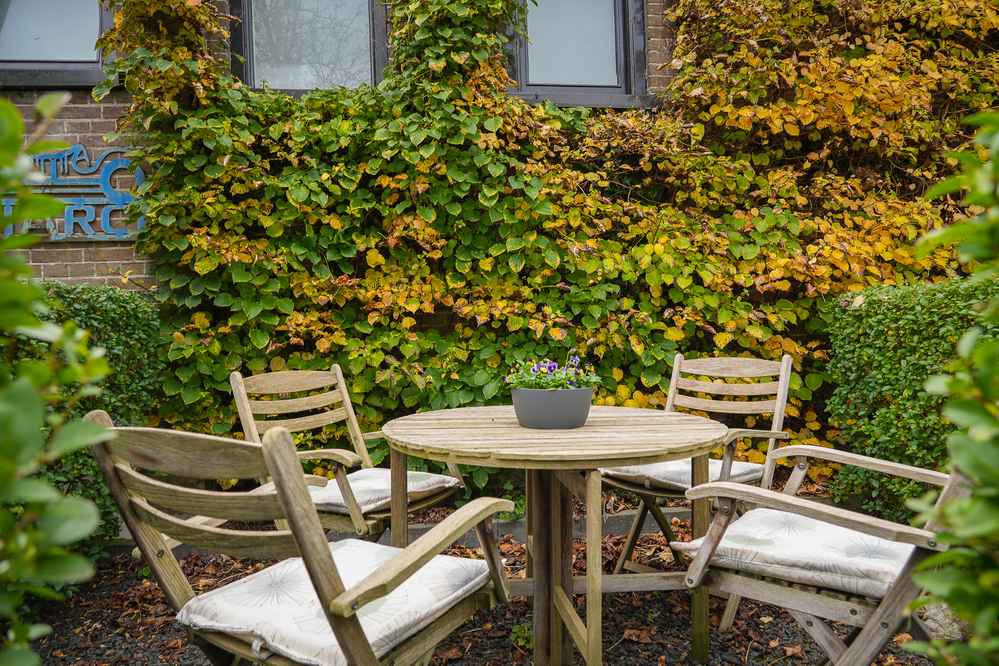 Achter de woning ligt een unieke, 9,5 meter brede en 15 meter diepe tuin op het oosten en zuiden. Er is altijd wel ergens een plekje in de zon of schaduw te vinden. In 2021 hebben de eigenaren het perceel kunnen uitbreiden, waardoor er ruimte ontstond om een groot pannengedekt bijgebouw te bouwen. Deze ruimte van 59 m² leent zich bij uitstek als stallingsruimte voor een oldtimer of boot, dan wel als atelier. De dubbele garagedeuren komen uit op de parkeerplaats direct achter de woning.