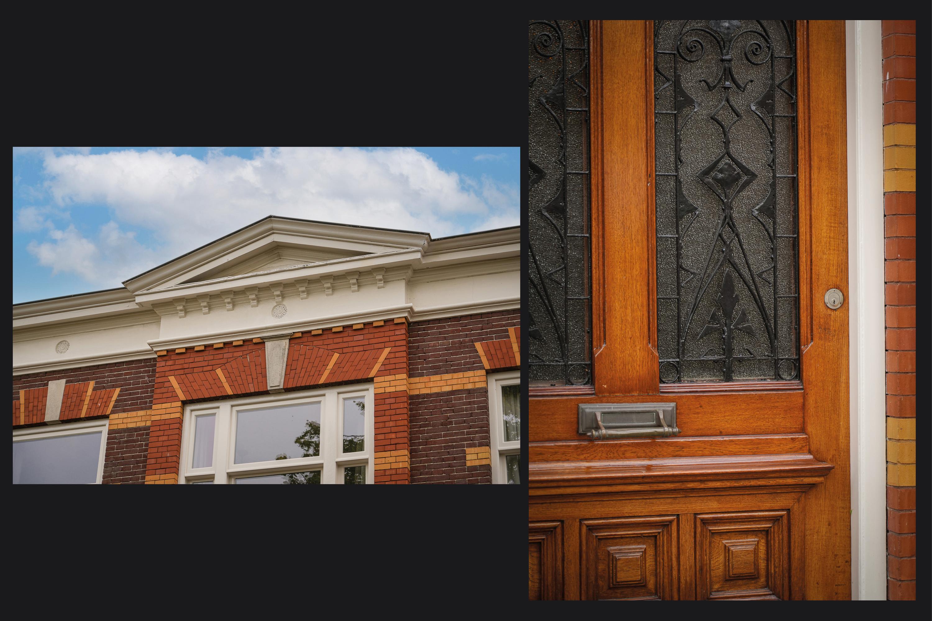 In de fraaie lijstgevel leidt de originele paneelvoordeur naar de vestibule. Deze ruimte heeft een ongekende grandeur, enerzijds door het hoge geornamenteerde stucplafond en anderzijds door het fraaie houtwerk met gaaf bewaard gebleven geëtst glas. De vloer is belegd met marmer en de facettegels op de wanden zijn intact gebleven. In de achtergelegen hal leidt een 19e-eeuwse trappartij naar de verdieping. Vanuit de hal geven prachtige paneeldeuren toegang tot de woonkamer, werkkamer, woonkeuken, kelderkast en het toilet. De vloer is hier belegd met authentieke patroontegels. De woonkeuken is een heerlijk lichte ruimte, ingericht met een Siematic keukenmeubel voorzien van diverse apparatuur en een diep natuurstenen werkblad uit één stuk.