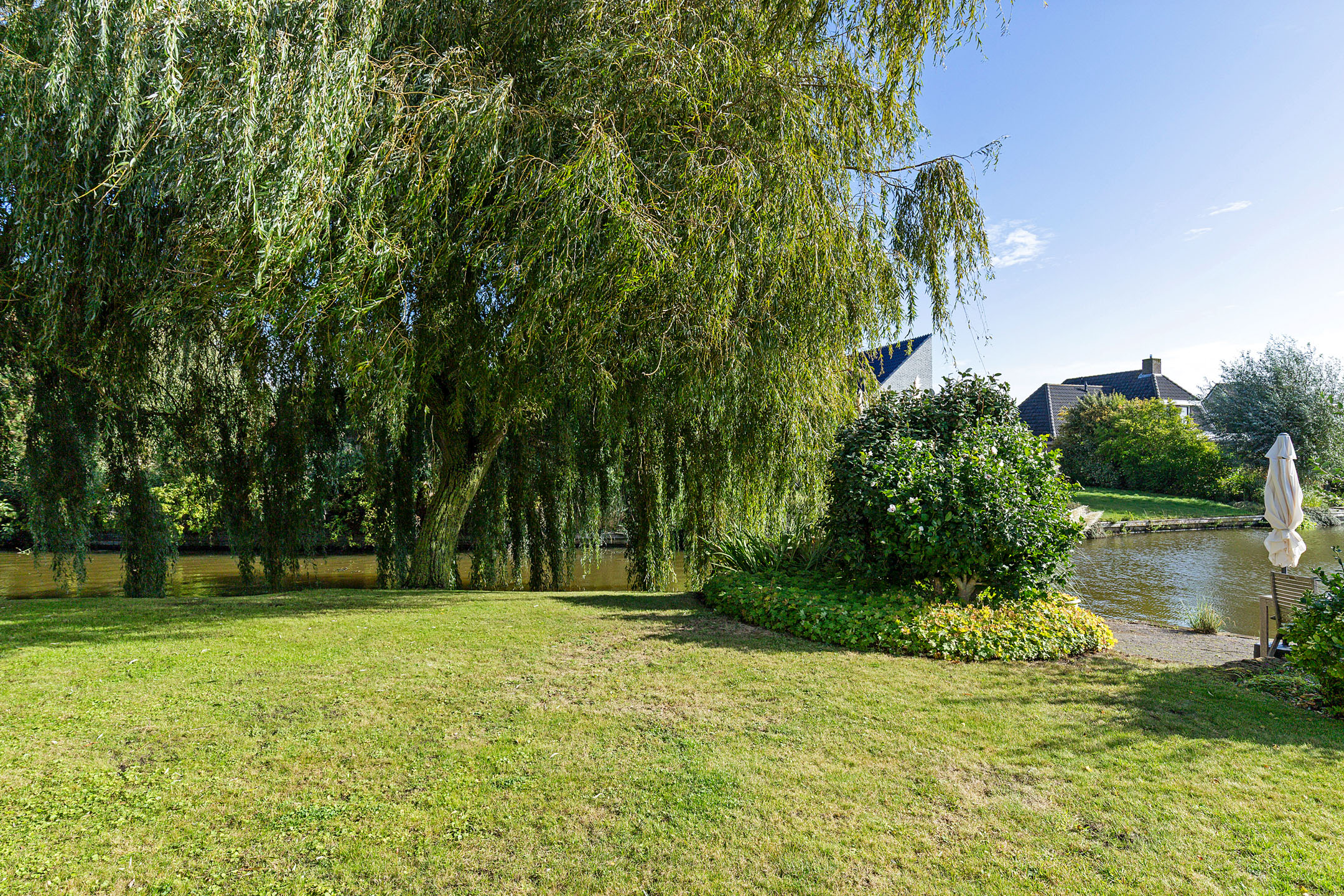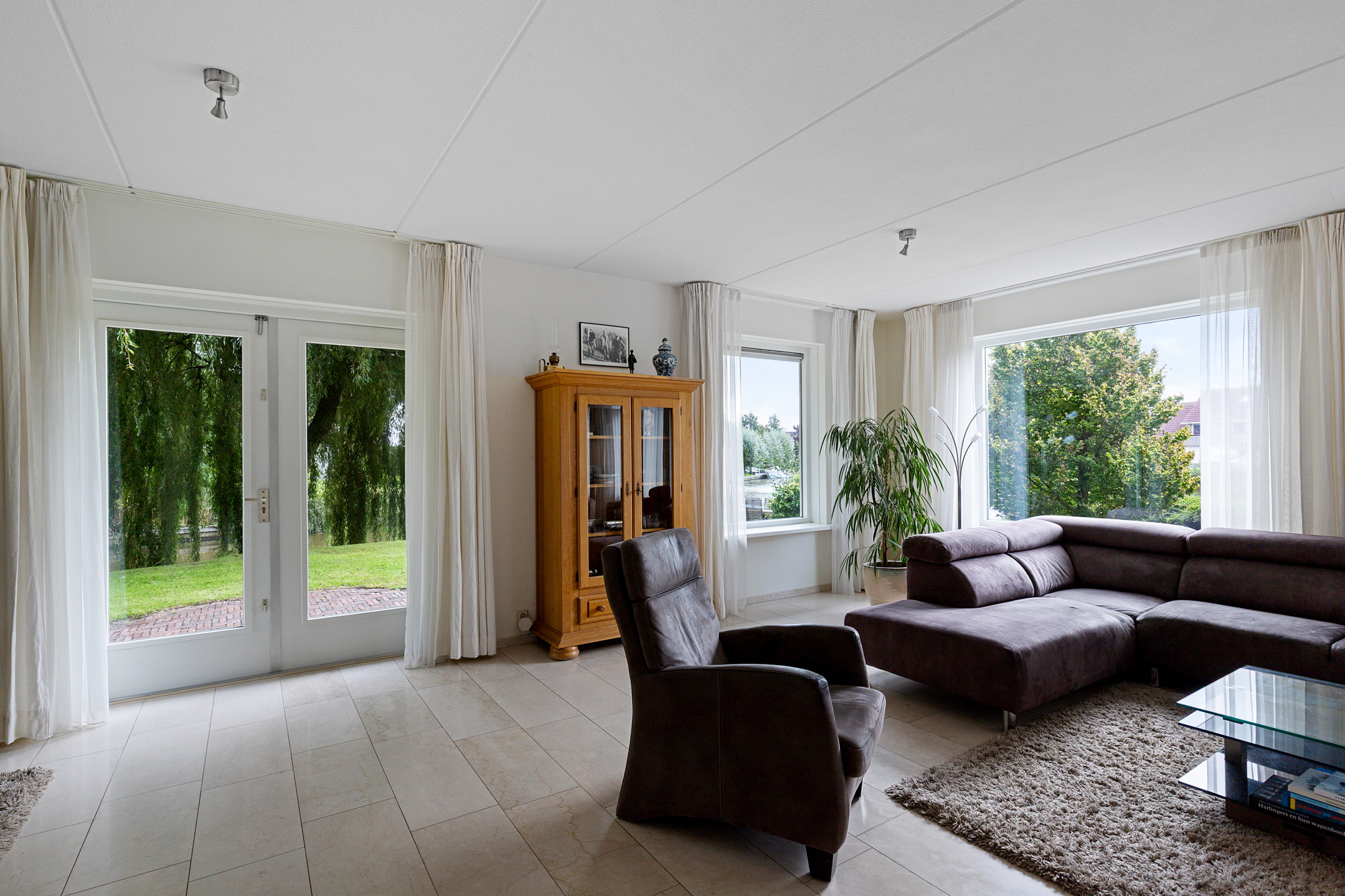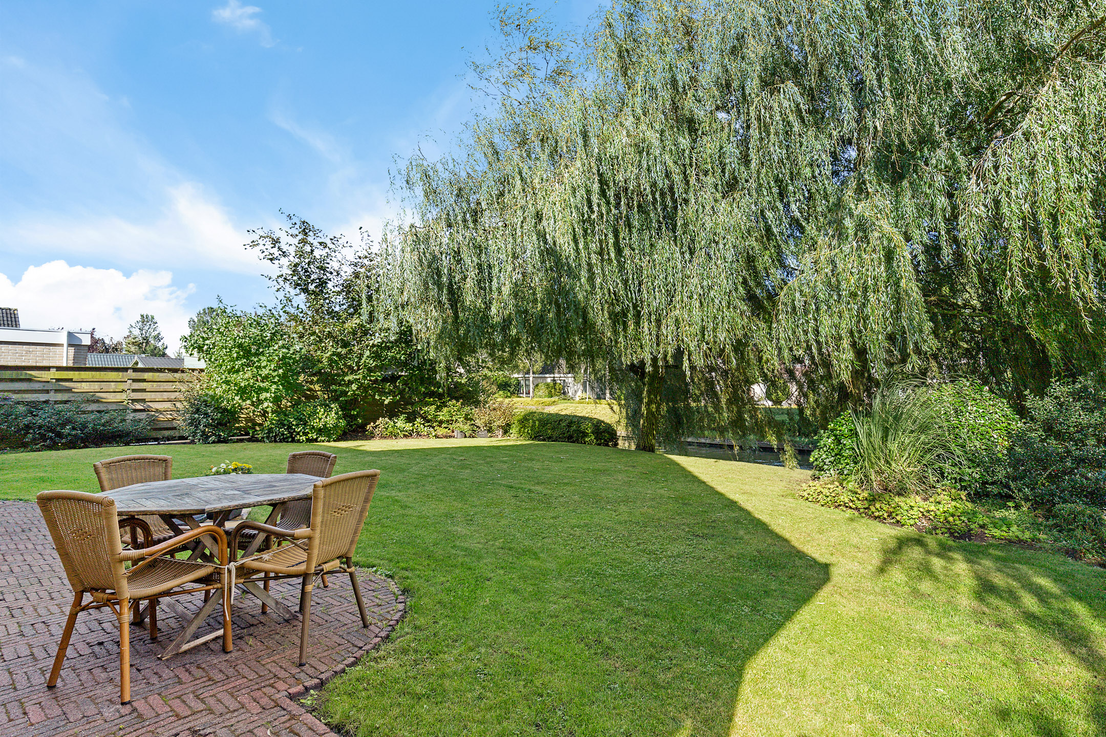 Bij het betreden van de woonkamer valt het zicht op de prachtige waterpartijen aan de groene tuin direct op. Wat een plek! Door de vele ramen aan alle kanten van de woonkamer komt er veel licht binnen. De verzorgde tuin rondom de woning heeft prachtige statige treurwilgen aan de waterkant hetgeen veel privacy biedt. Iets dat benadrukt wordt doordat de woning is gelegen op een hoekperceel aan een doodlopende straat van deze ruim opgezette wijk.