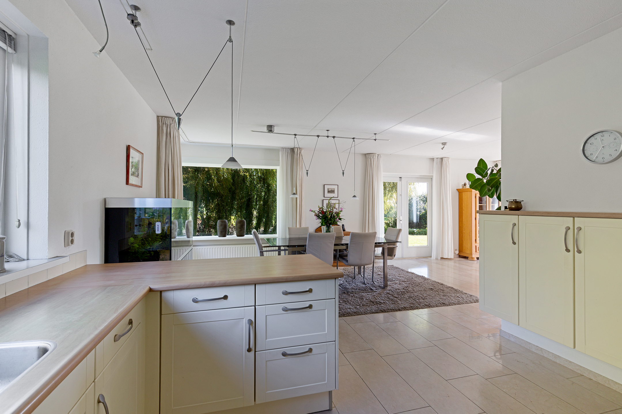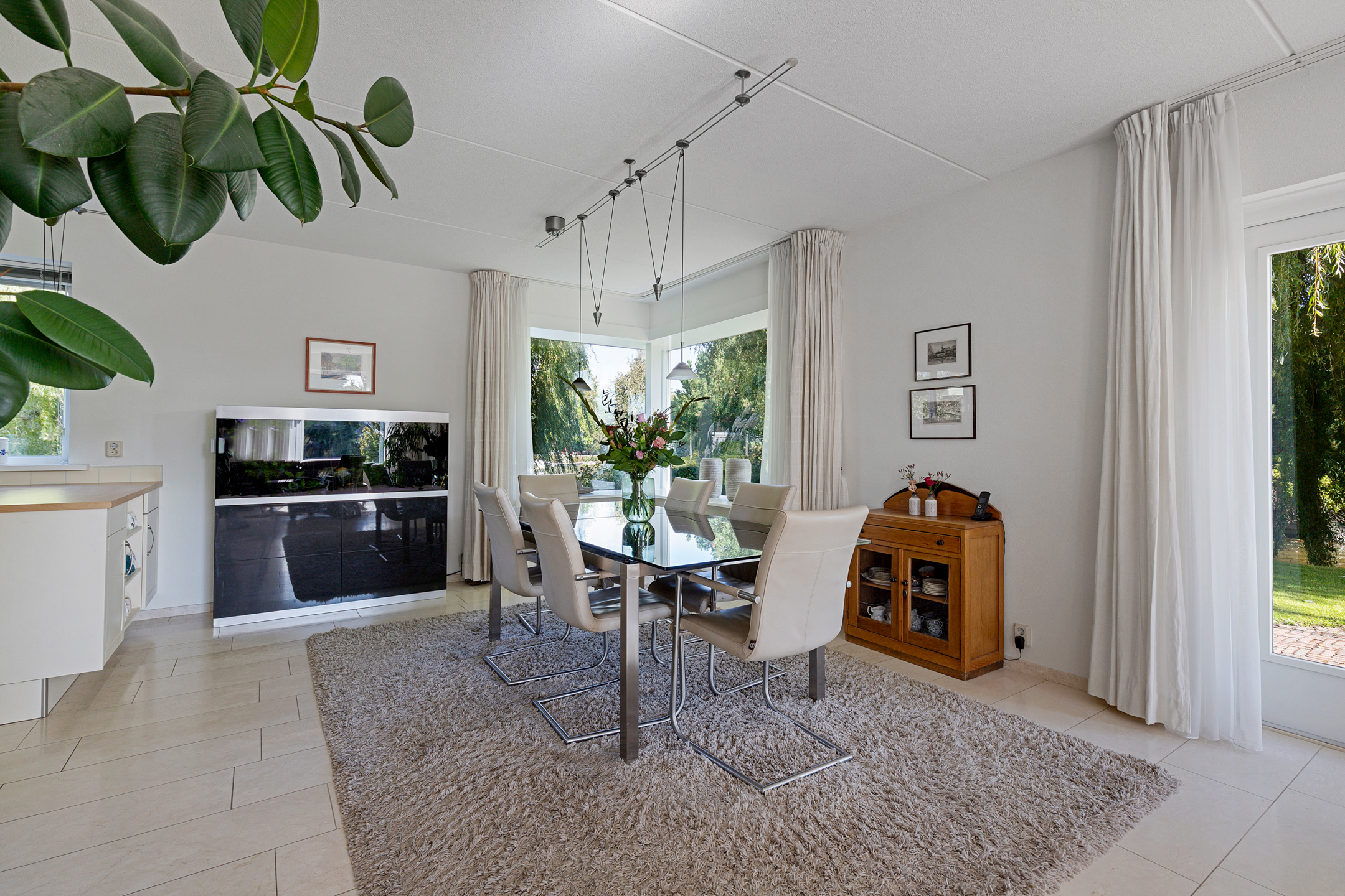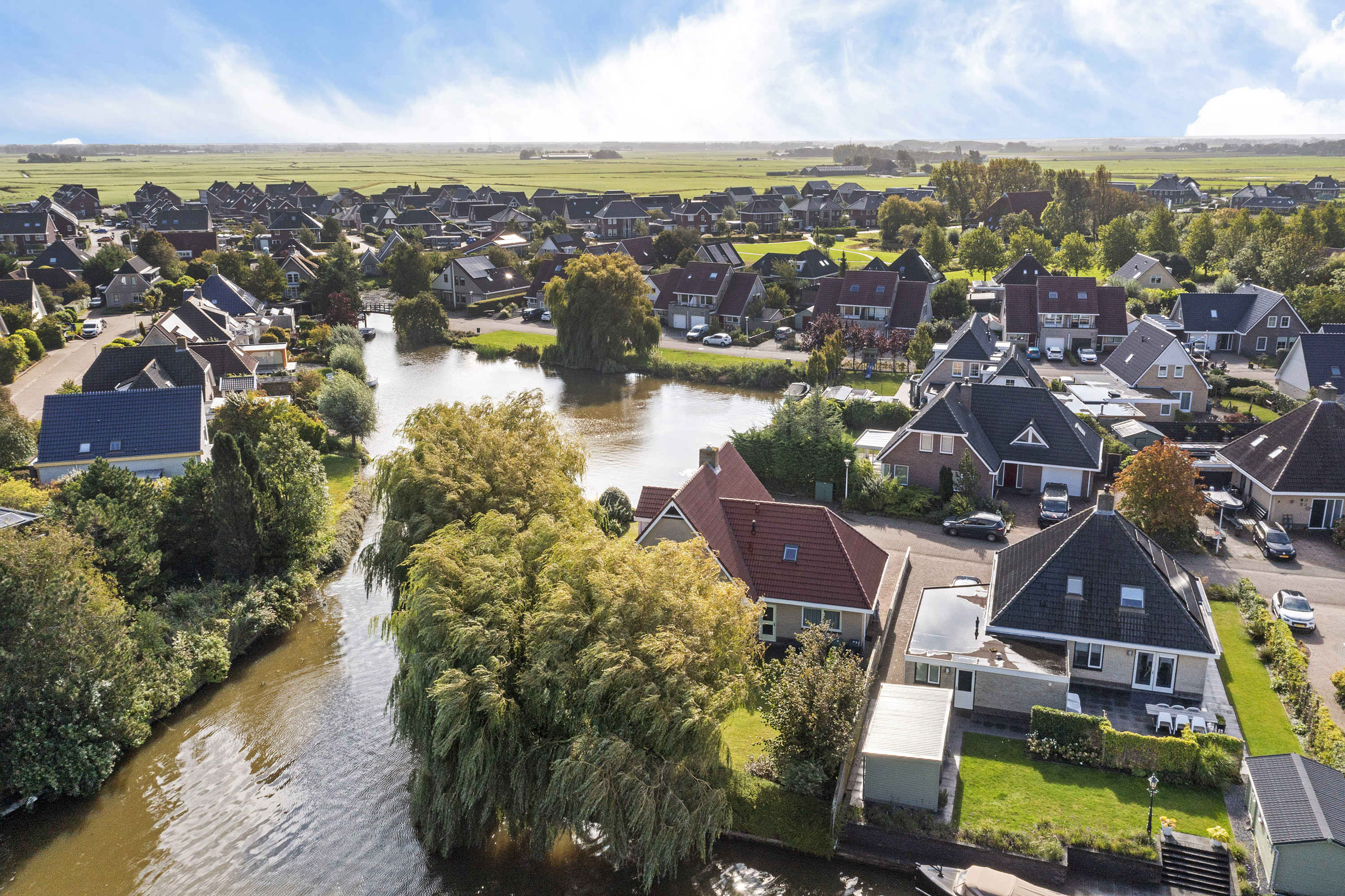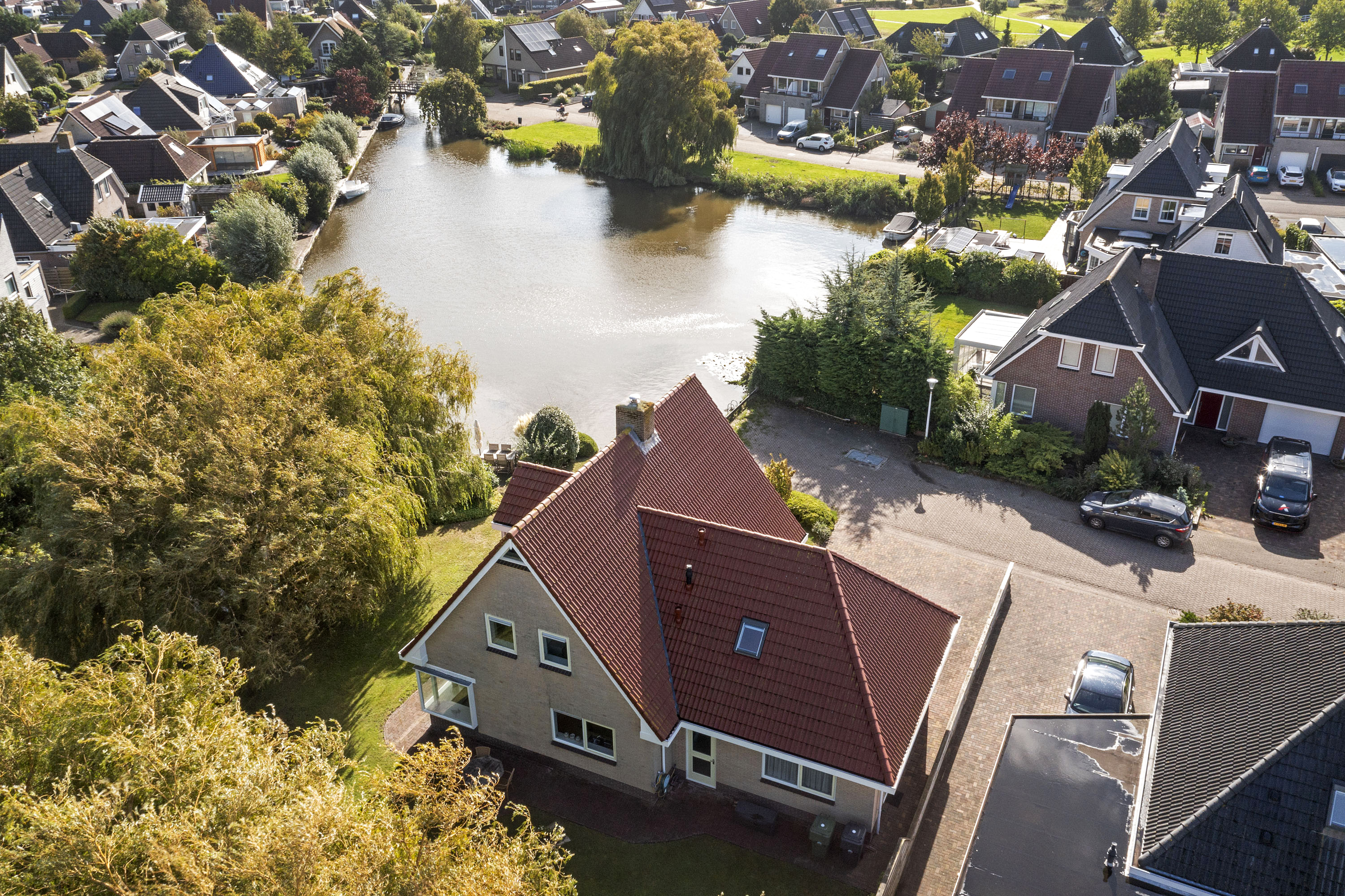 Bij het betreden van de woonkamer valt het zicht op de prachtige waterpartijen aan de groene tuin direct op. Wat een plek! Door de vele ramen aan alle kanten van de woonkamer komt er veel licht binnen. De verzorgde tuin rondom de woning heeft prachtige statige treurwilgen aan de waterkant hetgeen veel privacy biedt. Iets dat benadrukt wordt doordat de woning is gelegen op een hoekperceel aan een doodlopende straat van deze ruim opgezette wijk.