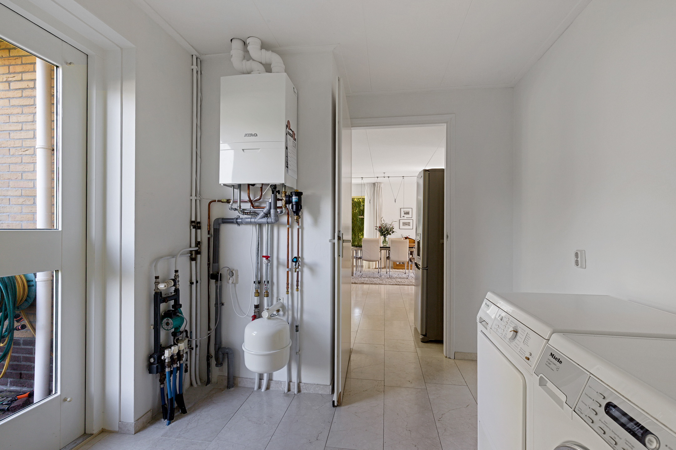 In de naastgelegen bijkeuken is genoeg ruimte voor de witgoedapparatuur. De bijkeuken heeft een deur naar de tuin en een deur naar de inpandige garage.