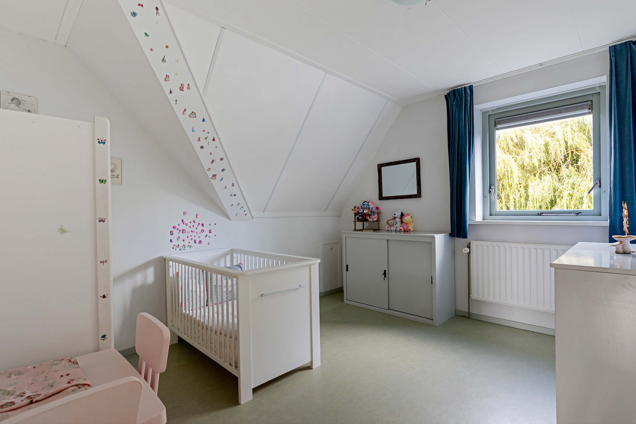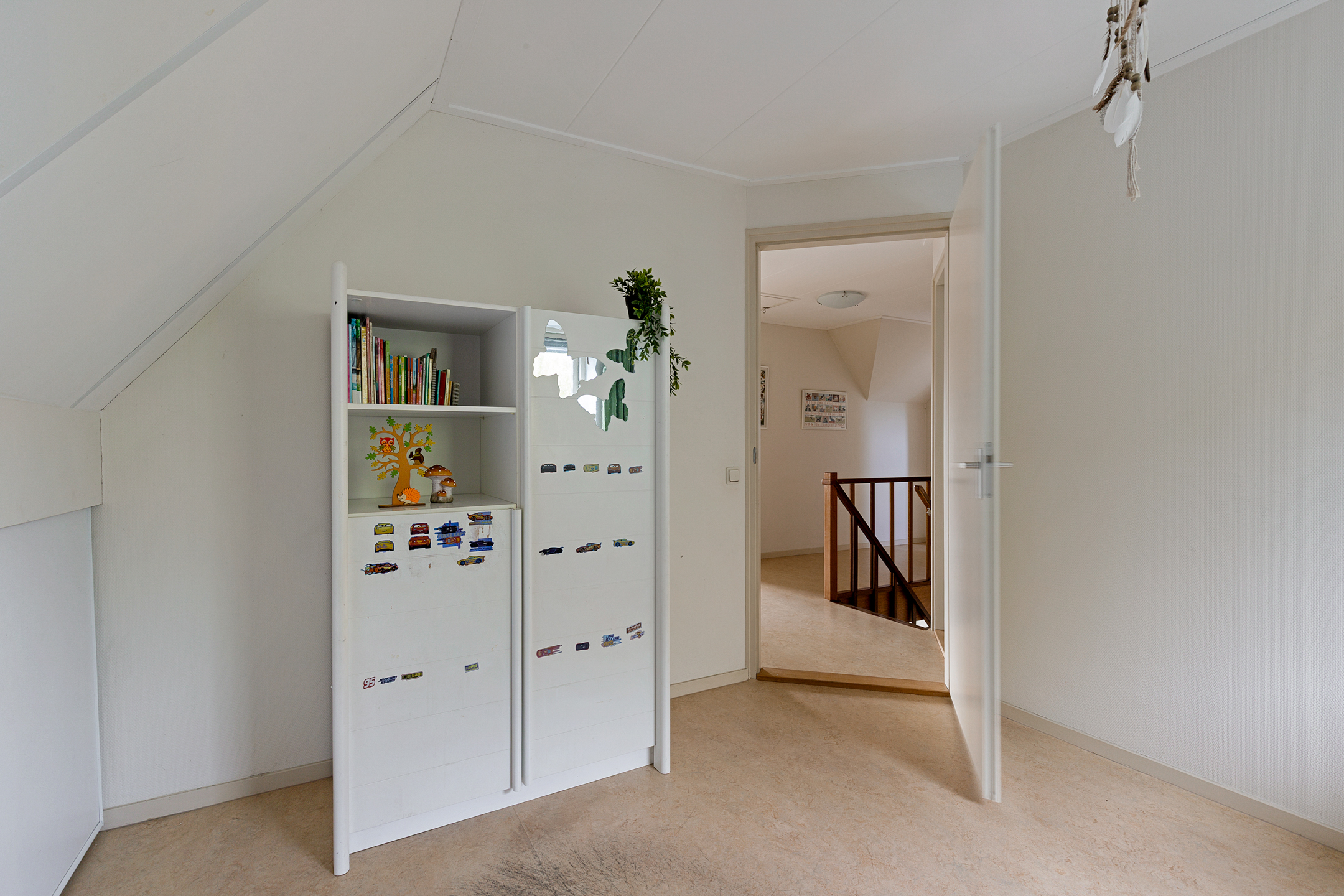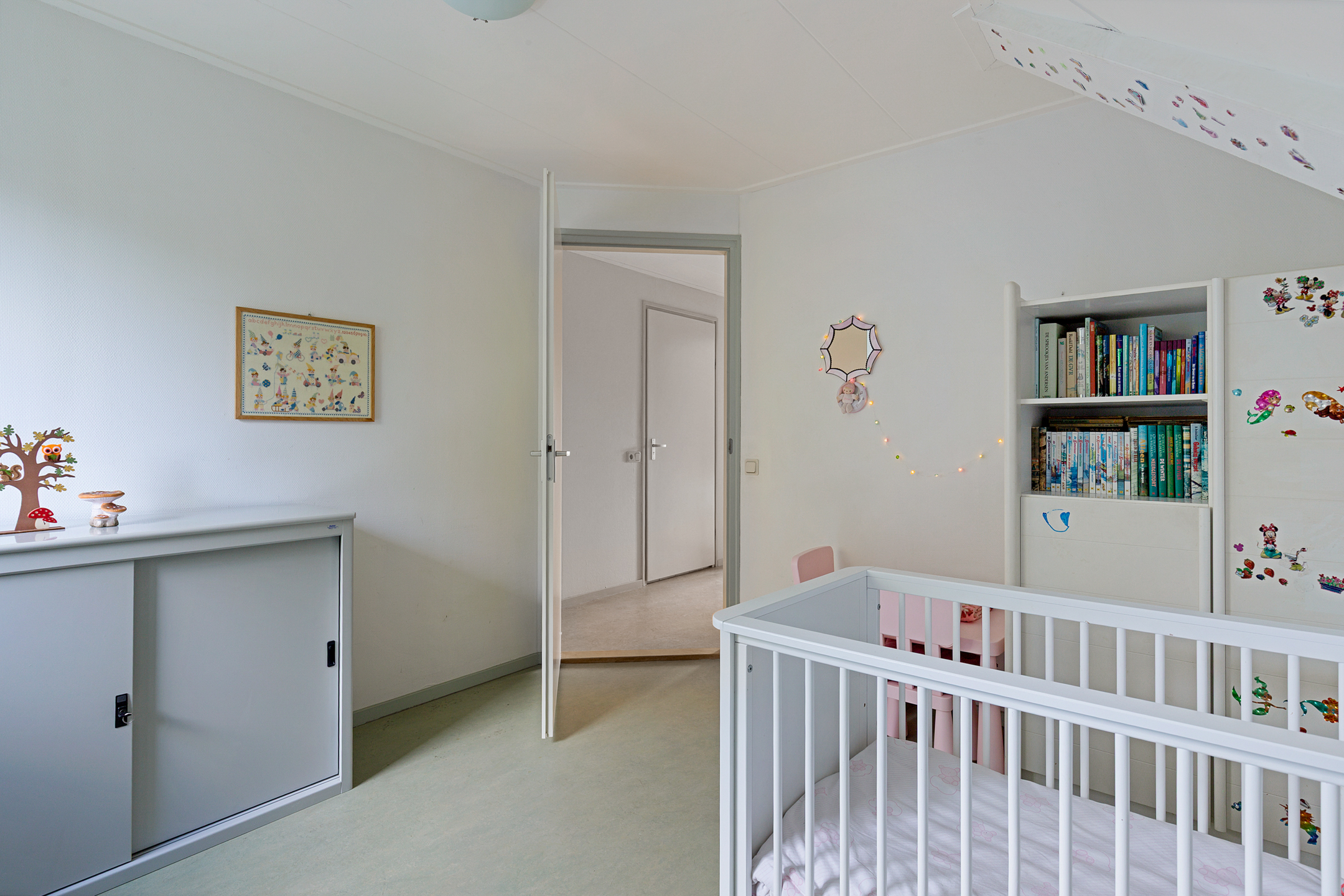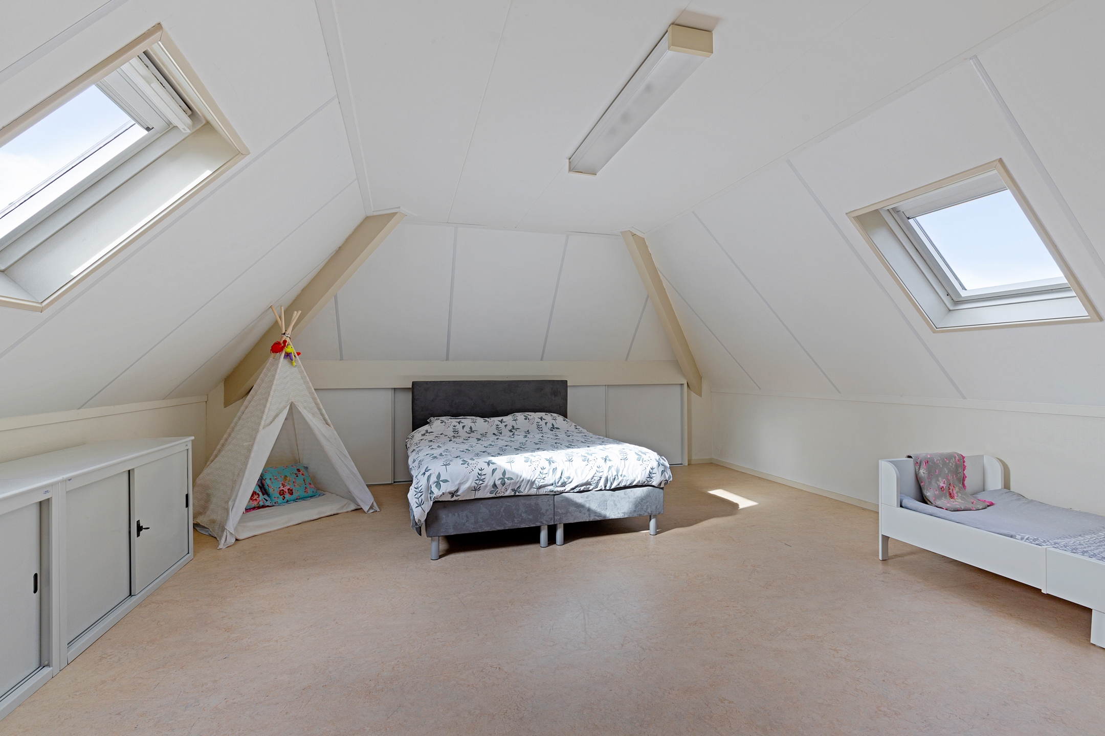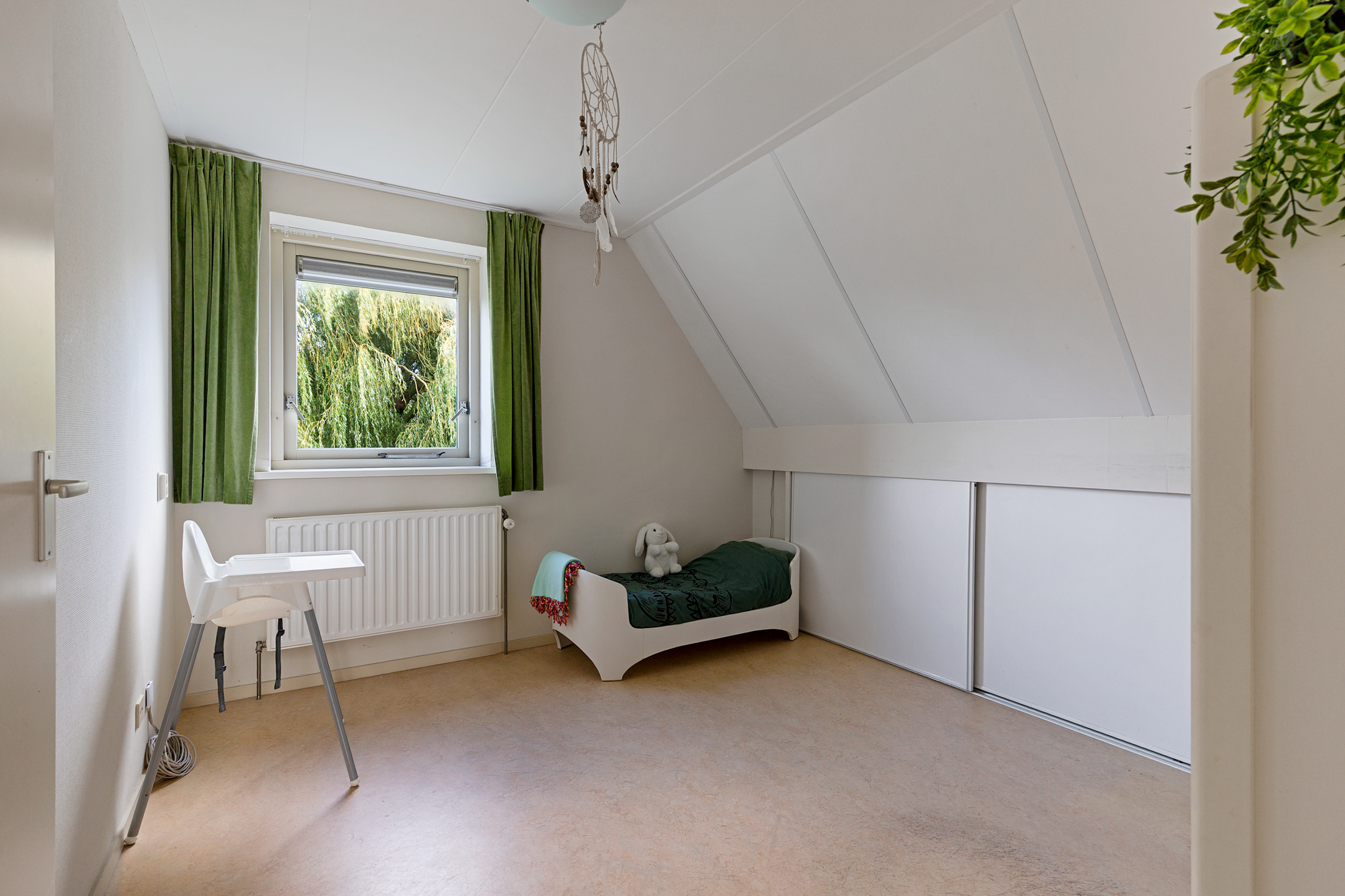 De verdieping is voorzien van een marmoleum vloer en de slaapkamers worden verwarmd met radiatoren.
