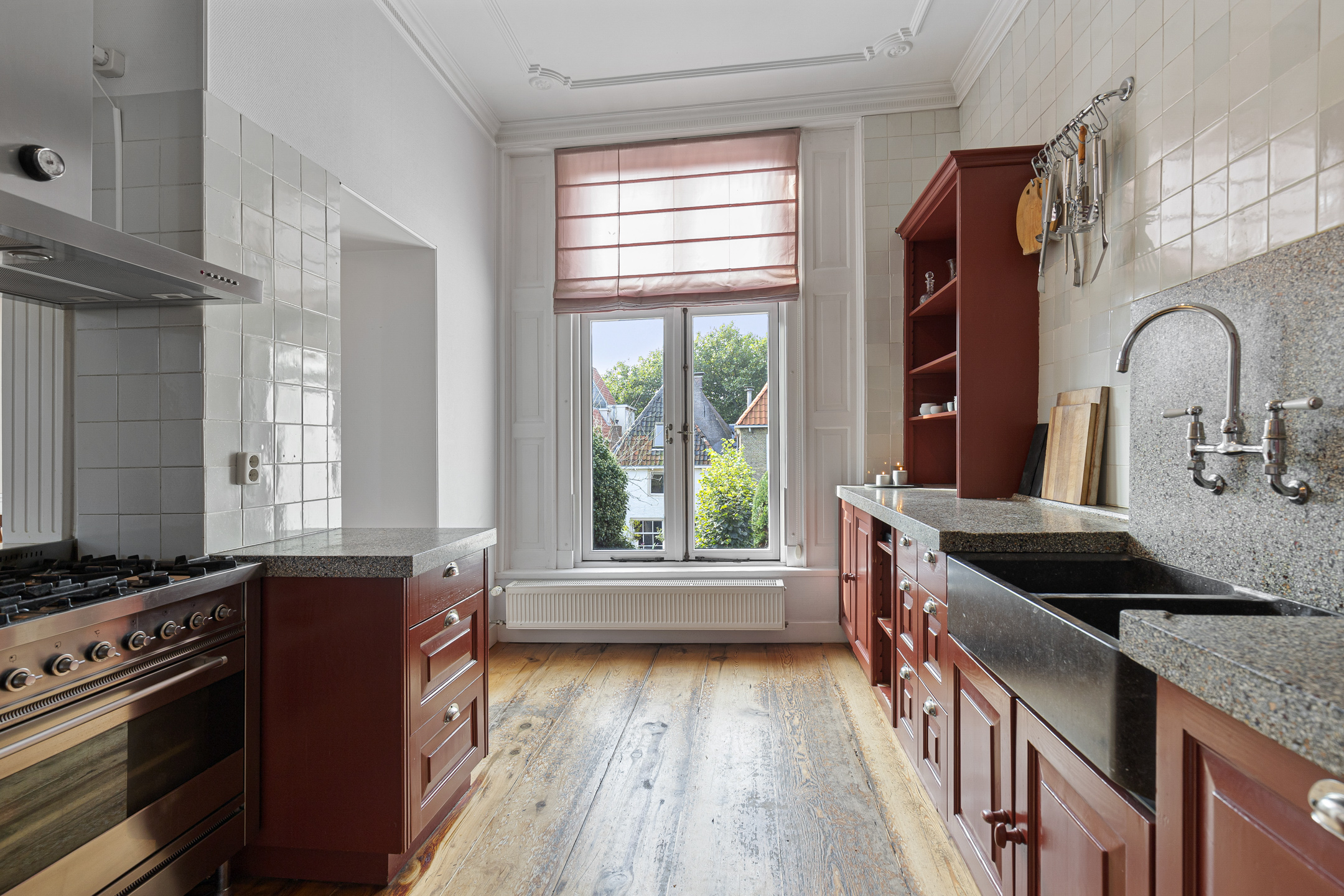 Op de eerste verdieping bevindt zich de imposante woonkamer met kamerhoge ramen, originele schuifmechanieken en een weids uitzicht over de haven, het raadhuis en de Leeuwenbrug. Een schouwspel dat door de getijden van eb en vloed voortdurend verandert, met als levendig decor de passanten met hun plezier- en zeiljachten. Aan de achterzijde liggen de eetkamer en de authentieke keuken, voorzien van fraaie Friese witjes en granieten werkbladen.
