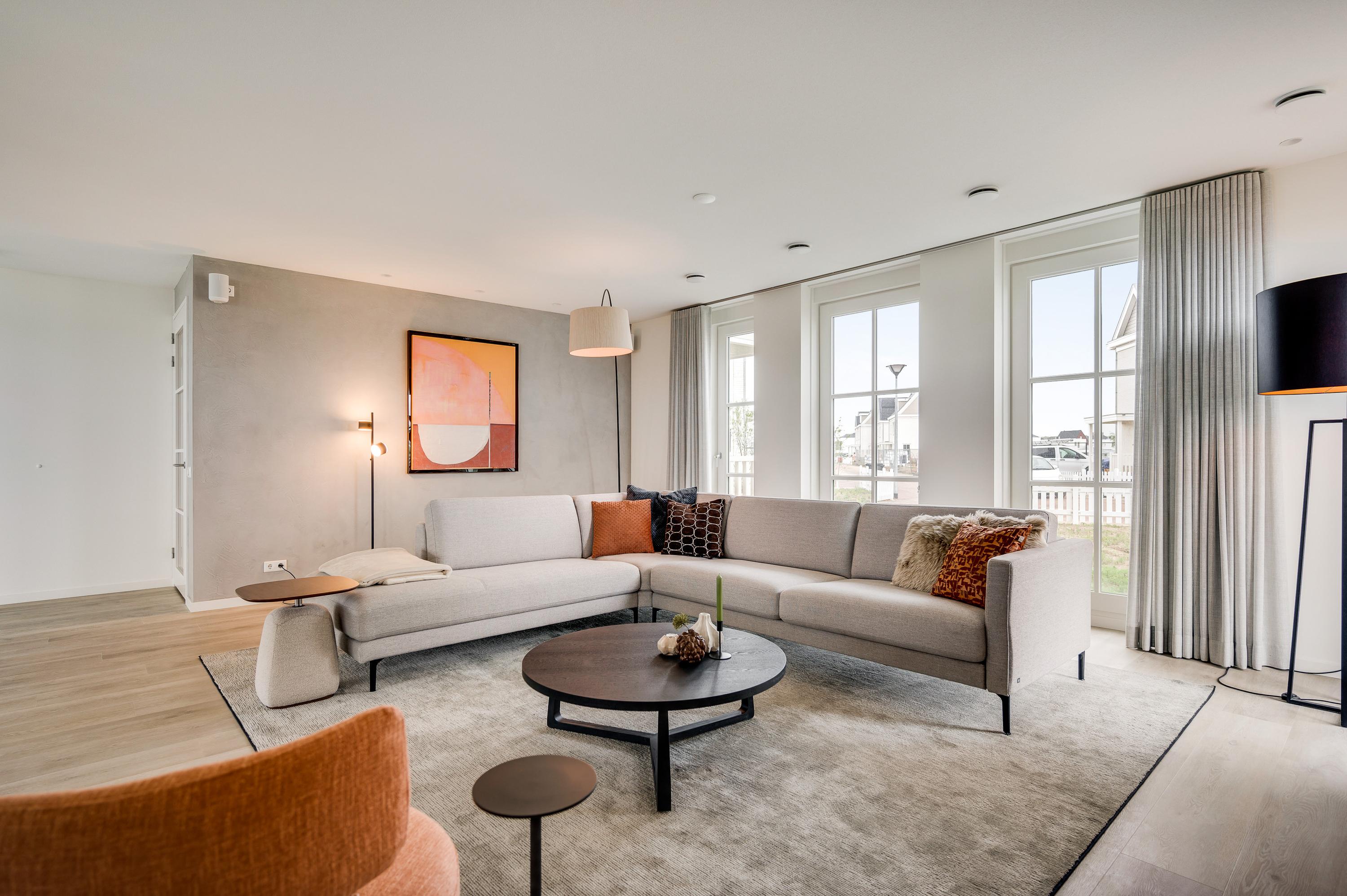 De living ligt aan de voorzijde van het huis. Door de diepe voortuin en grote afstand tot de straat, zit je hier ook heerlijk rustig en vrij. Door de grote raampartijen aan zowel de voor-/ als achterkant van de woning komt er een zee van licht binnen.