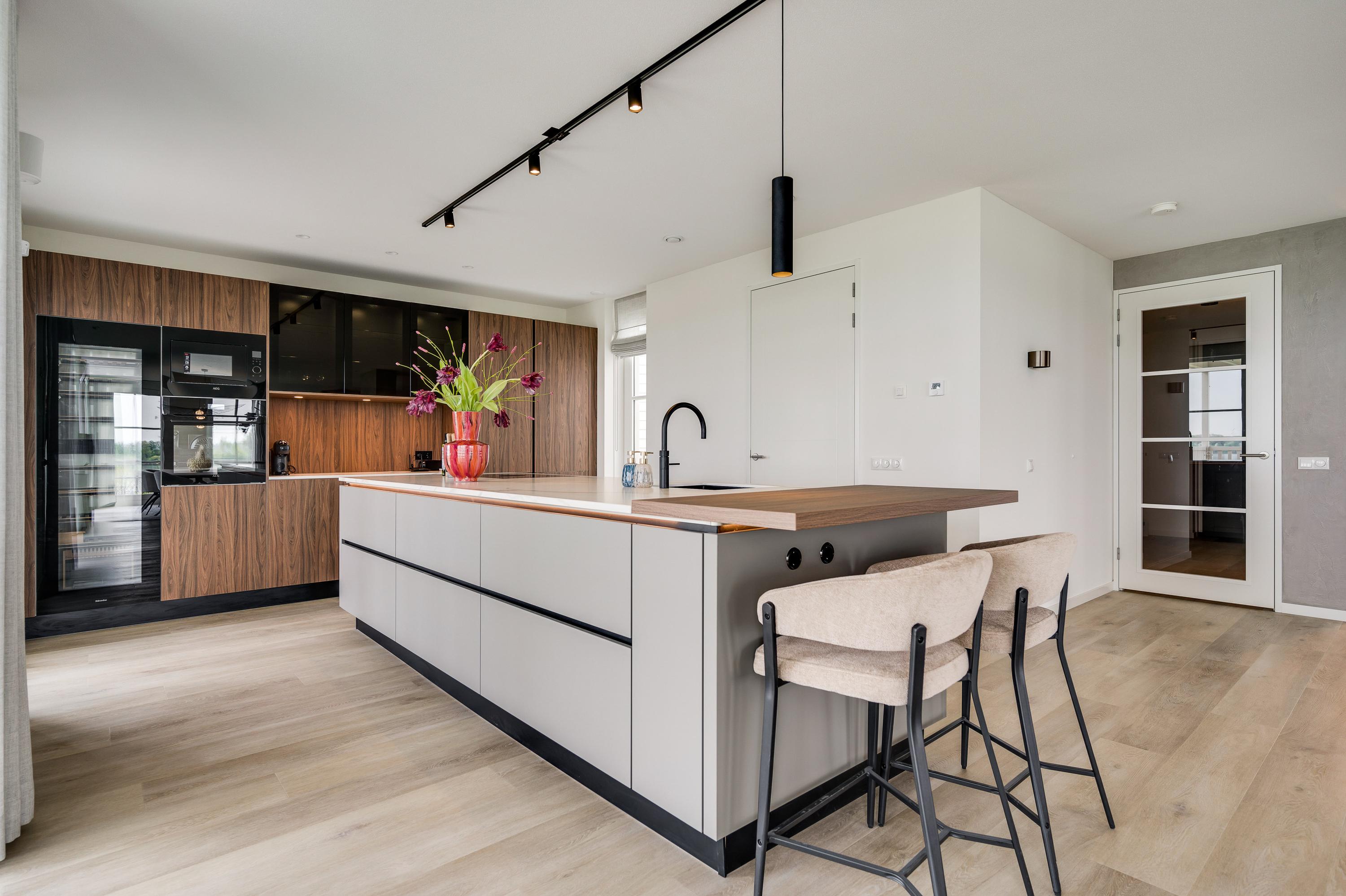 Aan de kopse kant van het eiland is een barretje gecreëerd. Hier geniet je in de ochtend van een kopje koffie en de krant of maken de kinderen huiswerk terwijl je aan het koken bent. Aan alle gemakken is gedacht, zo is er een quooker met warm en koud water, een Bora inductiekookplaat, een vaatwasser, koelkast, diepvries en wijnklimaatkast van Miele en een oven en magnetron van AEG.