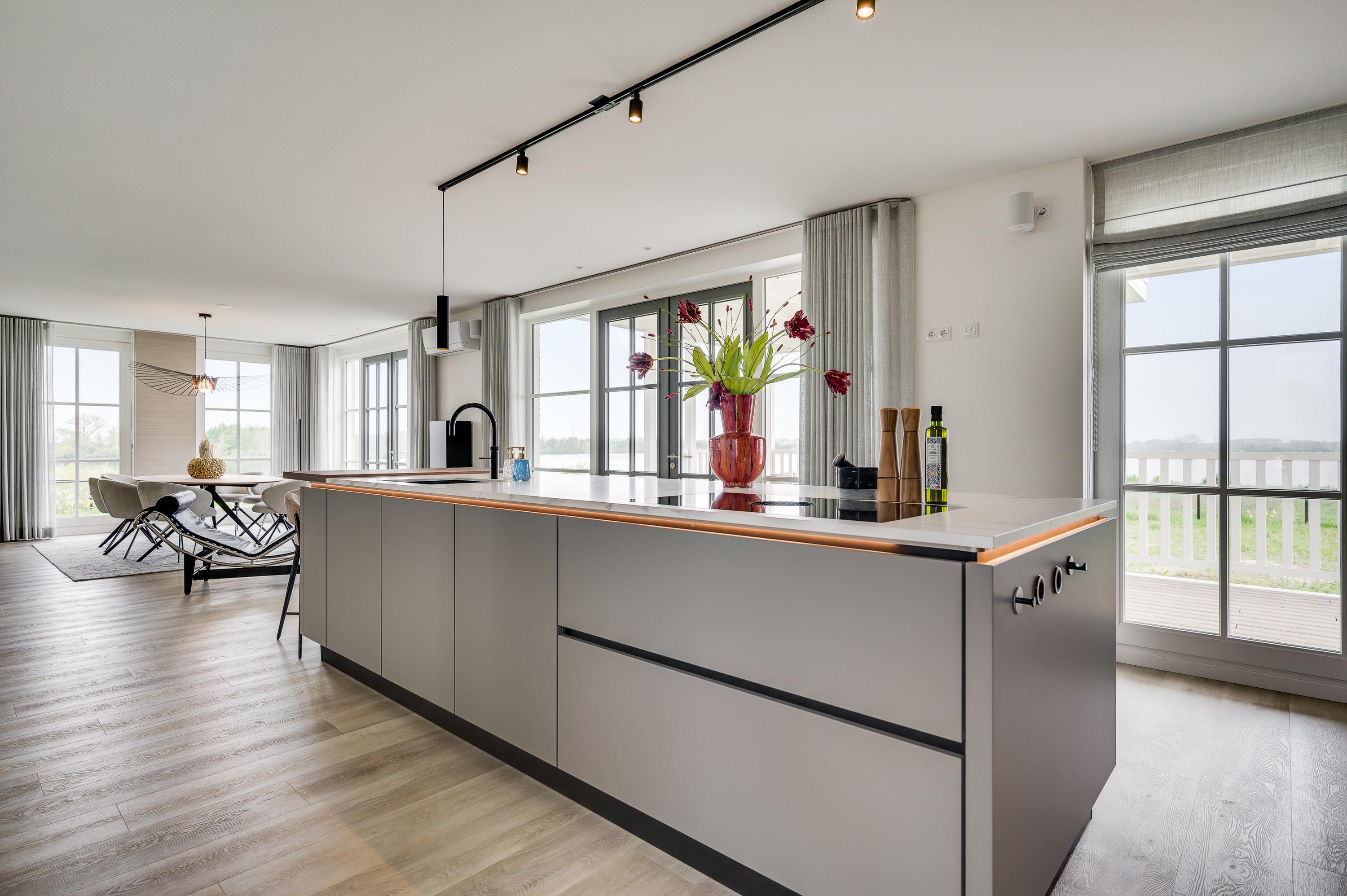 De eyecatcher in deze ruimte is de royale gashaard, welke op een luxe manier dient als roomdevider tussen de living en de eetkamer.