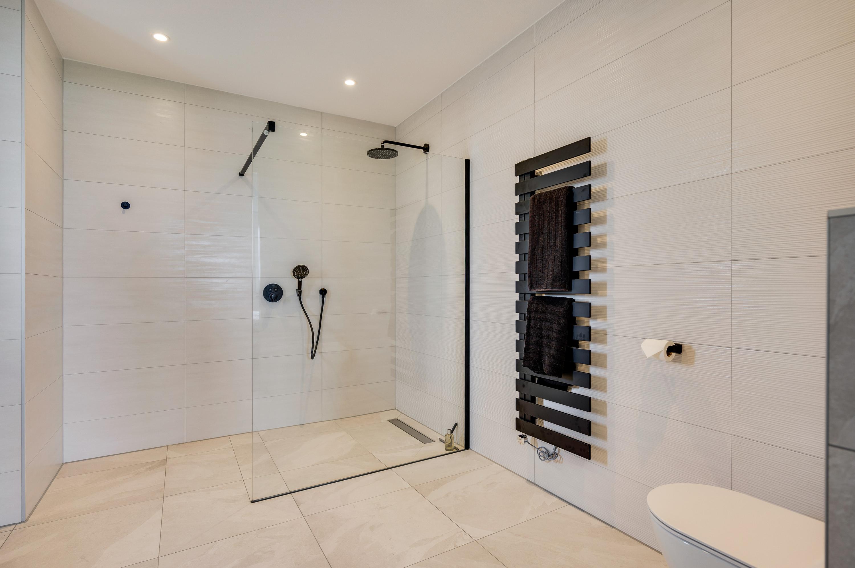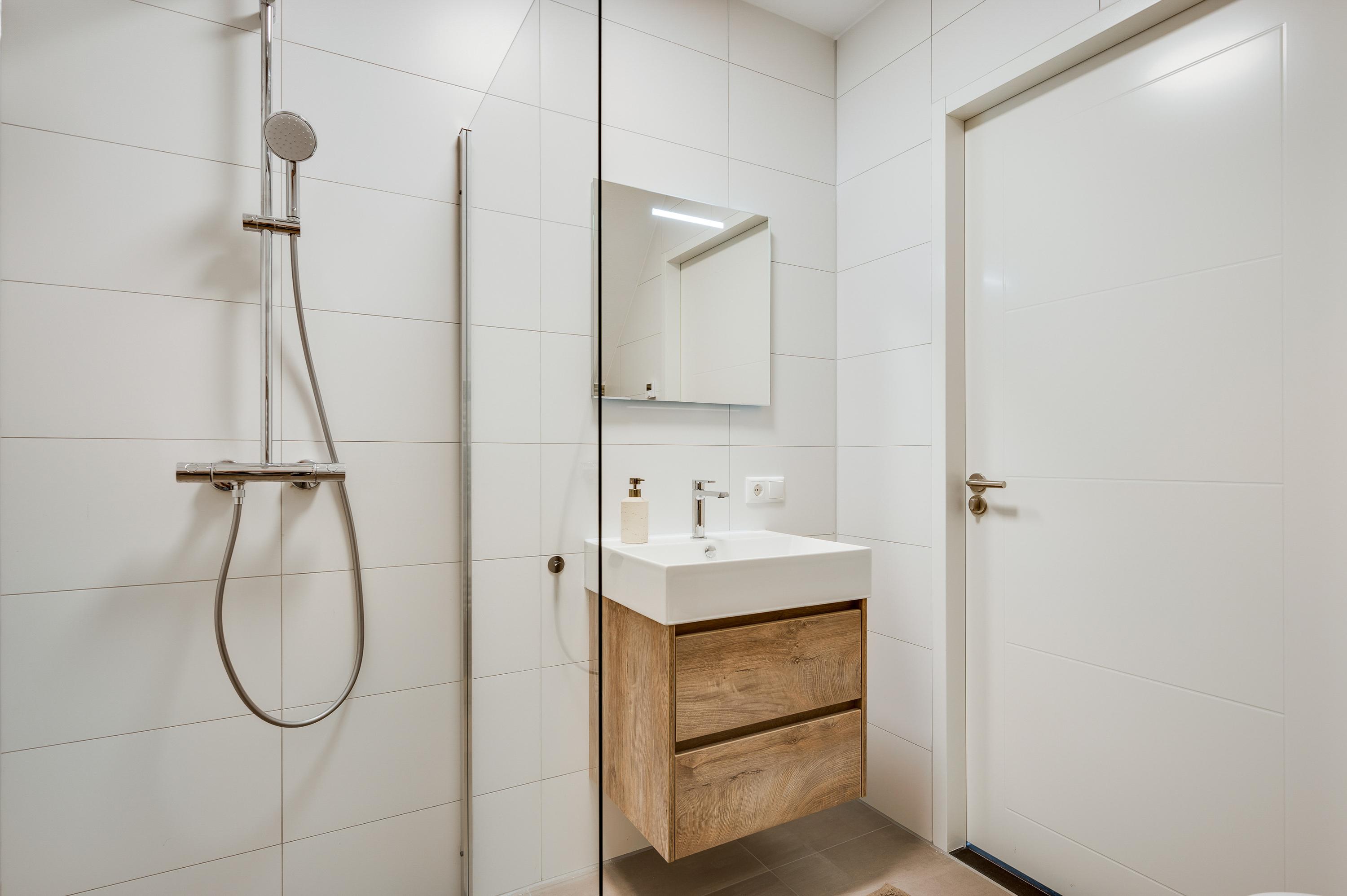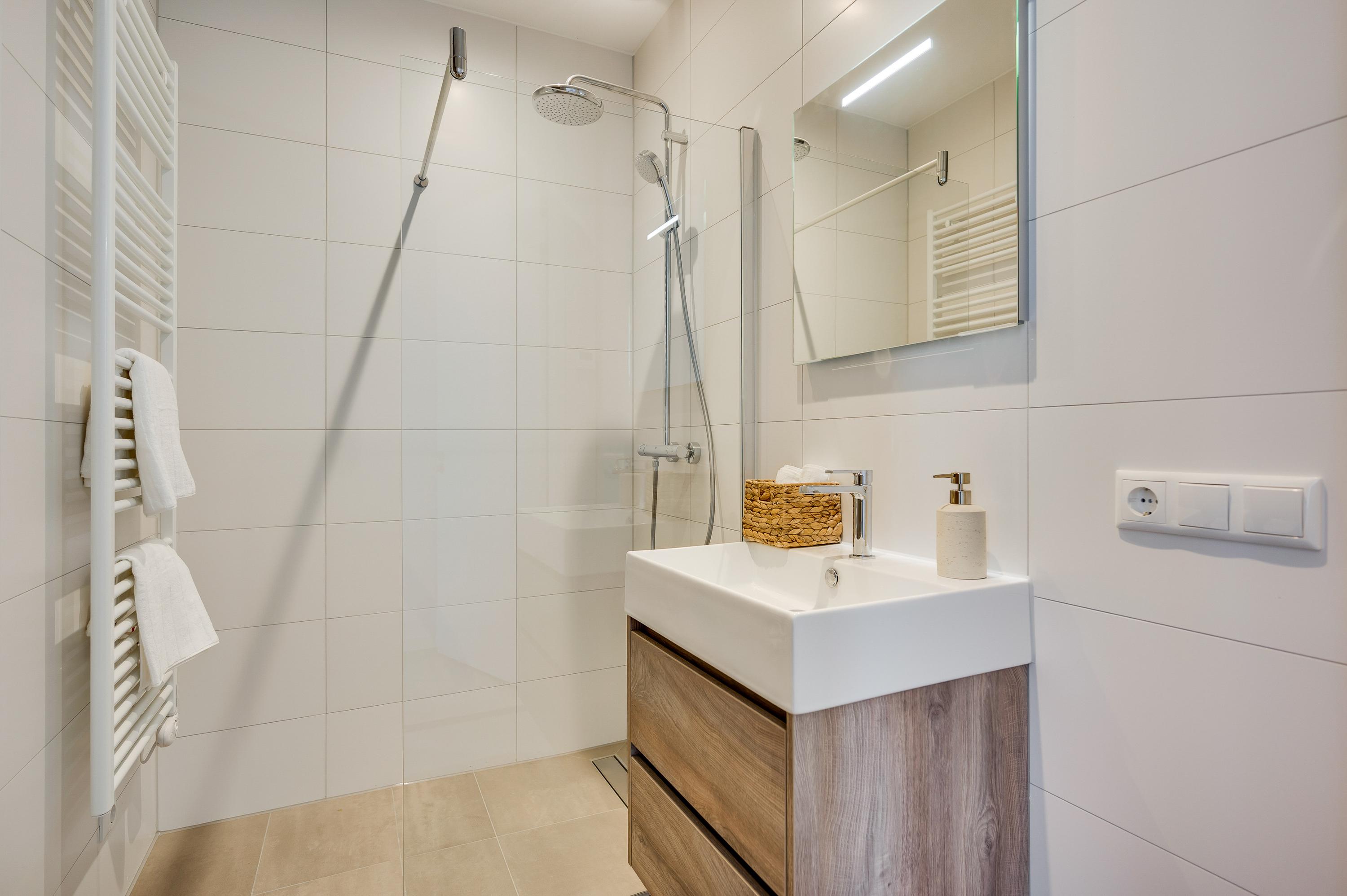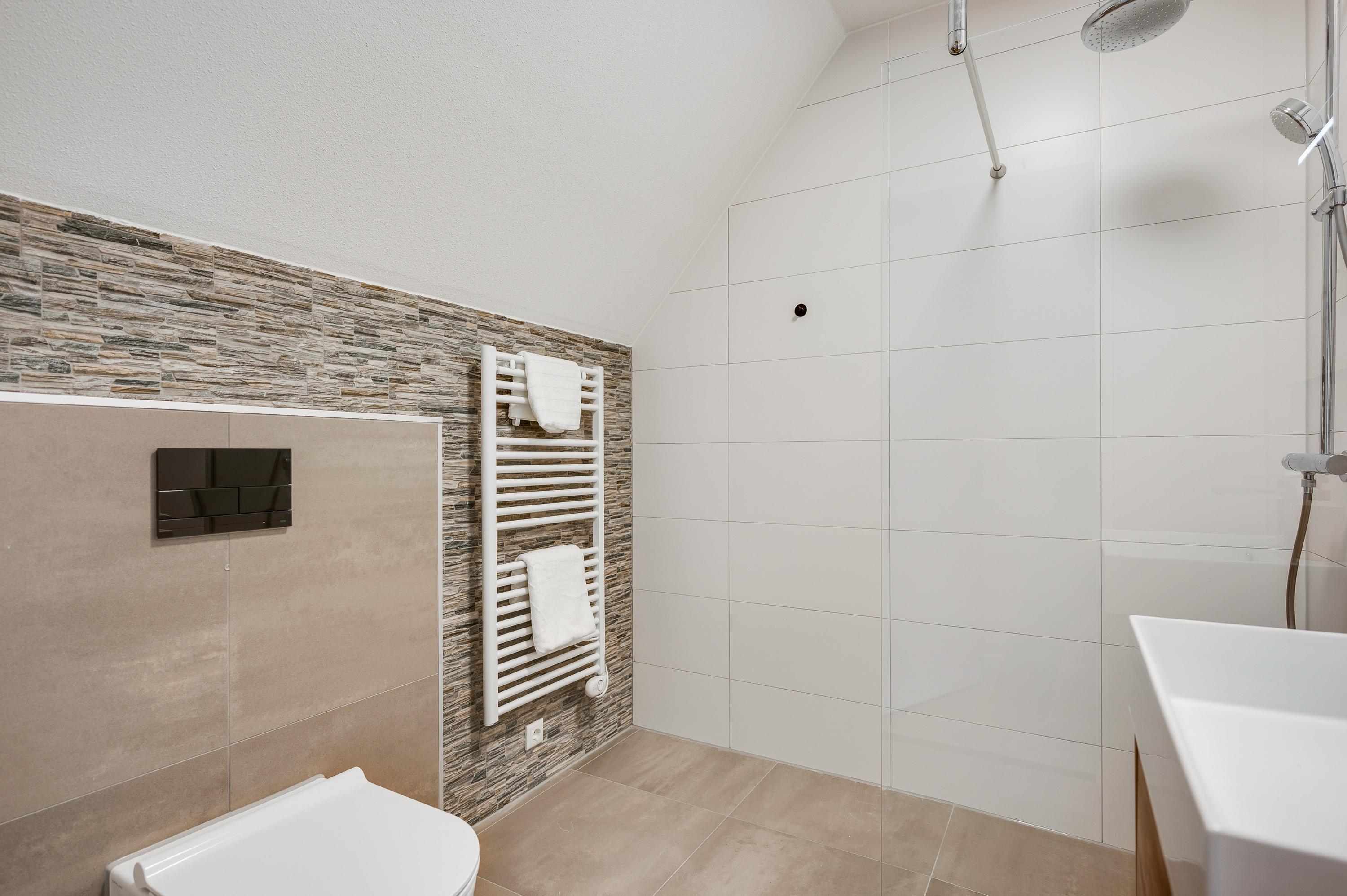 De tweede slaapkamer is gelegen aan de voorkant van de woning en heeft eveneens een eigen badkamer. Deze is voorzien van een inloopdouche, wastafel en toilet.
