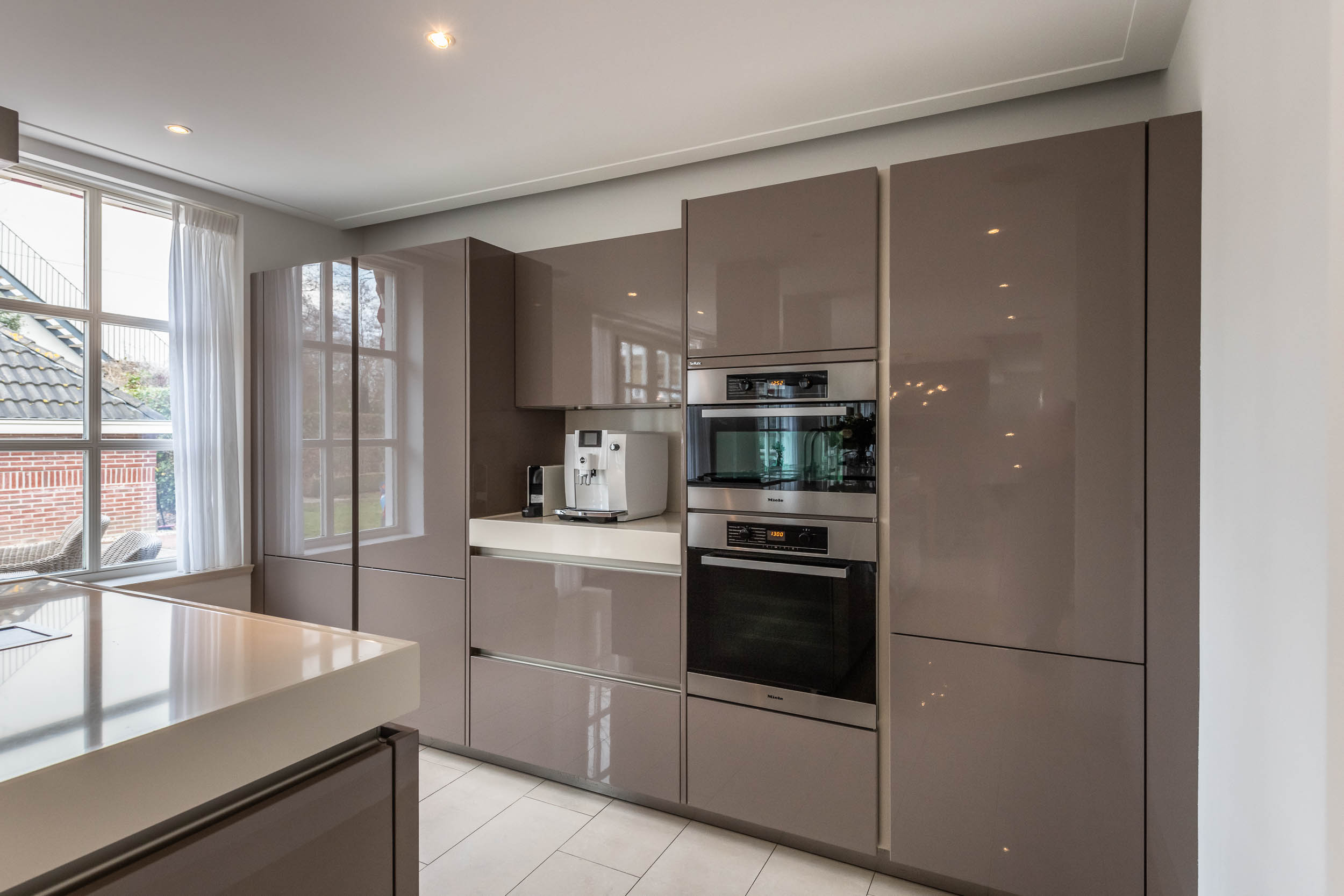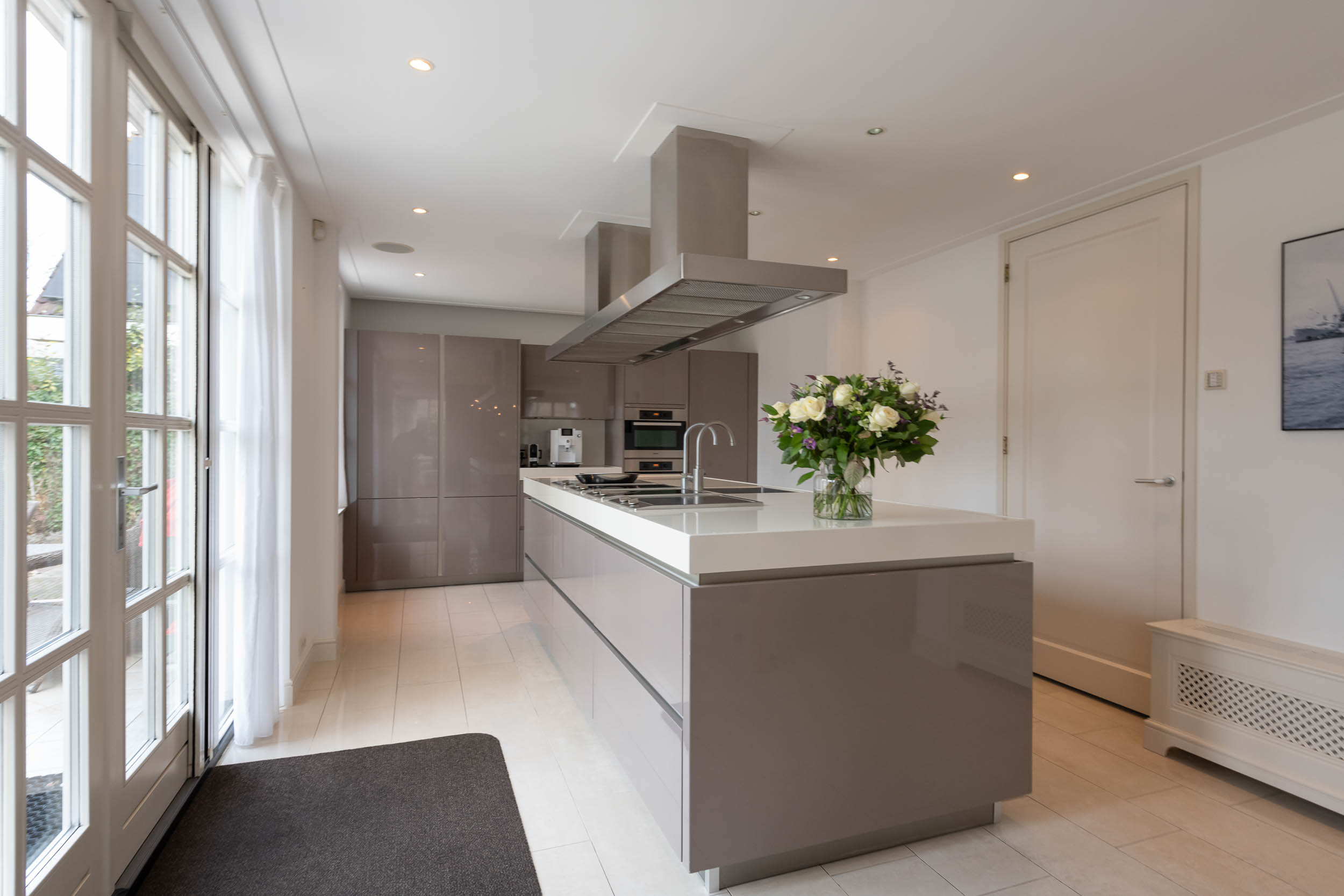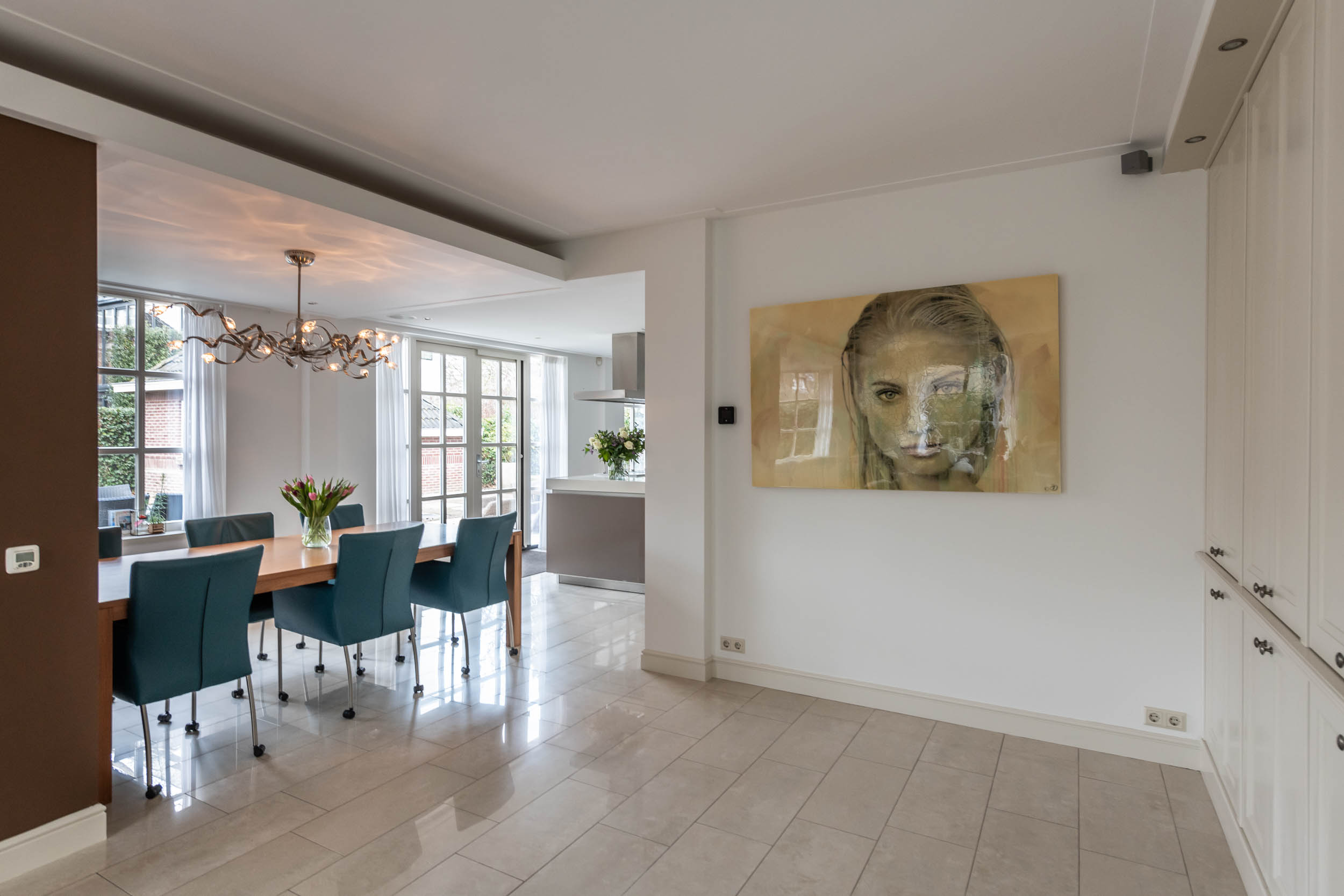 Begane grond: Entree, grote L-vormige hal met garderobekast en wc. Vanuit de hal is toegang tot de garage aan de rechterzijde en toegang tot de woonkamer aan de linkerzijde. Aan de voorzijde van het huis is de eetkamer en een kantoorruimte. Via de schuifdeuren van de eetkamer bereik je de achterzijde met een sfeervolle zitkamer met (gas-) open haard, een brede kastenwand en dubbele openslaande deuren naar de achtertuin. De royale moderne SieMatic woonkeuken staat in open verbinding met de zitkamer en heeft een groot kookeiland met o.a. een ingebouwde teppanyaki plaat en een inductie-wok. Er is een wand met diverse moderne keukenapparatuur. In de bijkeuken, bereikbaar via de garage en de keuken, is de wasmachine aansluiting en een keukenblok met spoelbak. De dubbele openslaande deuren geven toegang tot de prachtige, brede tuin met een -deels- overdekt terras, meerdere zitmogelijkheden en een stijlvol tuinhuis..