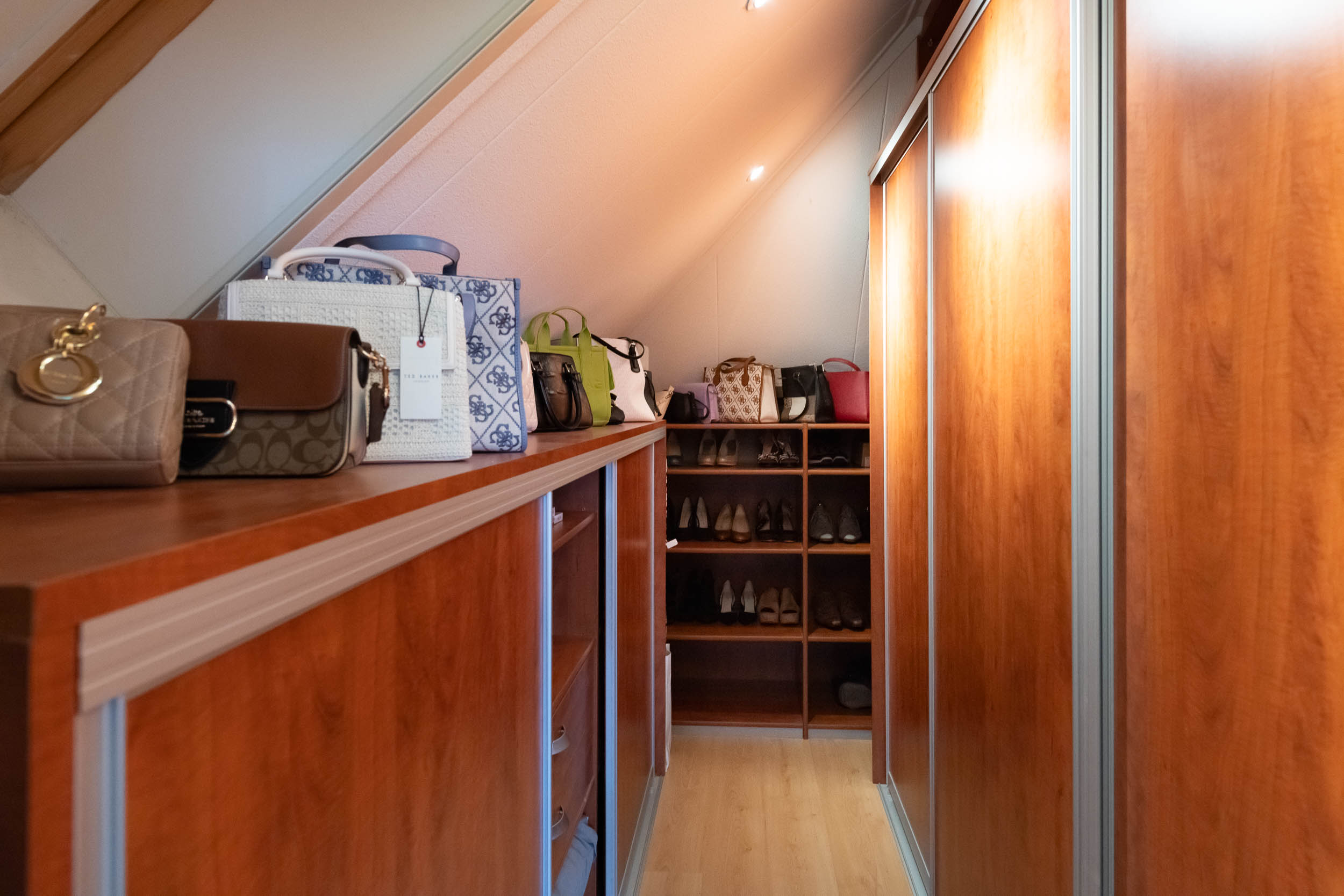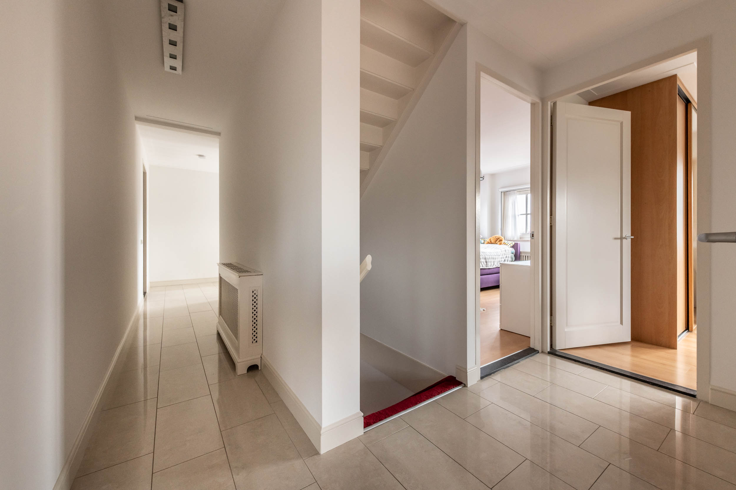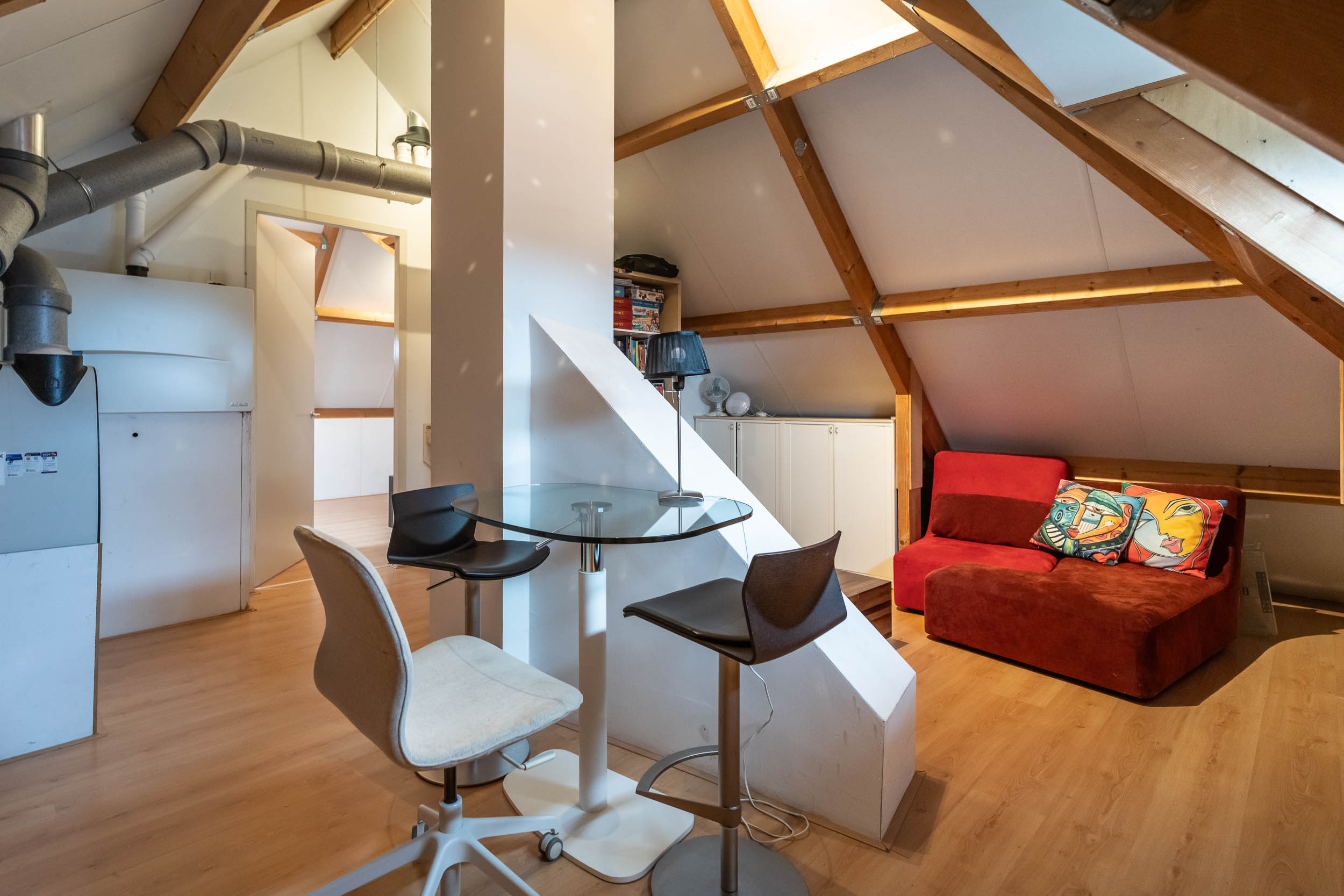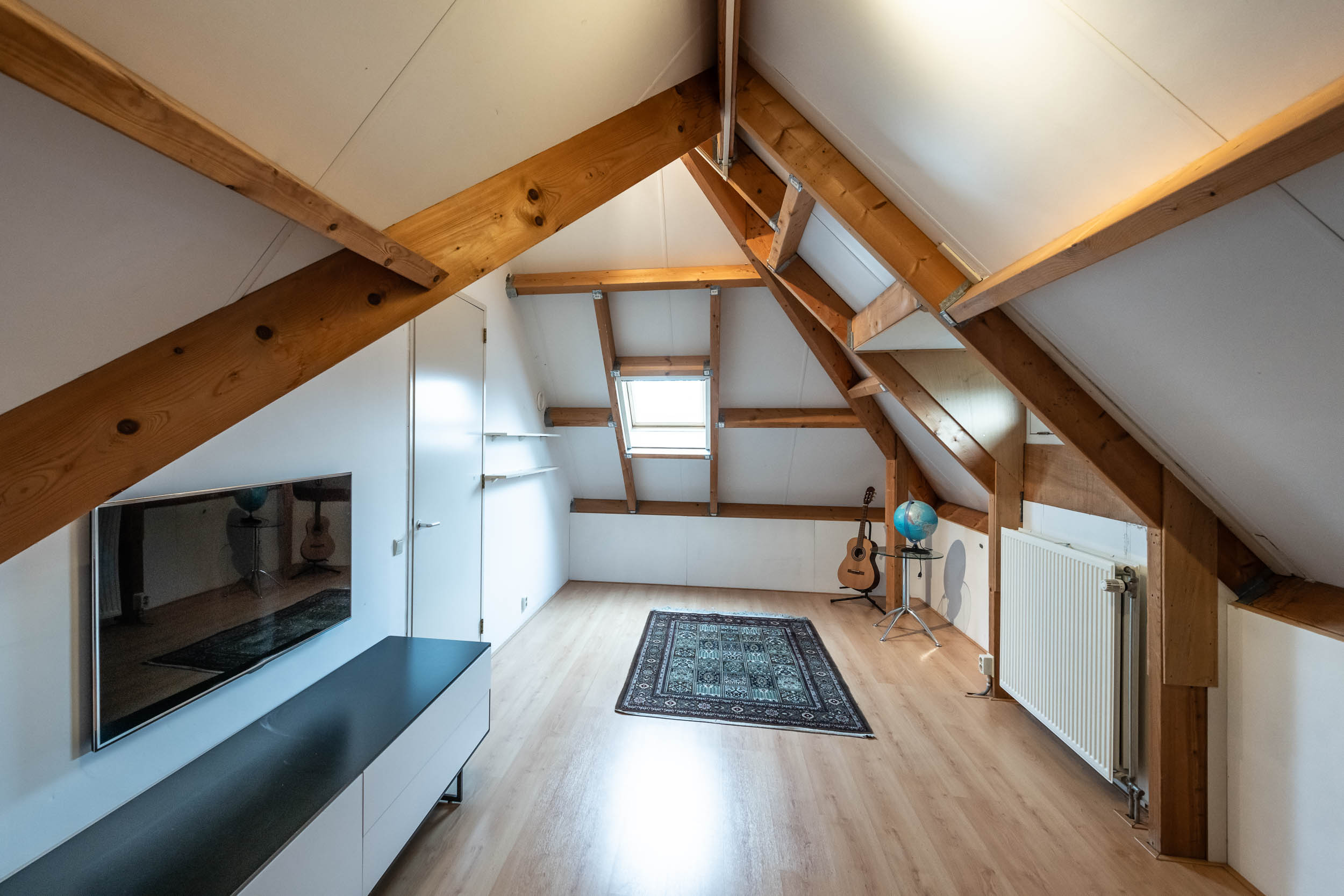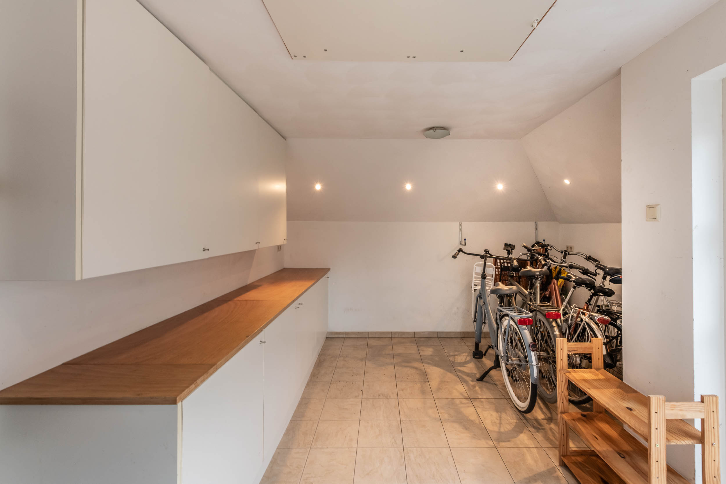2e verdieping: De multifunctionele zolderruimte, momenteel dienst doende als speelruimte, toegang tot 1 slaapkamer. Beide vertrekken zijn voorzien van een dakkapel. De slaapkamer geeft toegang tot een bergruimte.
