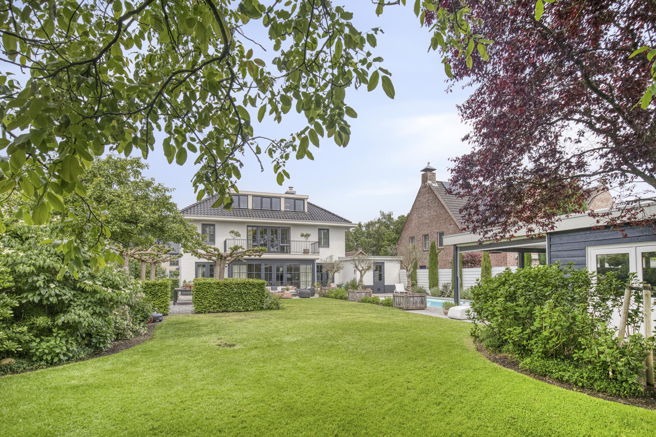 Aangelegde tuin rondom, zonnige gesitueerd op het zuiden, terras bestraat met natuurstenen sierbestrating en voorzien van borders, gazon, grindterras, elektra, tuinverlichting, buitenkraan, zwembad met elektrisch dek, buitendouche, een zonnescherm t.p.v. woonkamer en een poolhouse (vv. vloerverwarming) met aansluitend een veranda vv. buitenkeuken, lichtspots en zonne-screens;