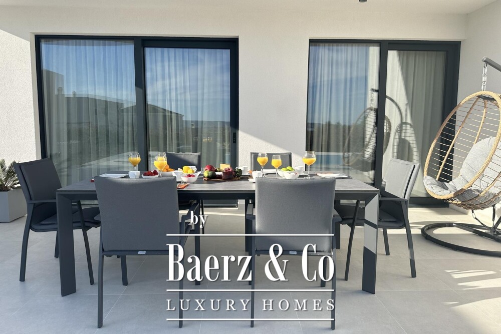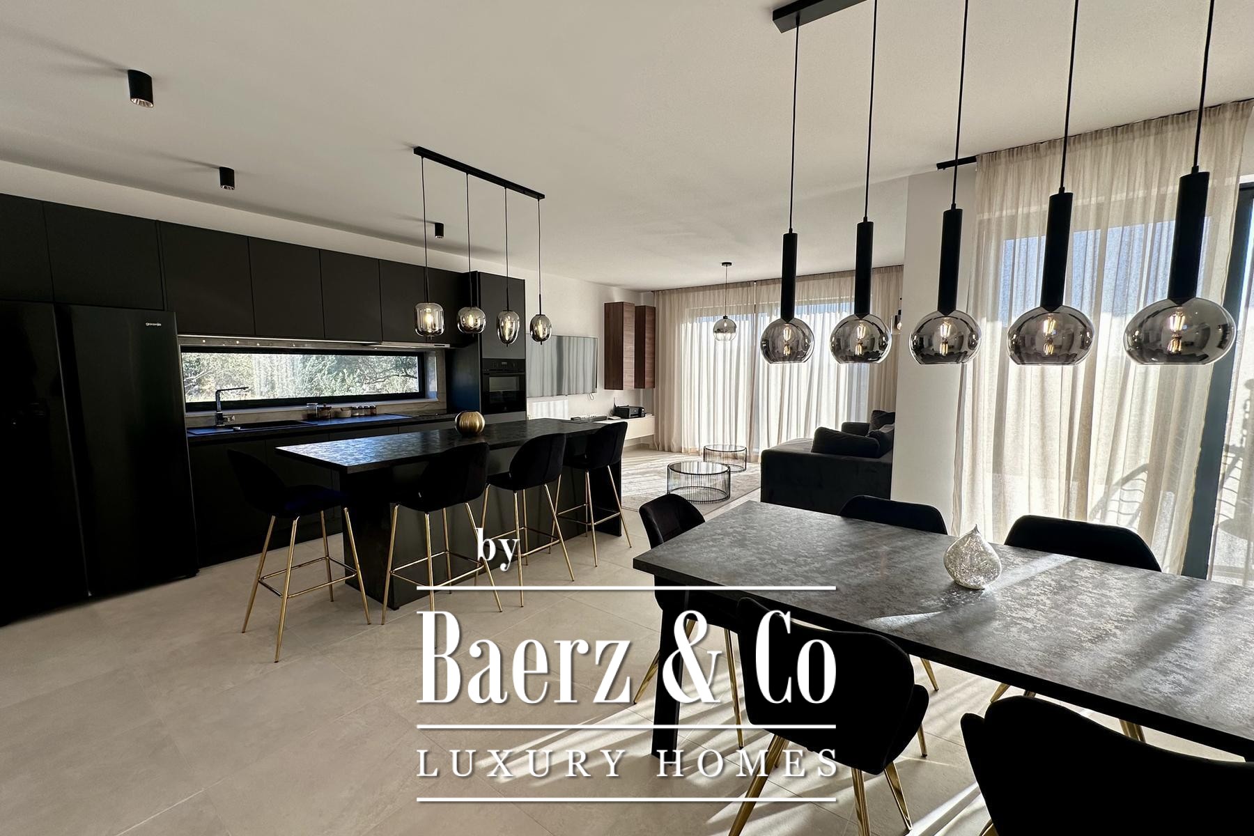 Via de interne trap bereikt u de eerste verdieping, waar twee extra slaapkamers met elk een eigen badkamer toegang bieden tot balkons, zodat het daglicht zich in de volledige woning verspreidt en het uitzicht wordt versterkt. Designermeubilair en een A++ energielabel onderstrepen de hoge ecologische standaard. De aangelegde tuin biedt ruimte voor een extra gebouw van 50 m², wat toekomstige uitbreidingsmogelijkheden creëert.